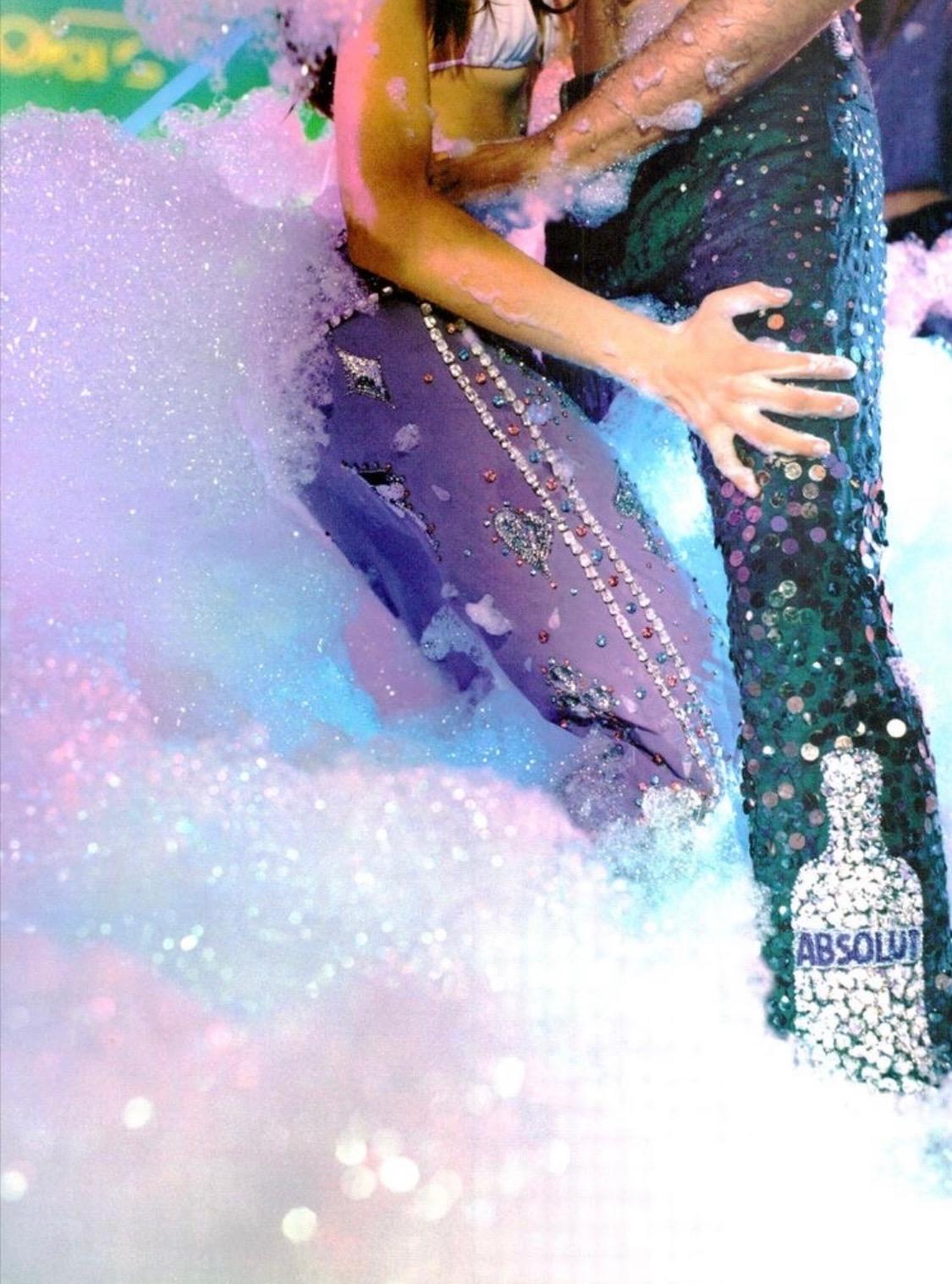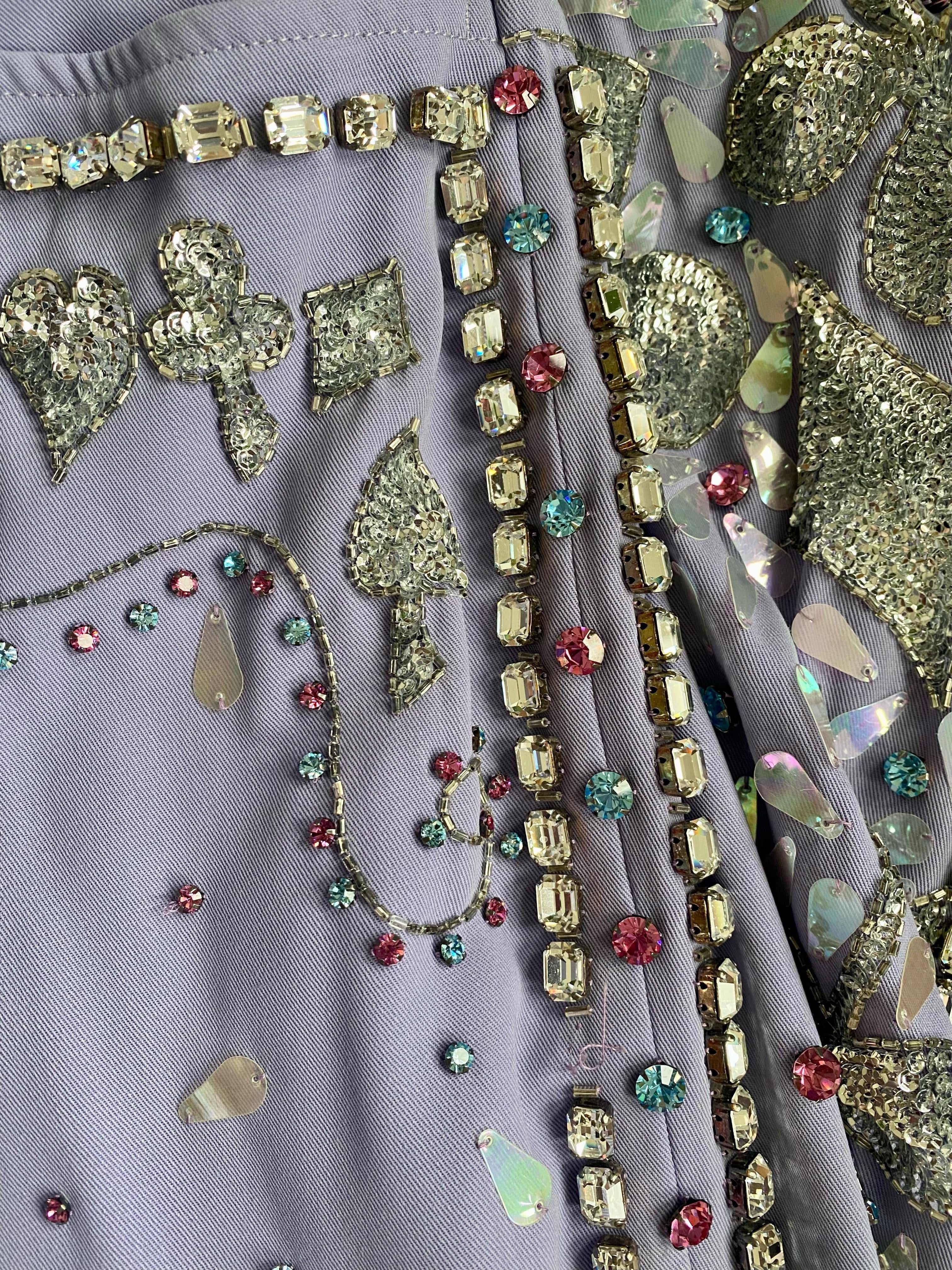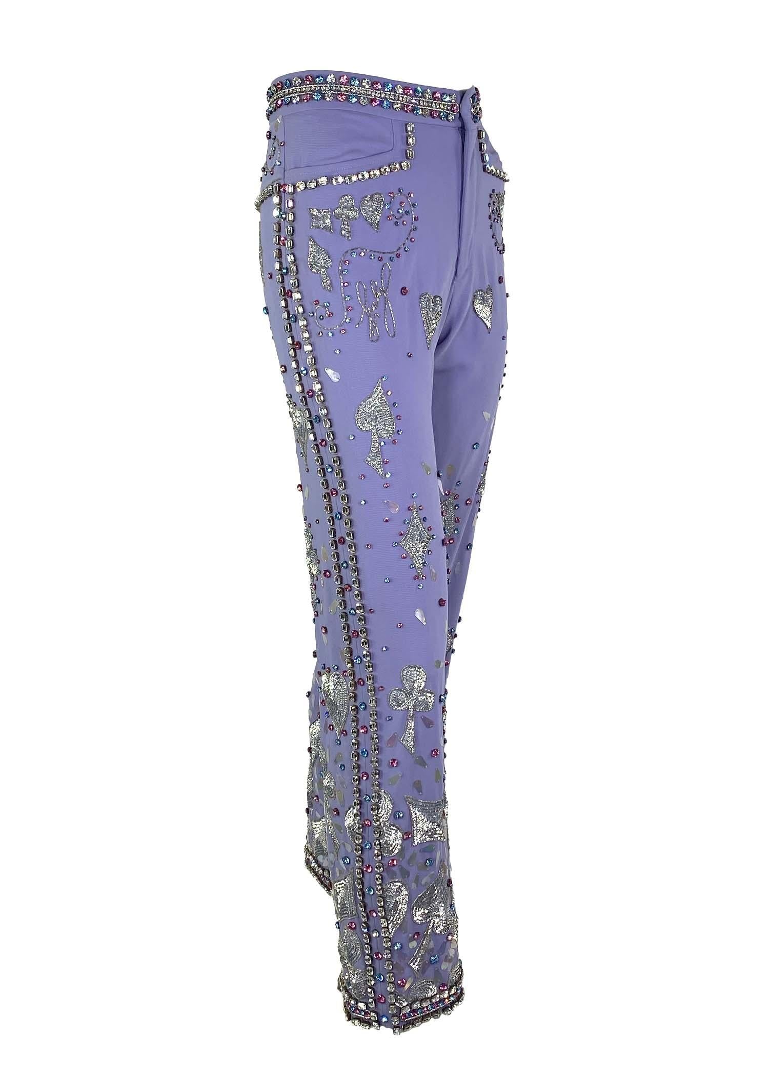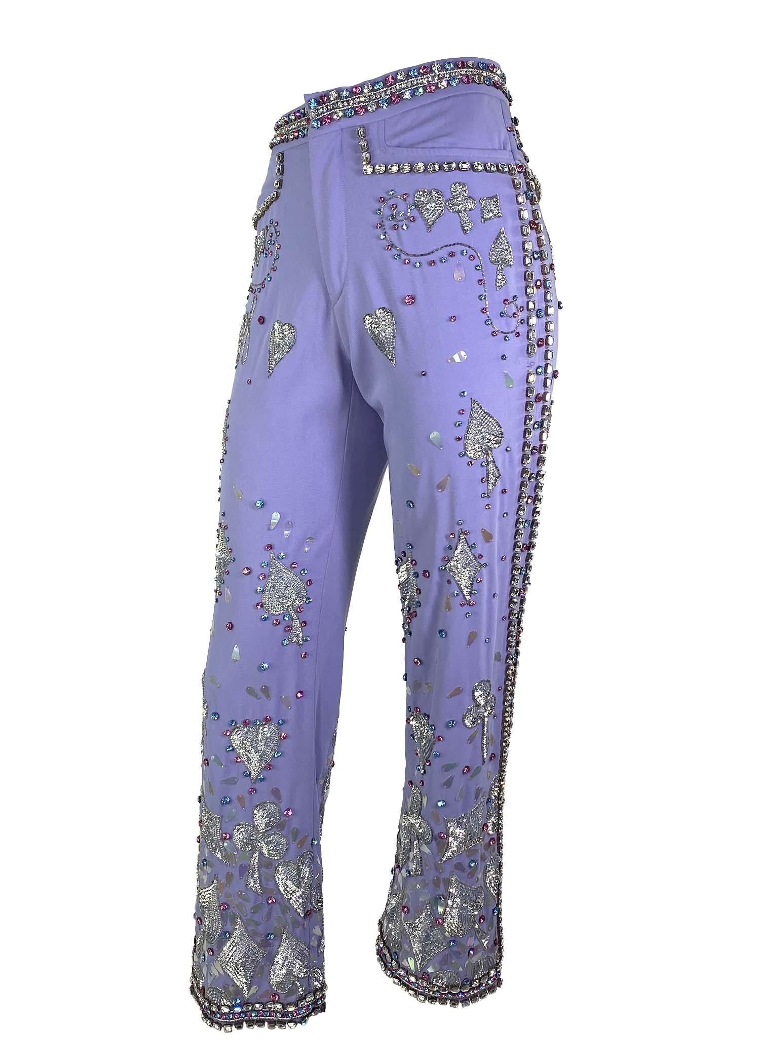 Presenting an unbelievable pair of rhinestone embellished lavender wool pants from Tom Ford's famous 'Las Vegas hippy' collection with Gucci. Most famously worn by Madonna to the 1999 Grammys, where she opened the show and left with four awards, and by Mariah Carey in a 1999 photoshoot. The Spring/Summer 1999 collection is remembered for its drastic departure from Tom Ford's signature sleek minimalism. Ford wanted a challenge after the success of his earlier collections for Gucci. Colorful, exaggerated floral prints and heavy beading served as an exercise in maximalism that stayed true to Gucci's design staples and Ford's reputation for selling sexy. These pants debuted as look number 33 on Danielle Zinaich and in the ad campaign on Jacquetta Wheeler, shot by Mario Testino-part of the iconic Absolut Gucci ad campaign produced by Tom Ford and Absolut Vodka. Testino also shot this campaign in a foam-filled Paris club and only ran in American, Italian, and British Vogue. Shalom Harlow also wore it on the February 1999 cover of Marie Claire Germany. Fit for a museum, this pair of trousers is a collector's dream that is sure to stand out.