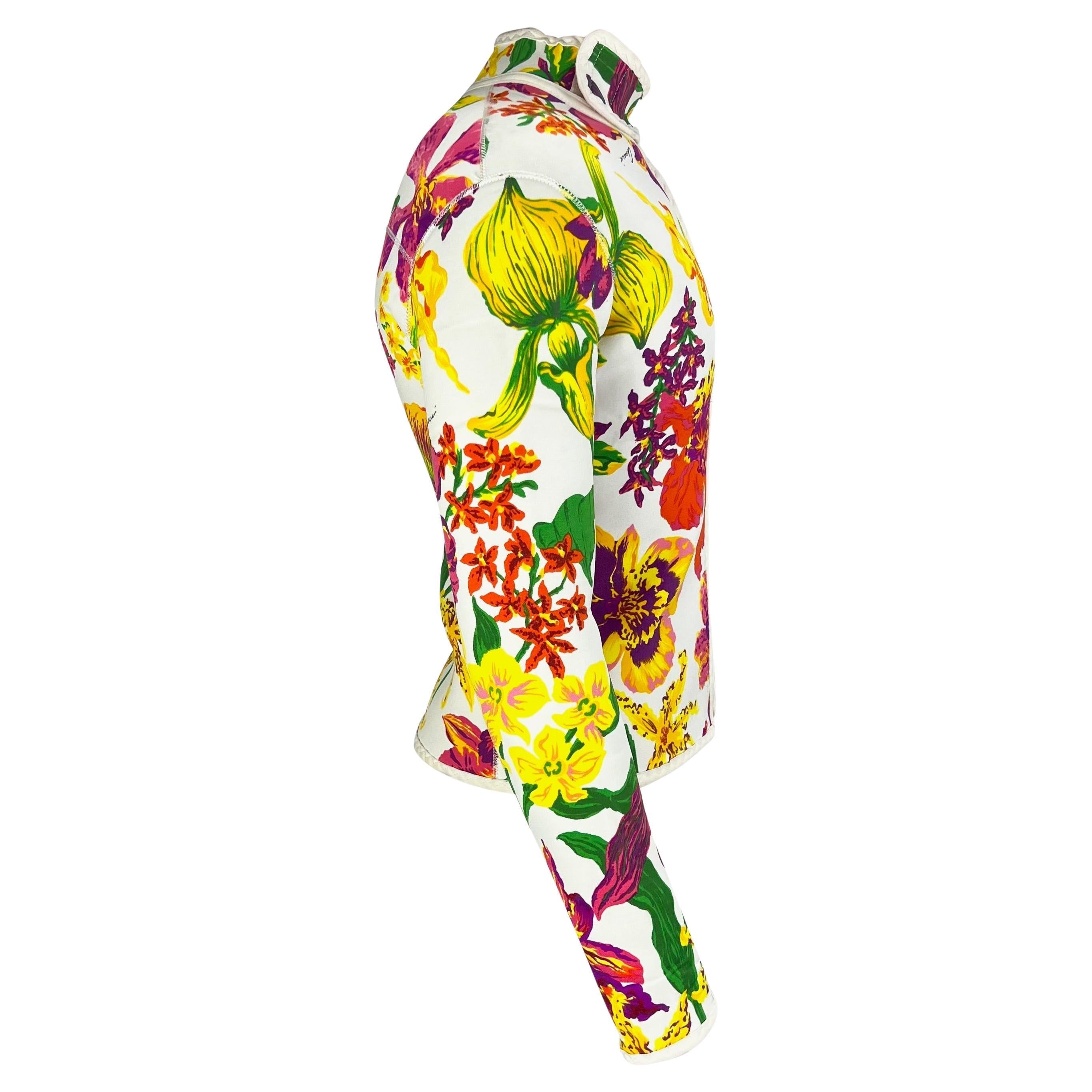 Presenting an incredibly rare neoprene scuba jacket designed by Tom Ford for Gucci's Spring/Summer 1999 menswear collection. Debuting on the runway, this stunning piece of fashion history was also featured in the season's ad campaign, shot by Mario Testino. Images of bright flora stand out on the white neoprene background, peppered with the Gucci signature and the zip and velcro closures reveal a hot pink neoprene lining. Add this exceptional piece Tom Ford Gucci find to your wardrobe or collection! Check out more menswear and womenswear pieces from Ford's "Las Vegas Hippy" collection on our storefront!