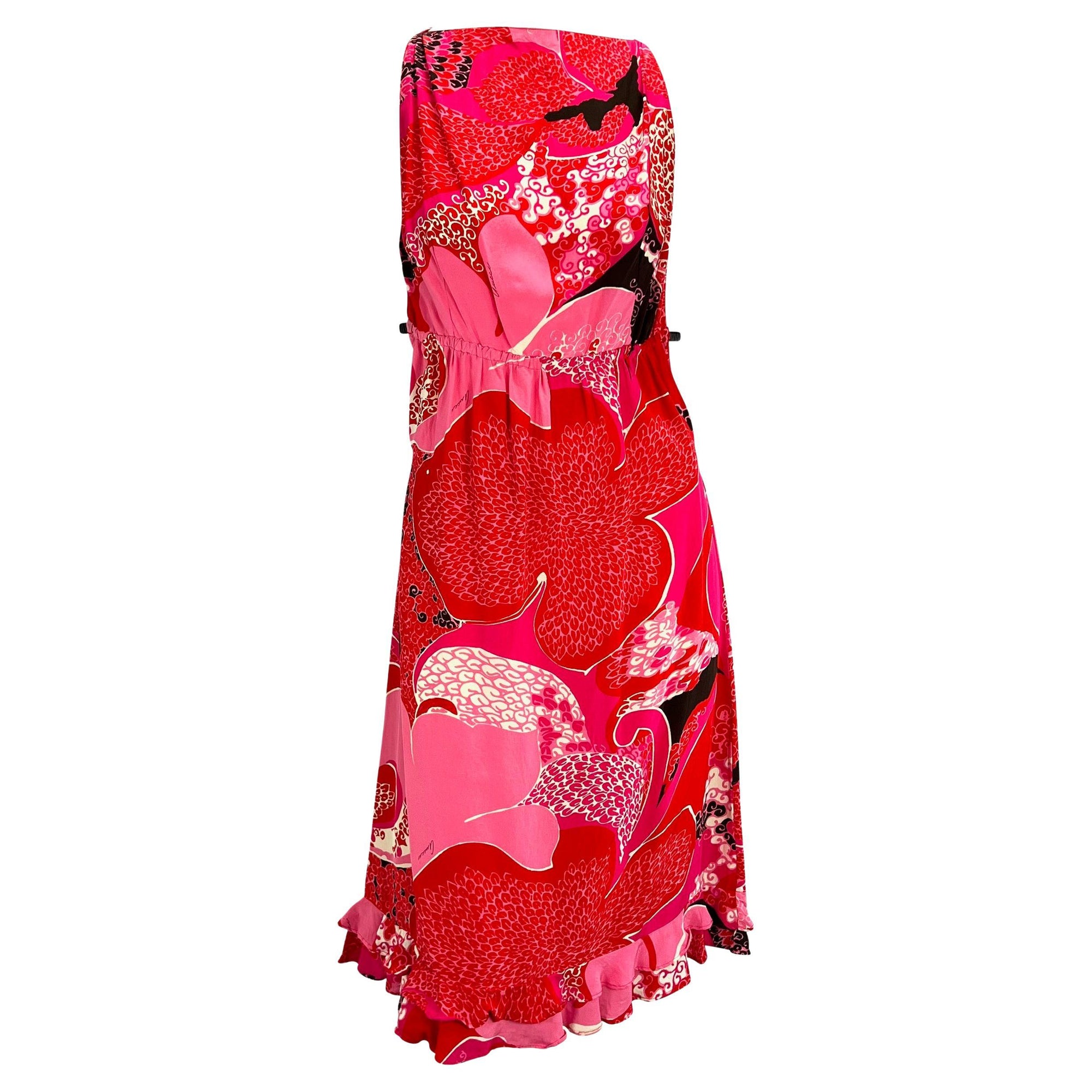 This Gucci floral dress from the Spring/Summer 1999 collection, designed by Tom Ford, debuted on the runway as look 9, modeled by Maggie Rizer. The dress showcases Ford’s bold red and pink “acid flower” print, a recurring motif throughout the season. It features open sides connected by leather straps and is finished with a ruffled hem. The design appeared in a February 1999 Vogue campaign photographed by Mario Testino, in Dutch Magazine on Emily Sandberg, and was later reissued through the Gucci Vault. The Spring/Summer 1999 collection marked a striking departure from Ford’s signature sleek minimalism, embracing colorful, exaggerated florals and ornate detailing as an exercise in maximalism that still reflected Gucci’s sensual aesthetic.