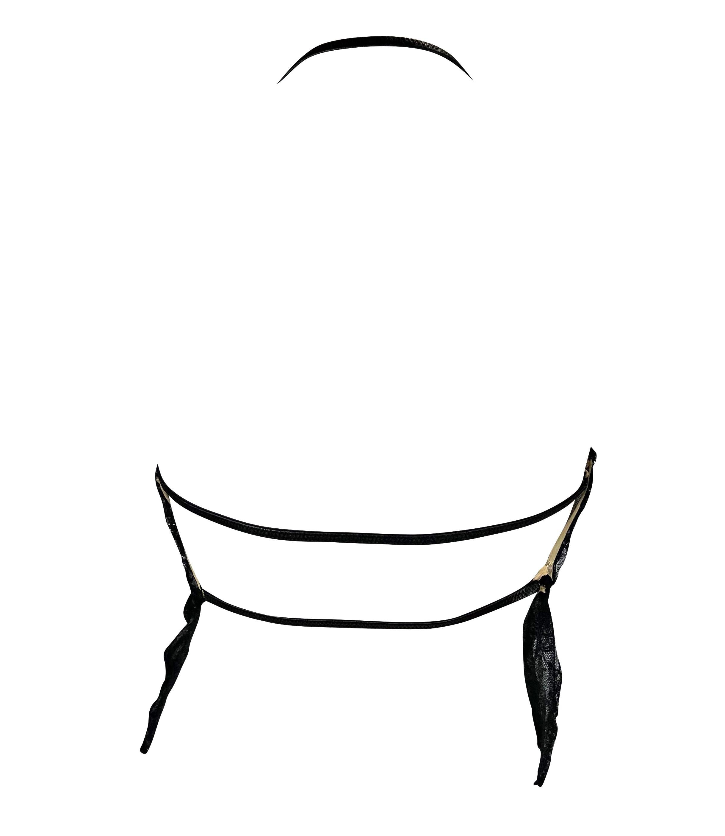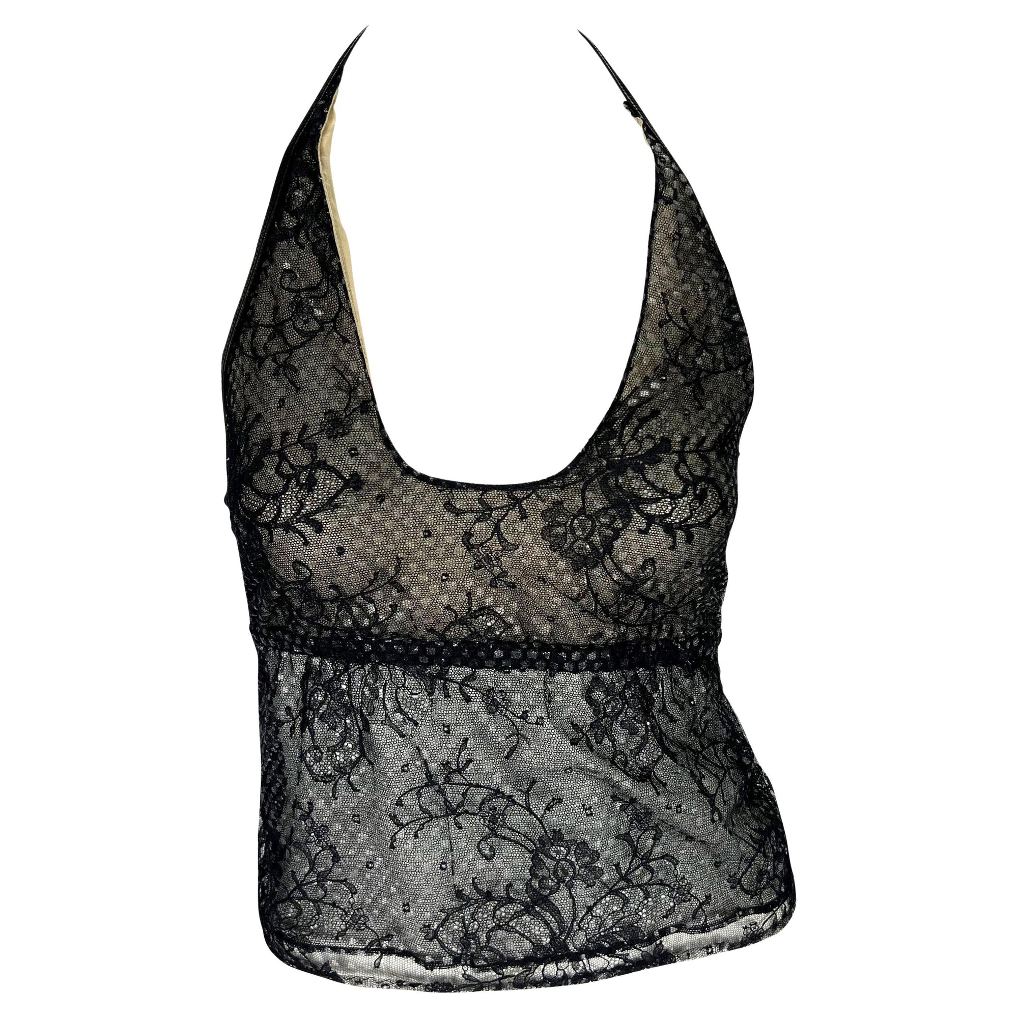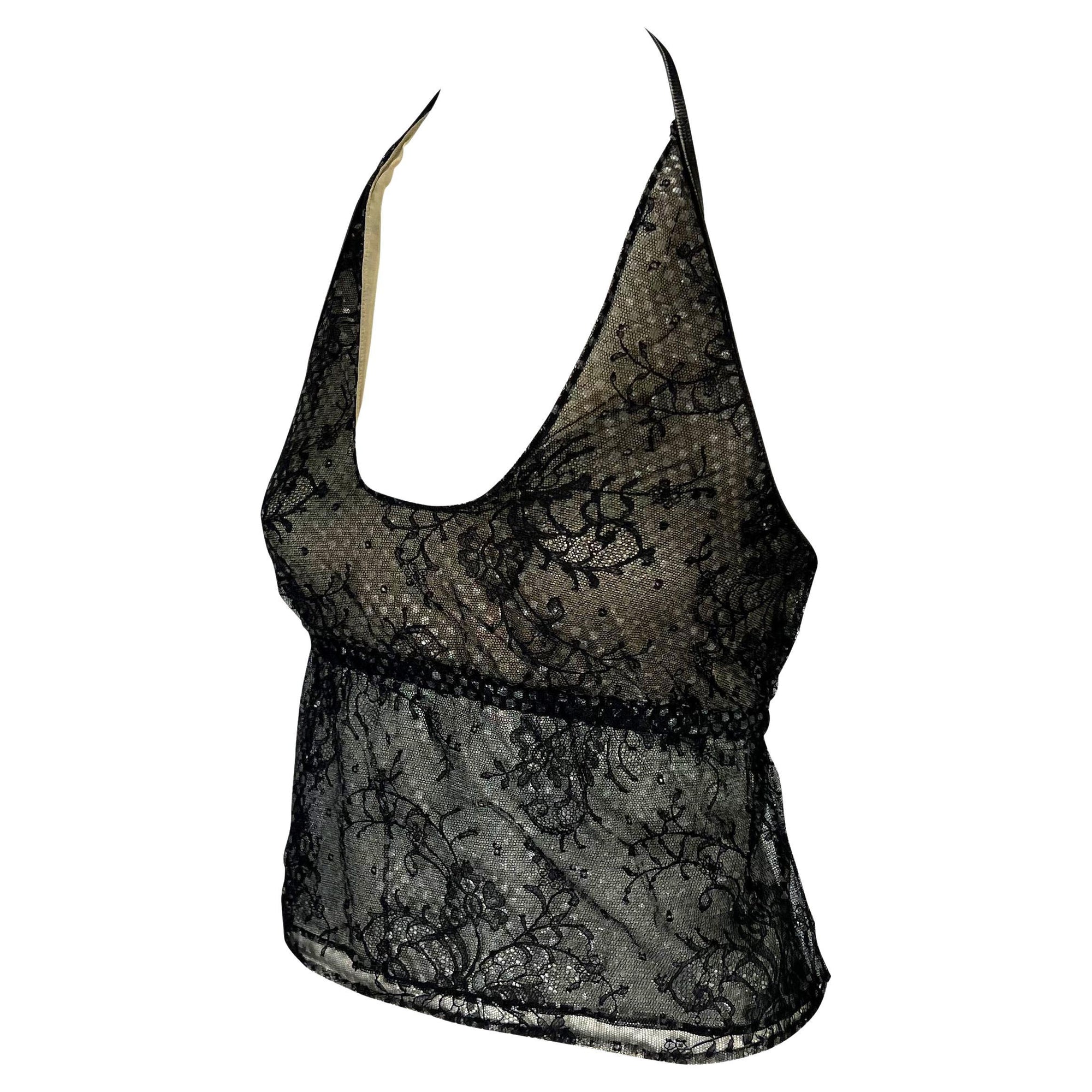 This black lace halter neck crop top from Gucci’s Spring/Summer 1999 “Las Vegas Hippies” collection, designed by Tom Ford, debuted on the runway as Look 37, modeled by Kiara Kabukuru. The layered lace design is embellished with reflective paillettes, creating a subtle shimmer. A low neckline and elastic under-bust band define the front, while a leather halter neck strap and two additional leather ties secure the garment, leaving the back nearly bare. A rare runway piece, it exemplifies Tom Ford’s provocative and glamorous vision for Gucci at the turn of the millennium.