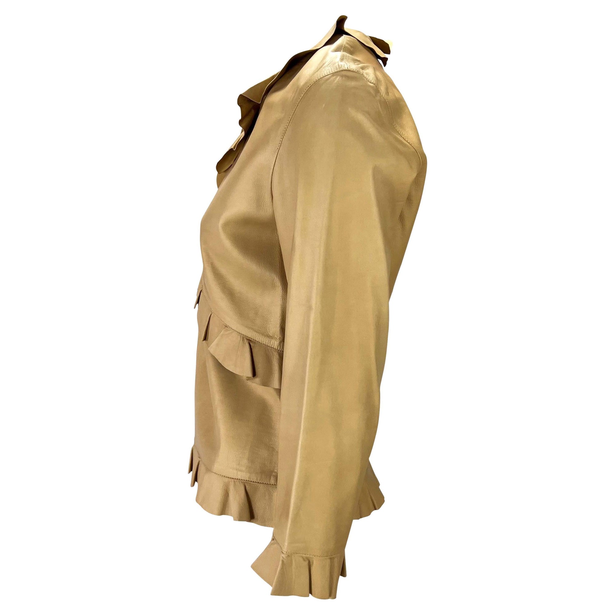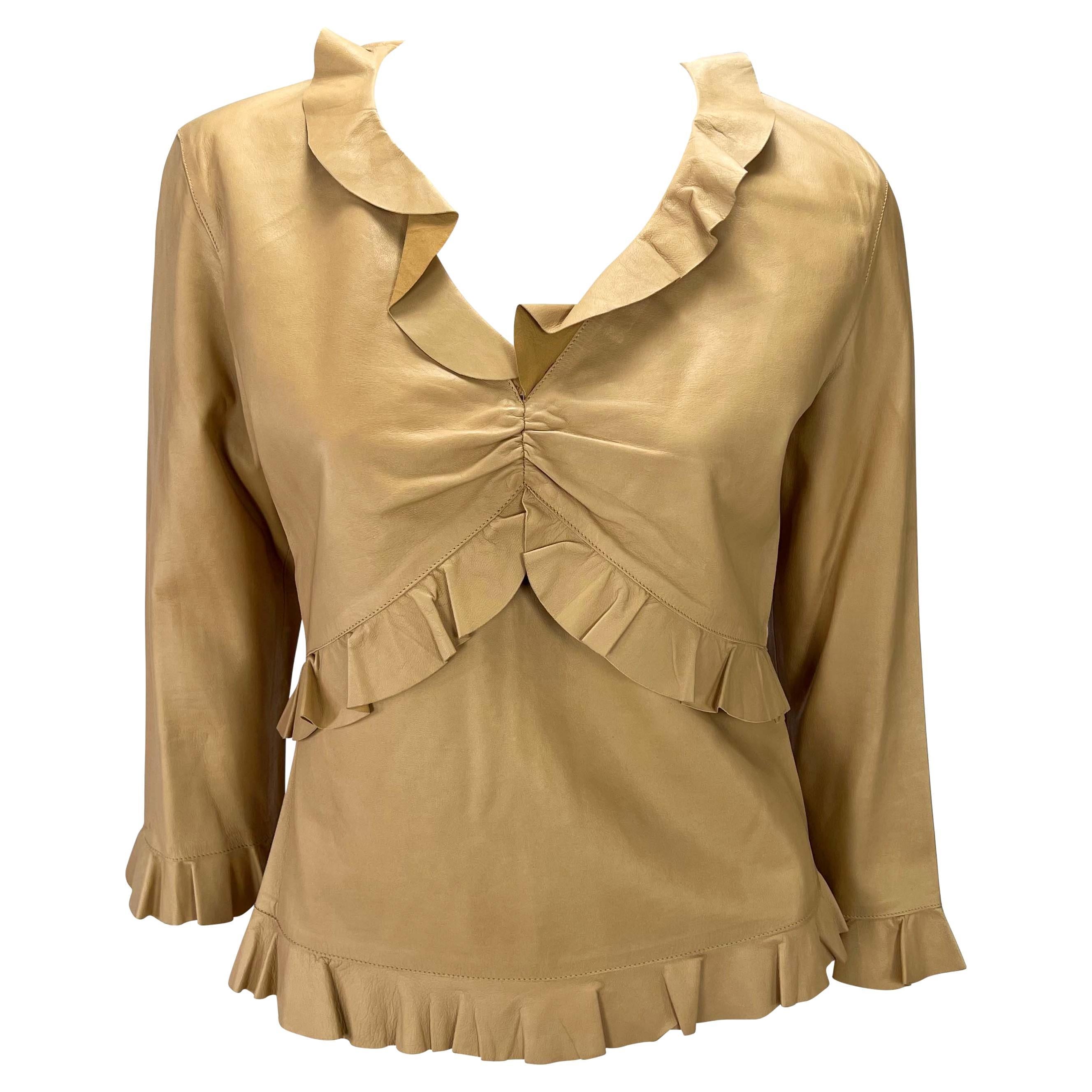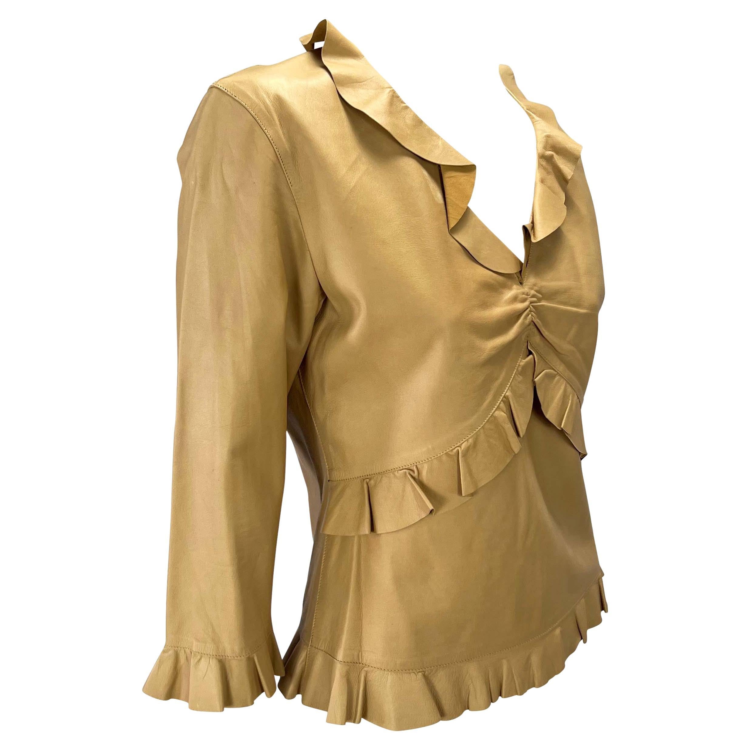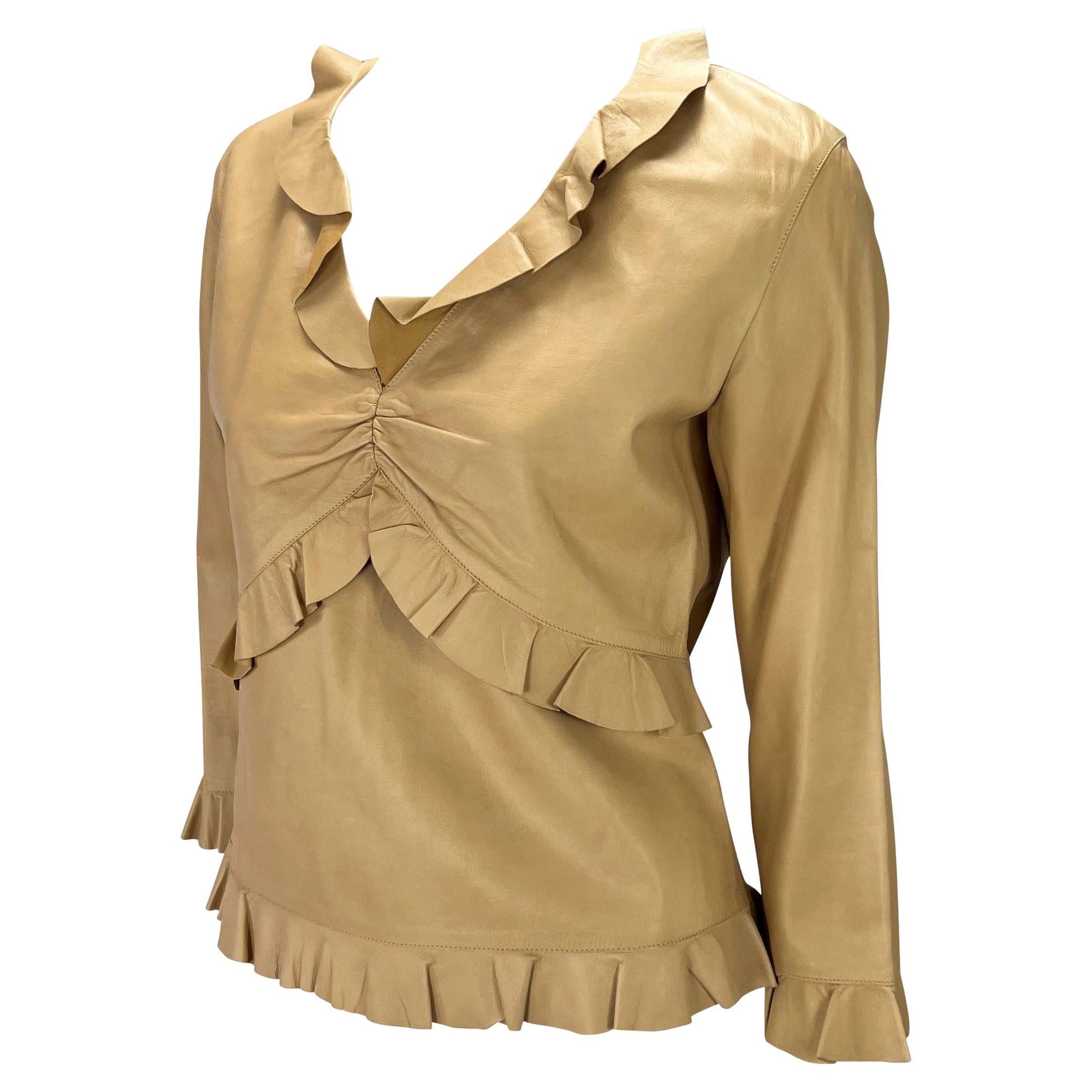 Presenting a saddle-colored leather ruffled Gucci top, designed by Tom Ford. From the Spring/Summer 1999 collection, fabric versions of this top debuted on the season's runway. This incredible top is constructed entirely of soft lightweight leather in saddle color. The shirt features cropped sleeves, a v-neckline, and ruching at the bust. Made complete with ruffle details at the neckline, waist, hem, and cuffs this late 1990s top is the perfect addition to any Tom Ford Gucci lover's wardrobe.