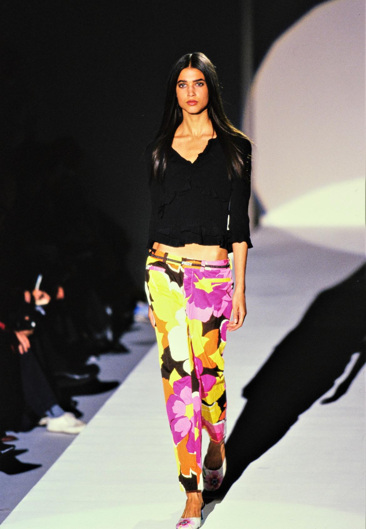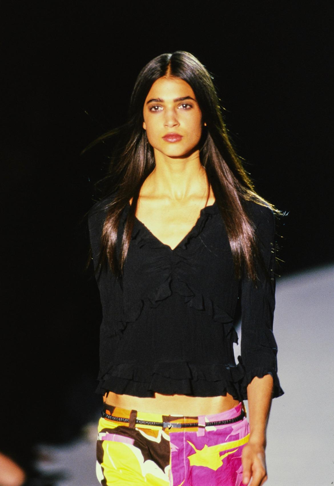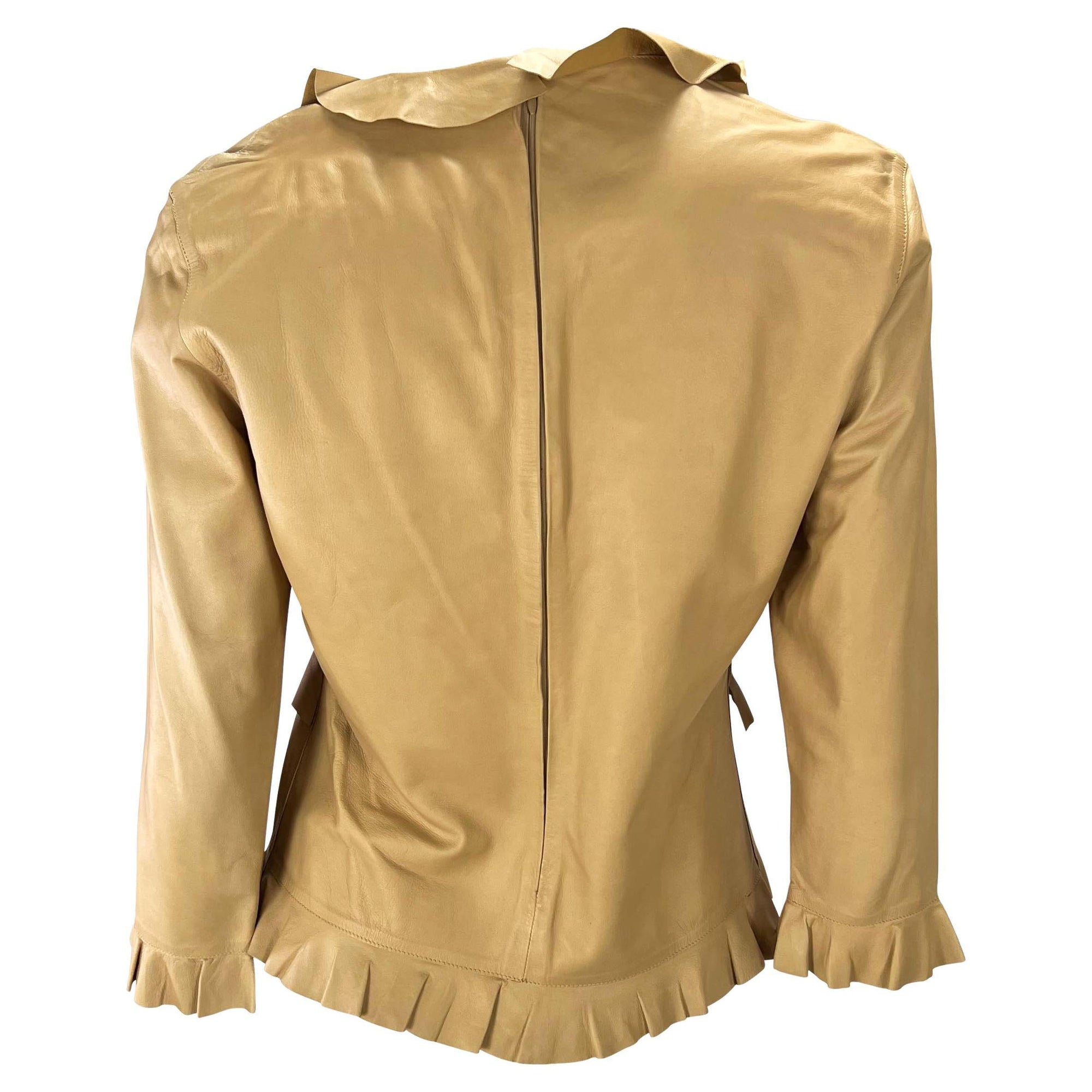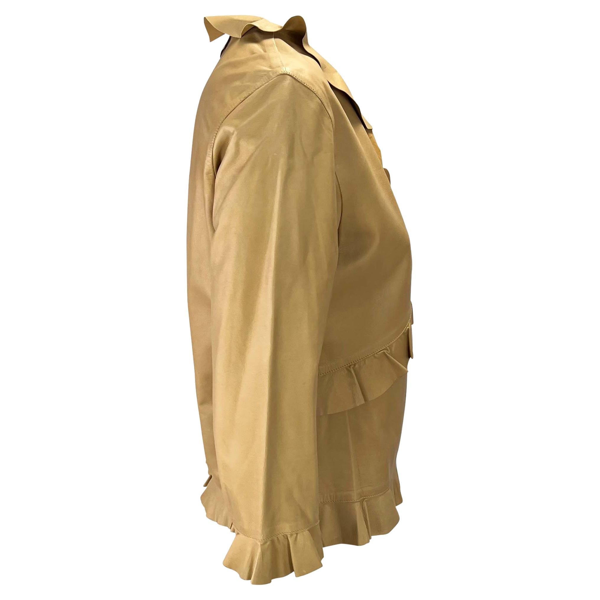 Presenting a saddle-colored leather ruffled Gucci top, designed by Tom Ford. From the Spring/Summer 1999 collection, fabric versions of this top debuted on the season's runway. This incredible top is constructed entirely of soft lightweight leather in saddle color. The shirt features cropped sleeves, a v-neckline, and ruching at the bust. Made complete with ruffle details at the neckline, waist, hem, and cuffs this late 1990s top is the perfect addition to any Tom Ford Gucci lover's wardrobe.