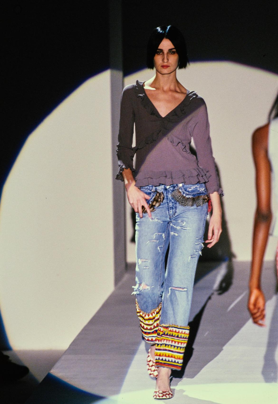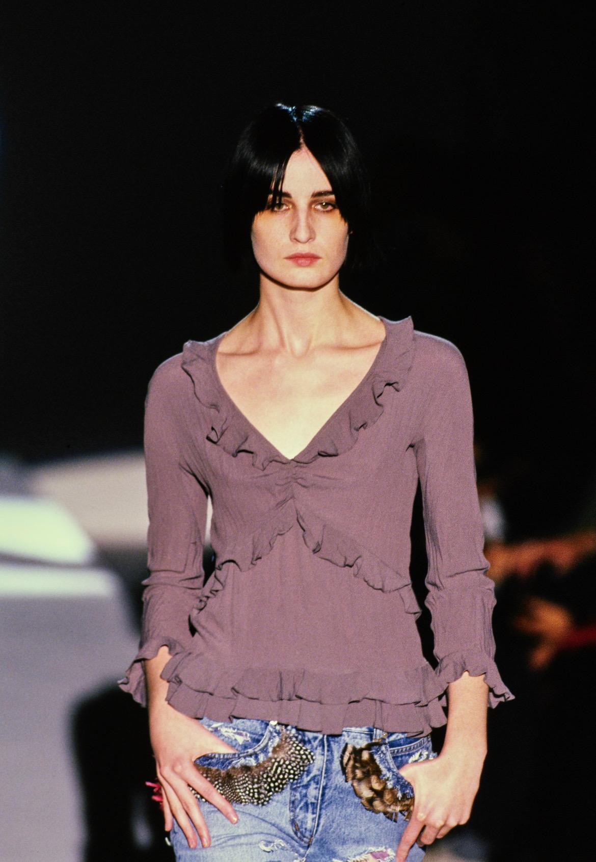 S/S 1999 Gucci by Tom Ford Saddle Brown Ruffle Leather V-Neck Blouse