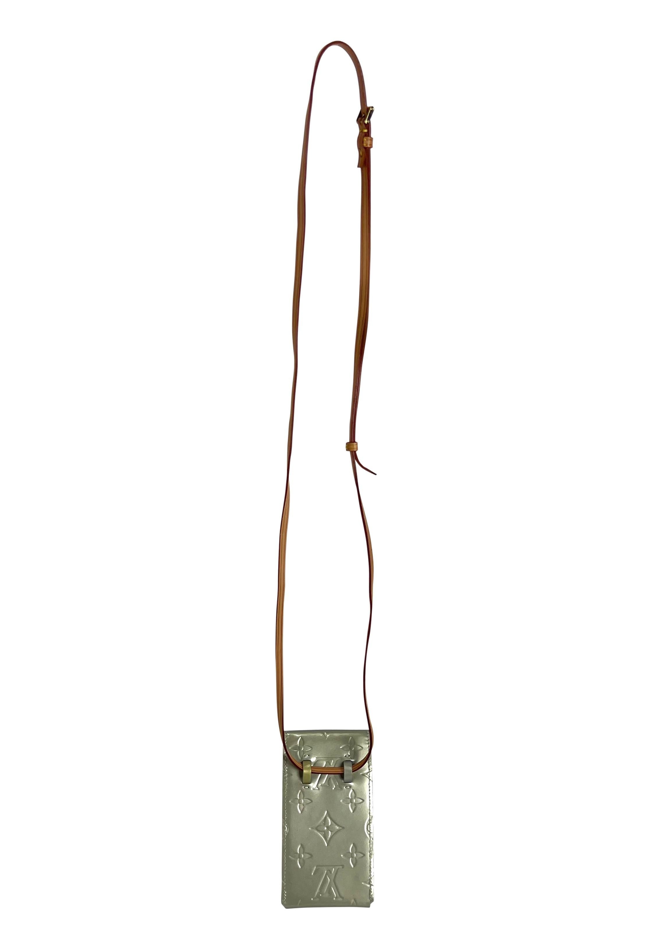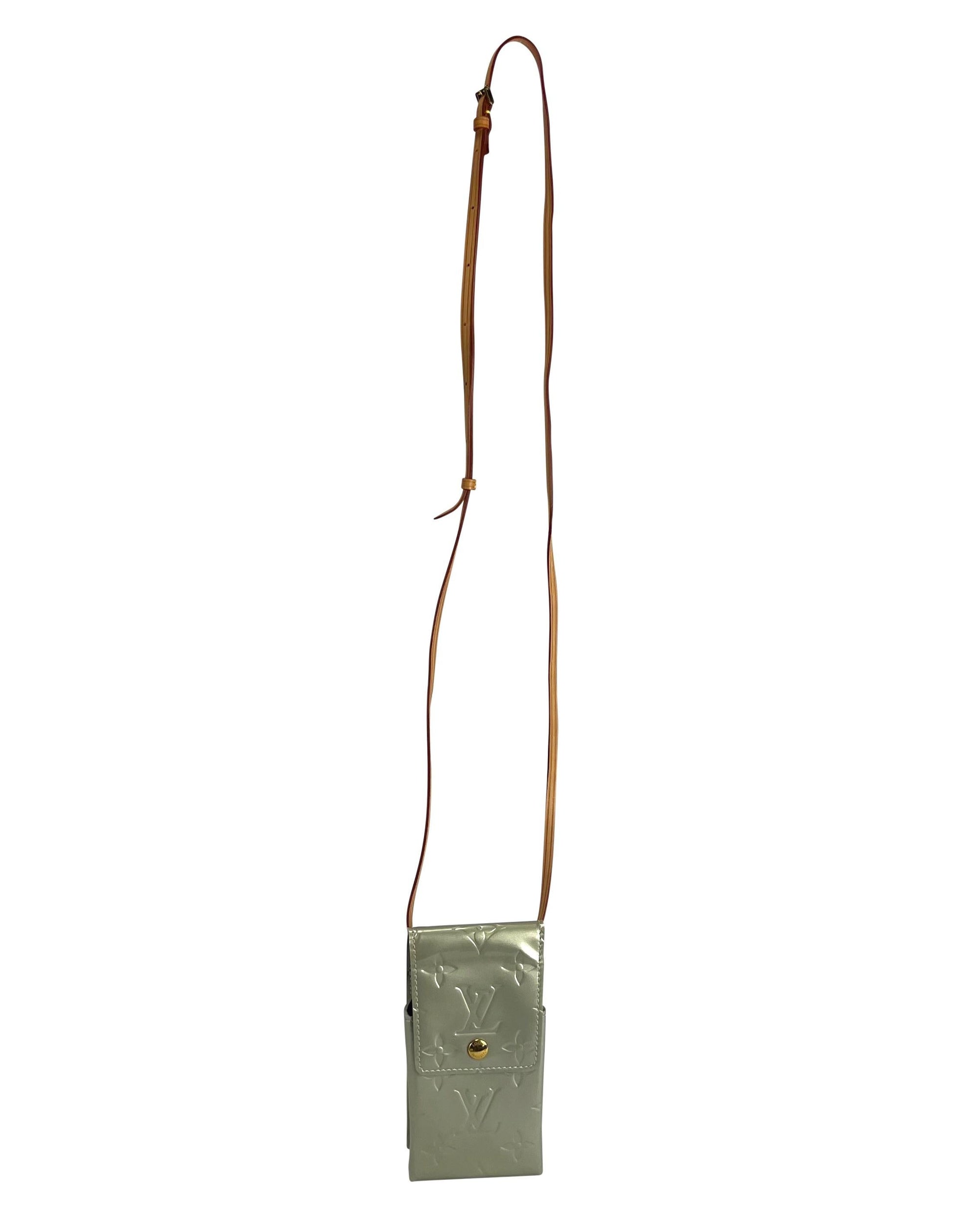 Presenting a fabulous mint green Louis Vuitton Vernis phone holder bag. From the Spring/Summer 1999 collection by Marc Jacobs, this fantastic mini bag is constructed of mint green patent leather embossed with the famous LV print and is made complete with an adjustable leather strap. Multiple variations of this chic mini bag debuted on the season's runway! This versatile bag was created as a clutch, crossbody, or waist bag.
