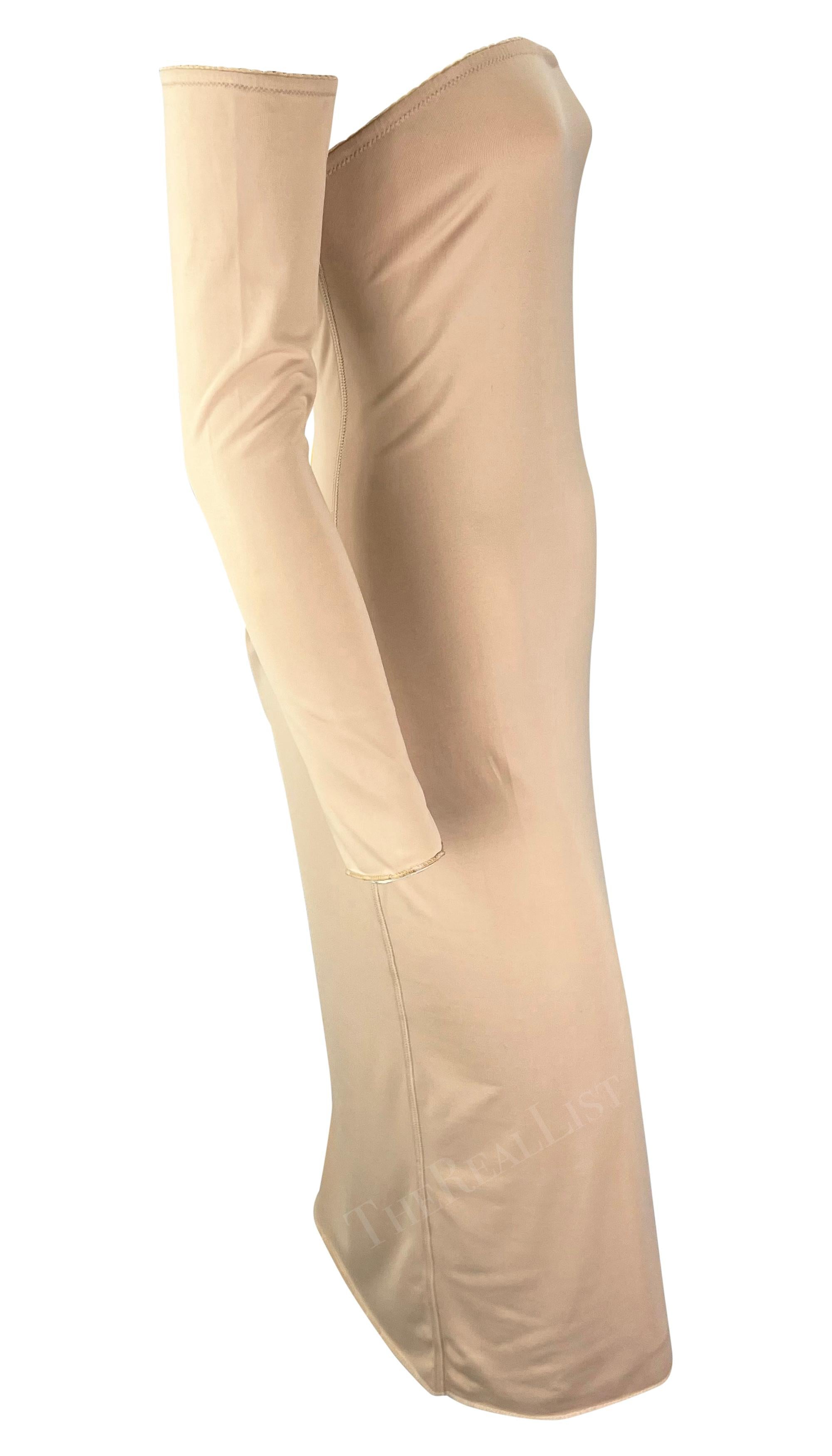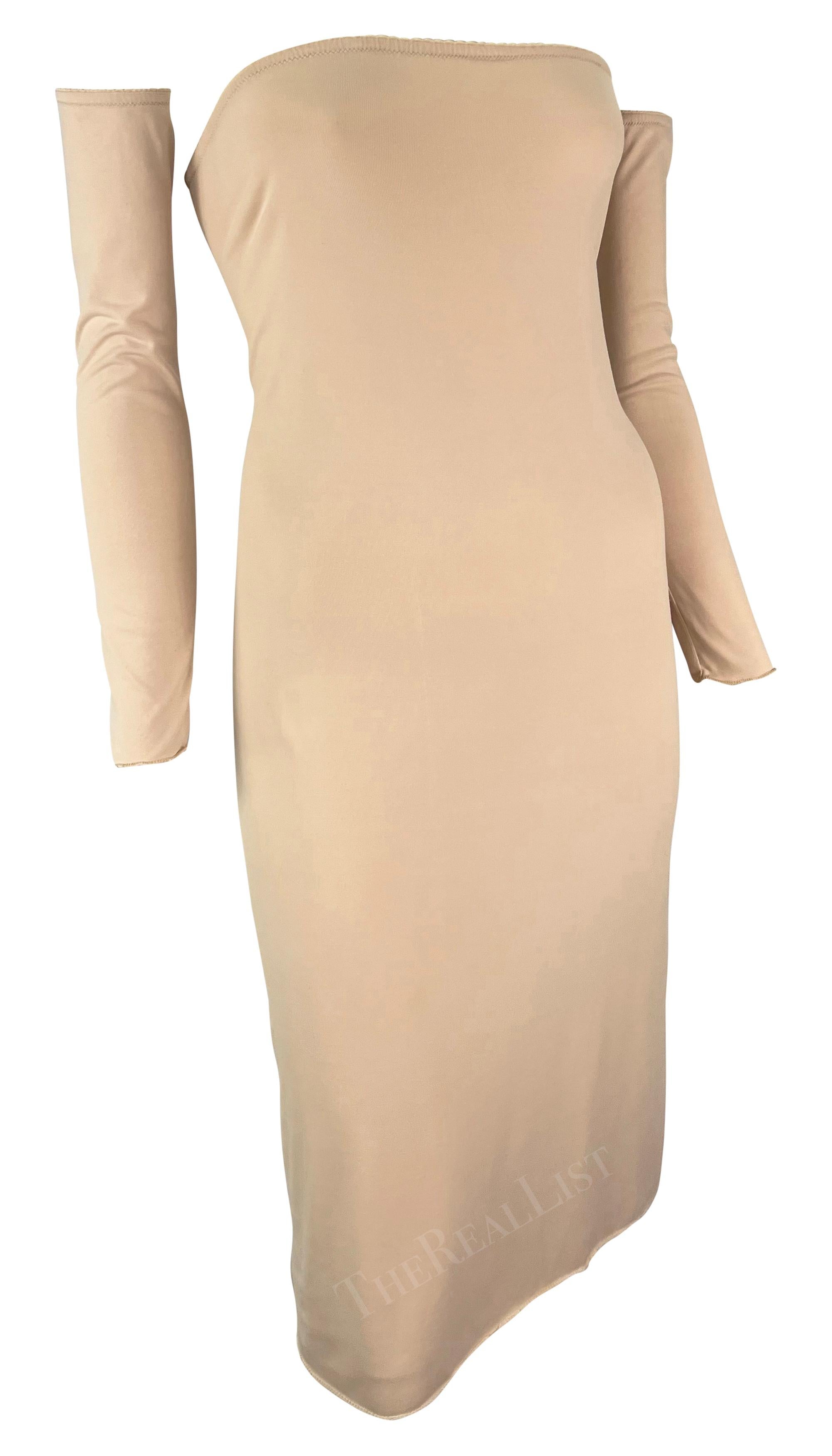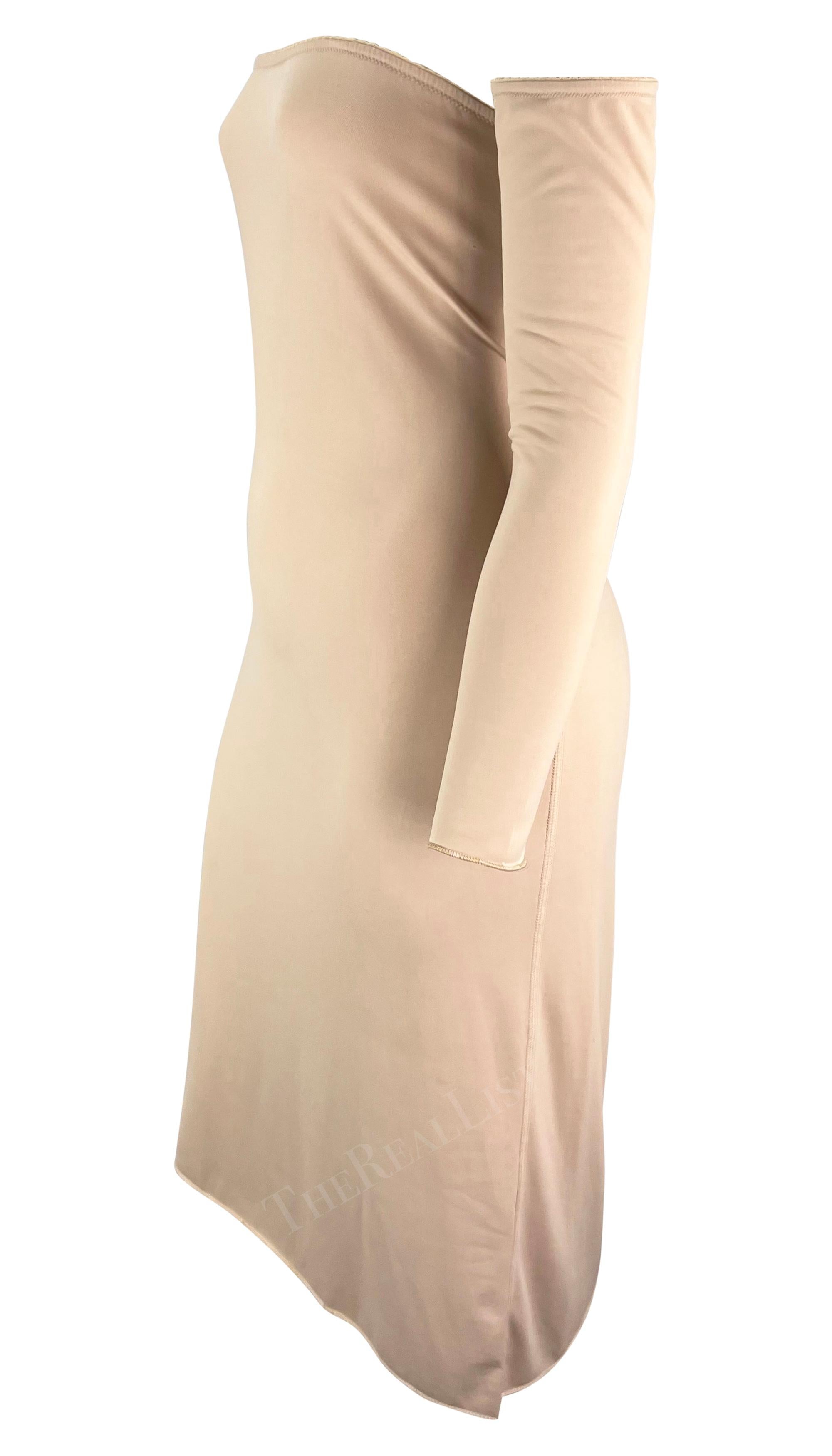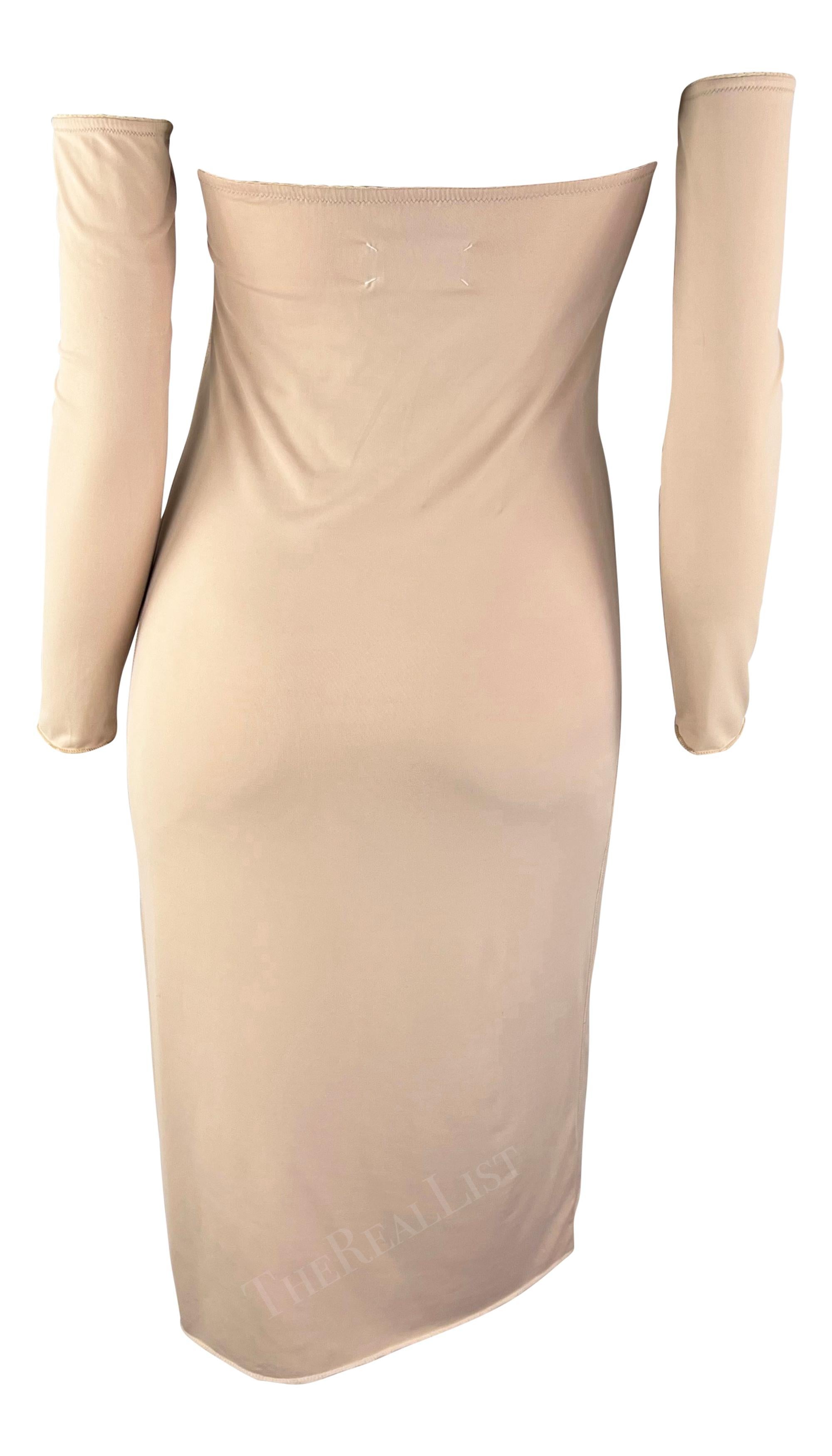 This Spring/Summer 1999 Maison Martin Margiela beige stretch slip dress features a tube silhouette with detached arm sleeves. Crafted from lightweight stretch fabric in a versatile beige tone, it embodies Margiela's iconic minimal deconstructionist approach.