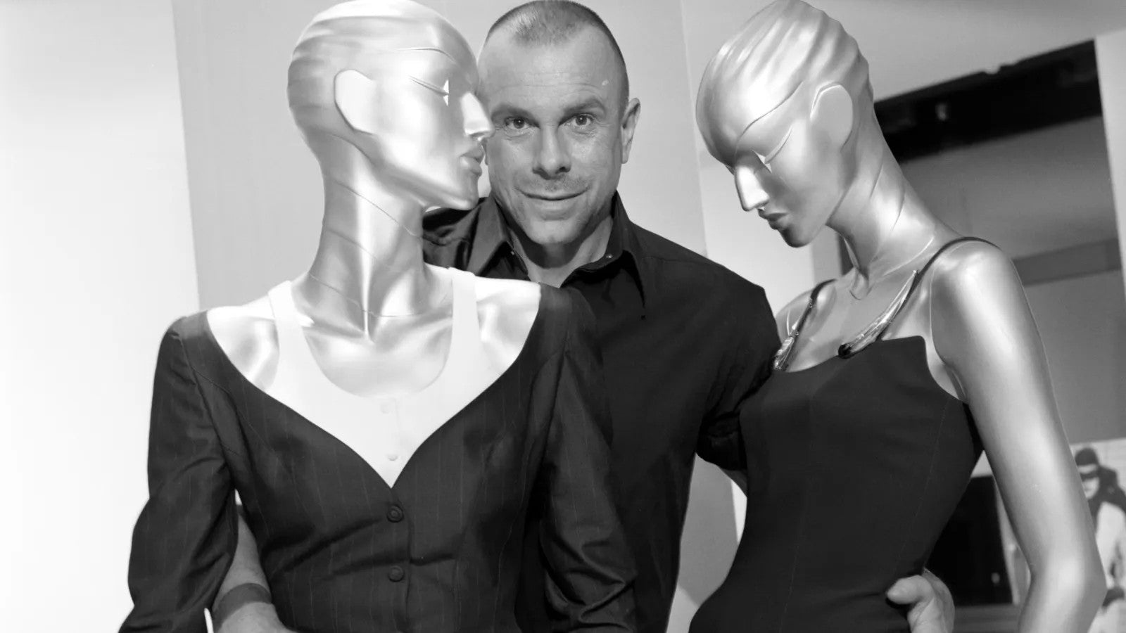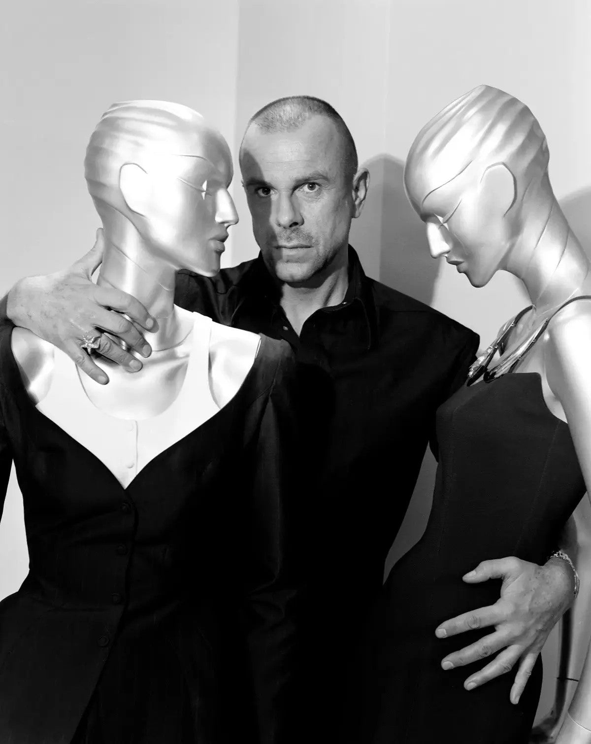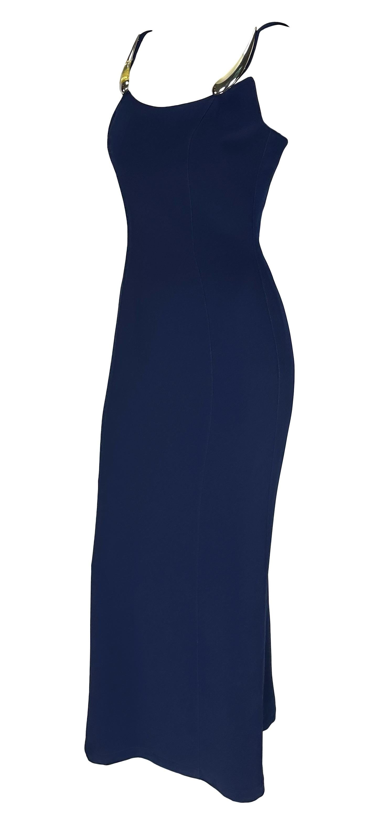 Presenting a fabulous navy Thierry Mugler gown designed by Manfred Mugler. This beautiful dress debuted from the Spring/Summer 1999 collection on the season's runway. The gown features thin straps, a wide scoop neckline, and a slit at one side, and is made complete with chrome and lucite details where the straps meet the bust. Mugler posed with one of these stunning dresses for a photo shoot in his NYC showroom 1998. Add this spectacular Thierry Mugler runway gown to your wardrobe!
