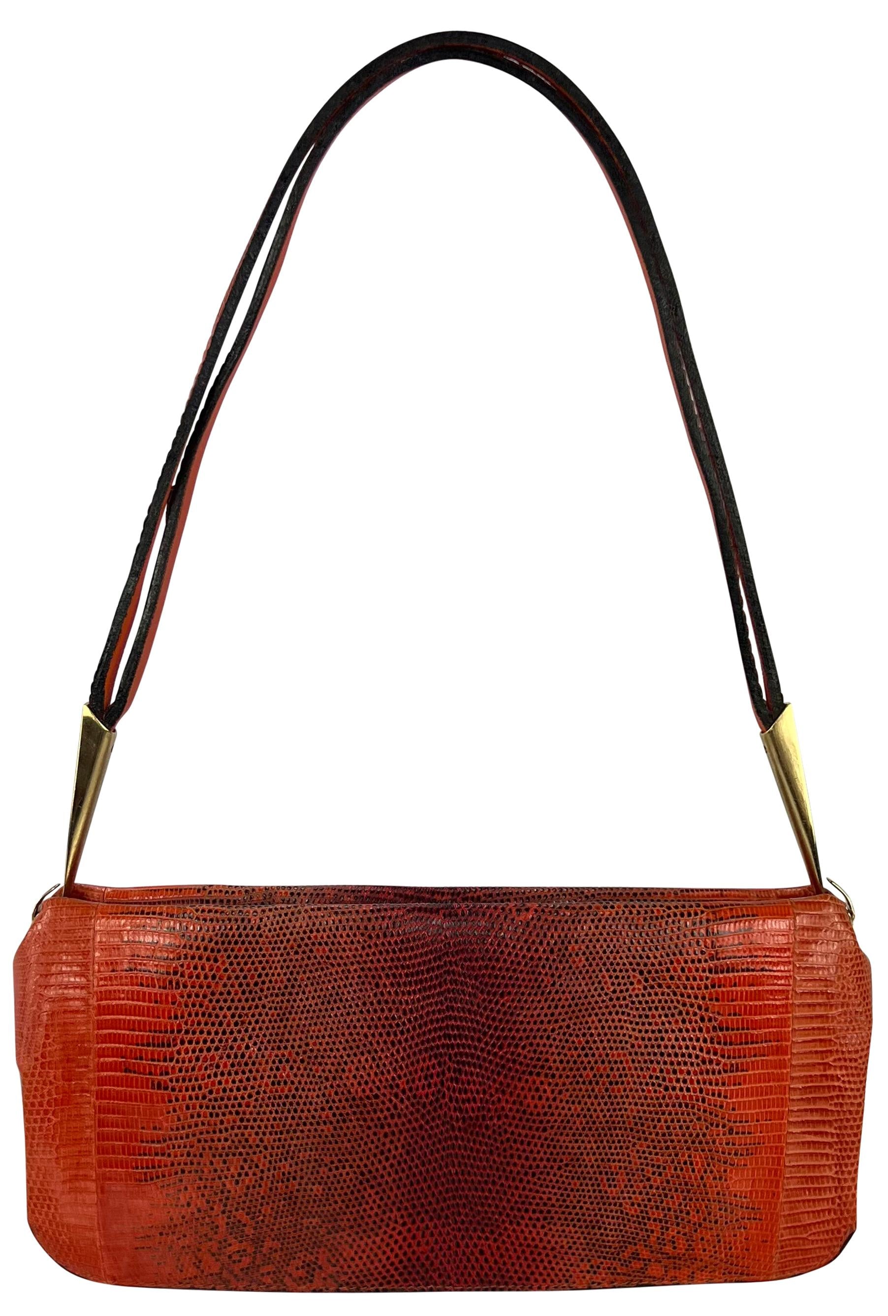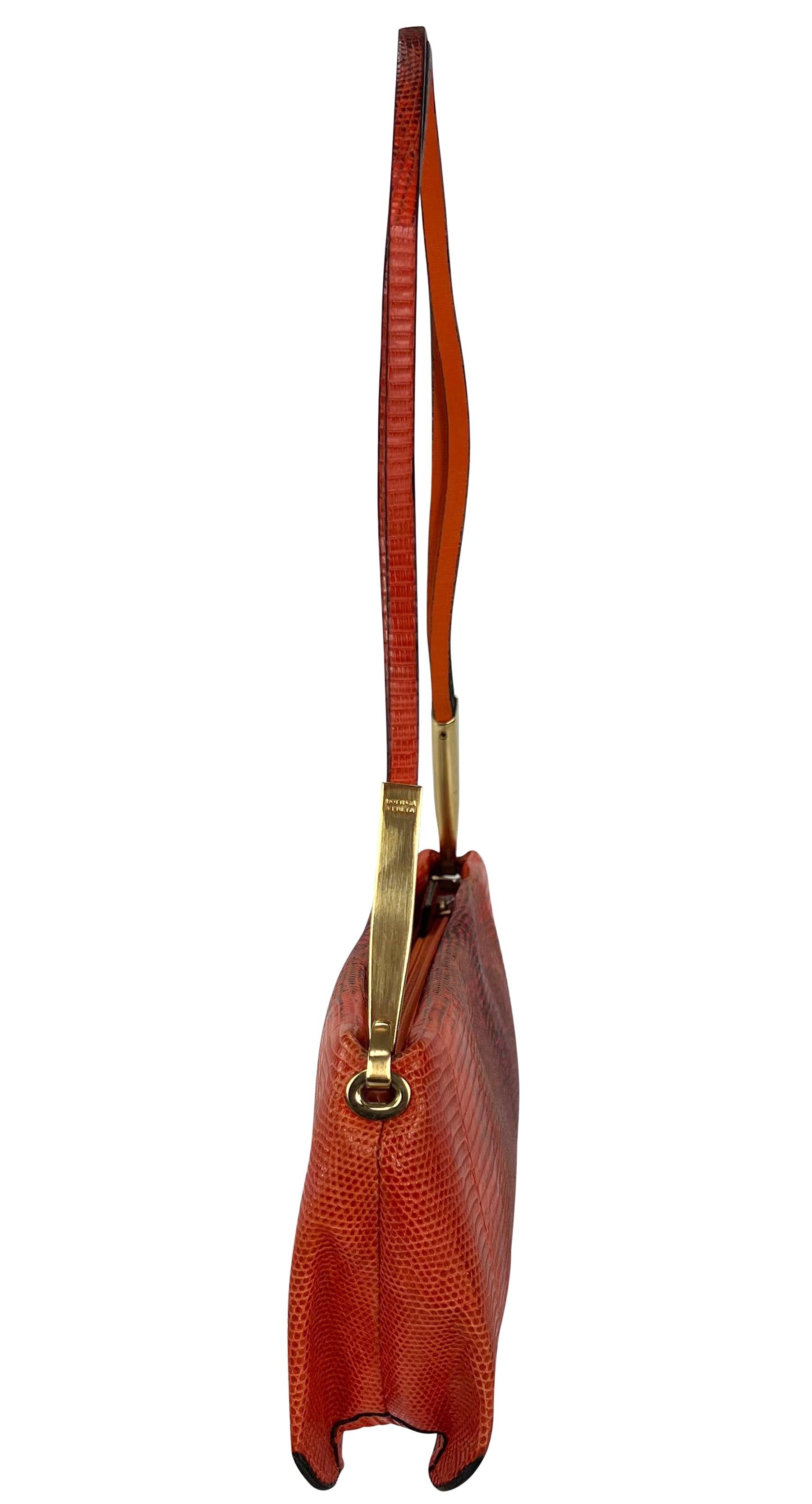 From the Bottega Veneta Spring/Summer 2000 collection, a variation of this vibrant orange lizard skin bag debuted on the season's runway, modeled by Alek Wek. Another variation appeared in the season's ad campaign on Collette Pechekhonova, captured by Vincent Peters. This gorgeous shoulder bag is constructed entirely of genuine monitor ring lizard skin and features gold-tone hardware at the base of the strap. This chic small shoulder bag is an easy way to elevate any outfit.