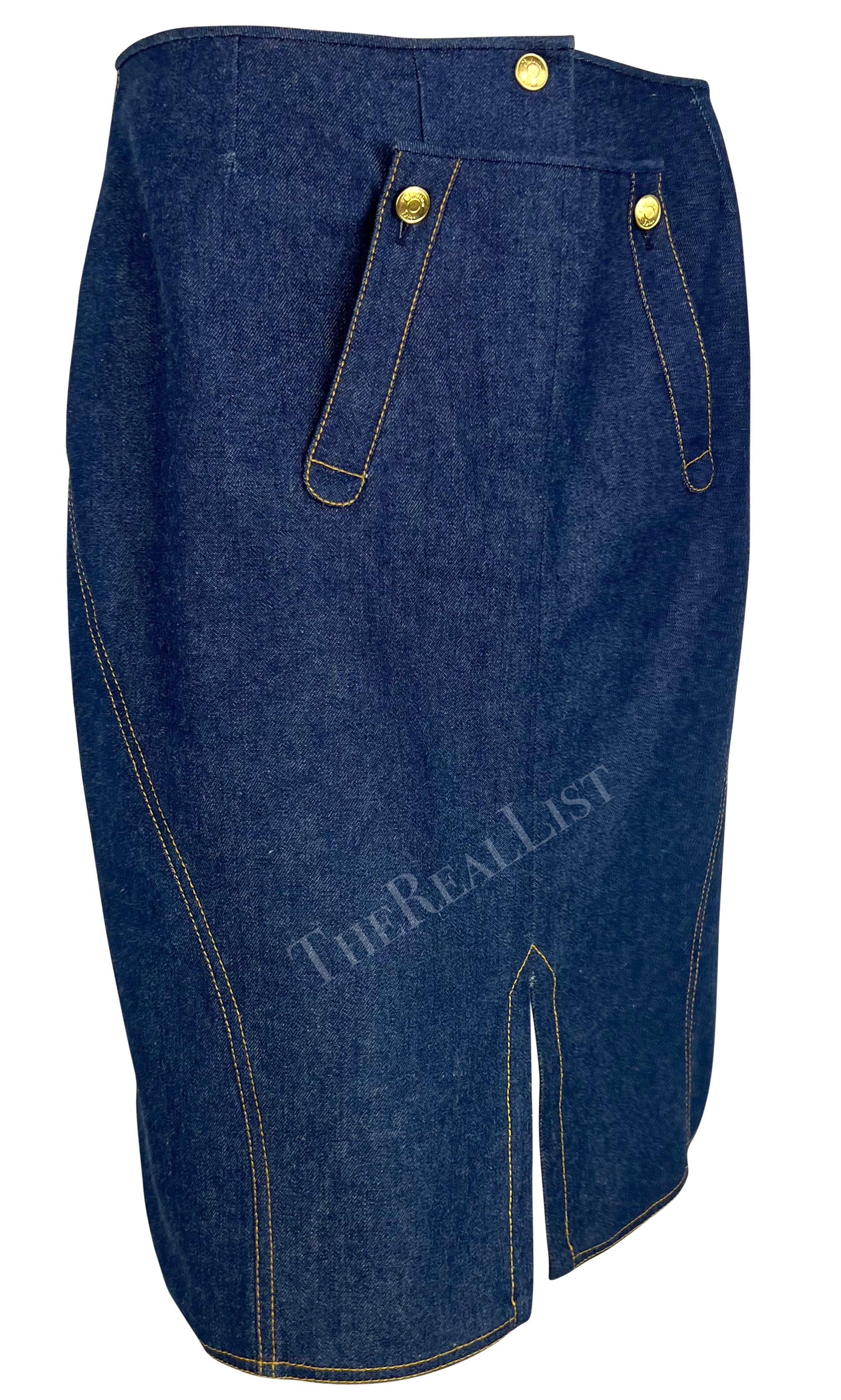 This Spring/Summer 2000 Christian Dior by John Galliano blue denim pencil skirt features a front slit, gold-tone snap buttons, and front pockets. A stylish and versatile piece, it captures Galliano's bold take on casual wear from this iconic Dior collection.