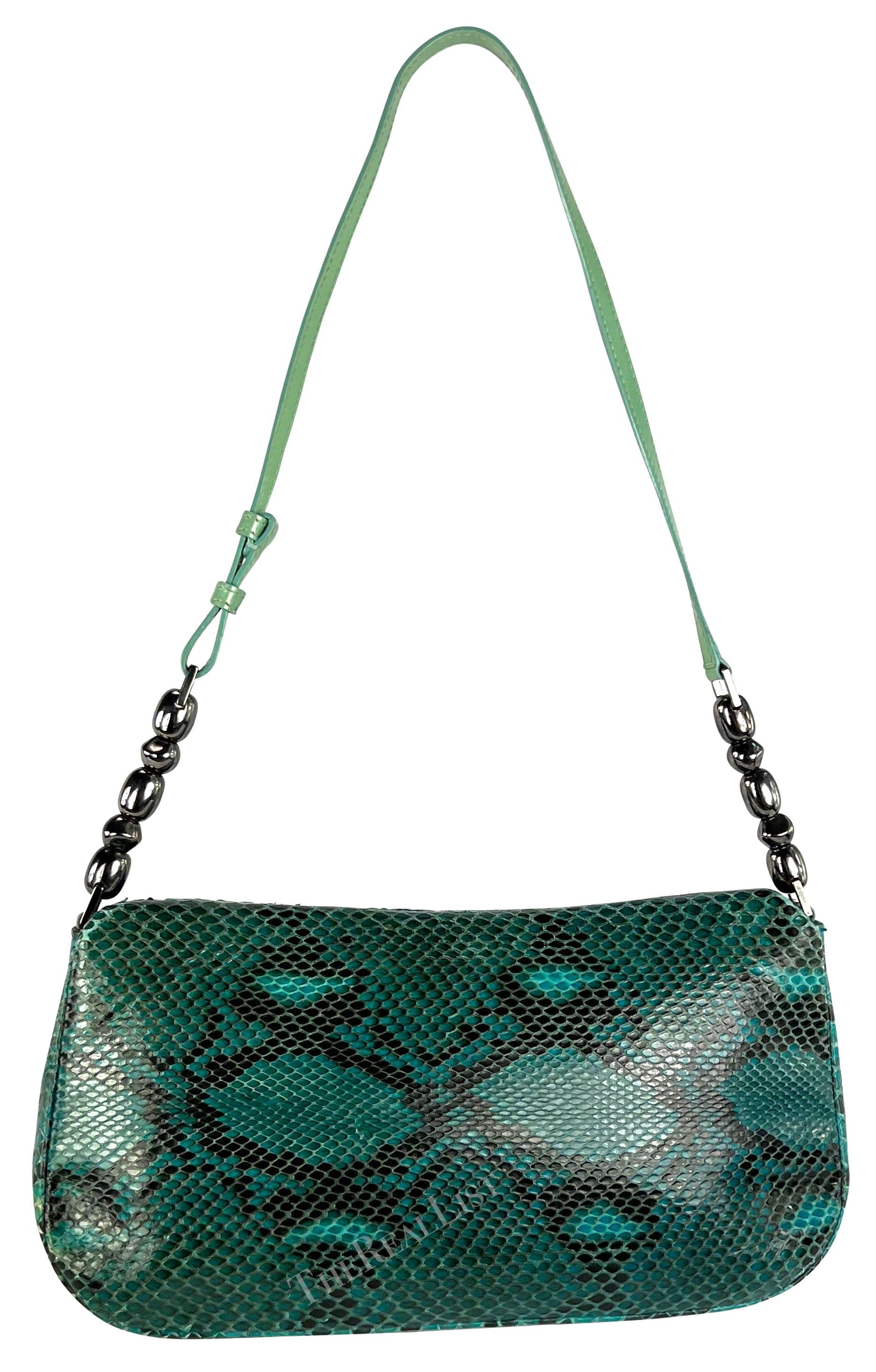 From the Spring/Summer collection, this chic blue python skin Christian Dior shoulder bag, designed by John Galliano, is constructed of blue python skin with an aqua-colored patent leather handle. Captured on Elsa Benitez by Patrick Demarchelier for the March 2000 issue of Marie Claire. This Malice Dior bag is complete with the style's classic beaded accents at the base of the handle, with a dark chrome finish. Sure to become your next go-to bag, this chic Dior by Galliano Malice bag is a must-have!