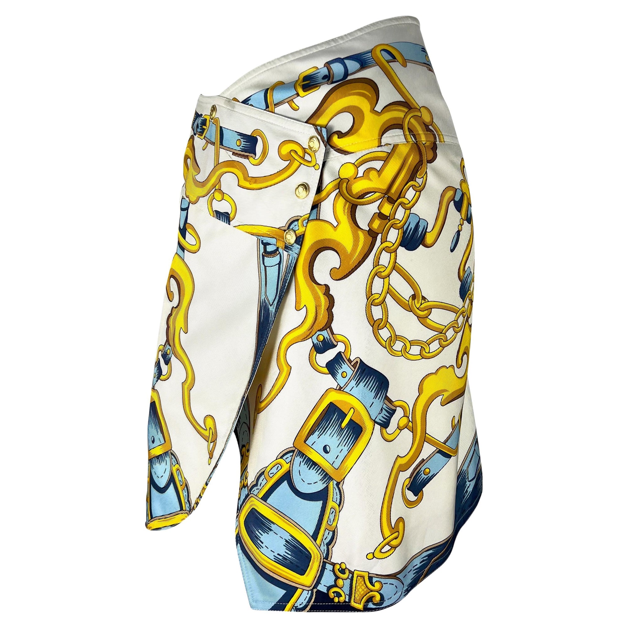 Presenting a beautiful blue equestrian print Christian Dior wrap skirt, designed by John Galliano. From the Spring/Summer 2000 collection, this skirt debuted on the season's runway and was modeled alongside John Galliano as he closed out the runway presentation. This fabulous skirt features a blue and gold/yellow equestrian motif. The skirt wraps around the body and is made complete with gold branded snap closures at the front. Boasting one of Galliano's most sought-after prints while at Dior, this incredible skirt is a must-have for any Dior by Galliano lover or collector!