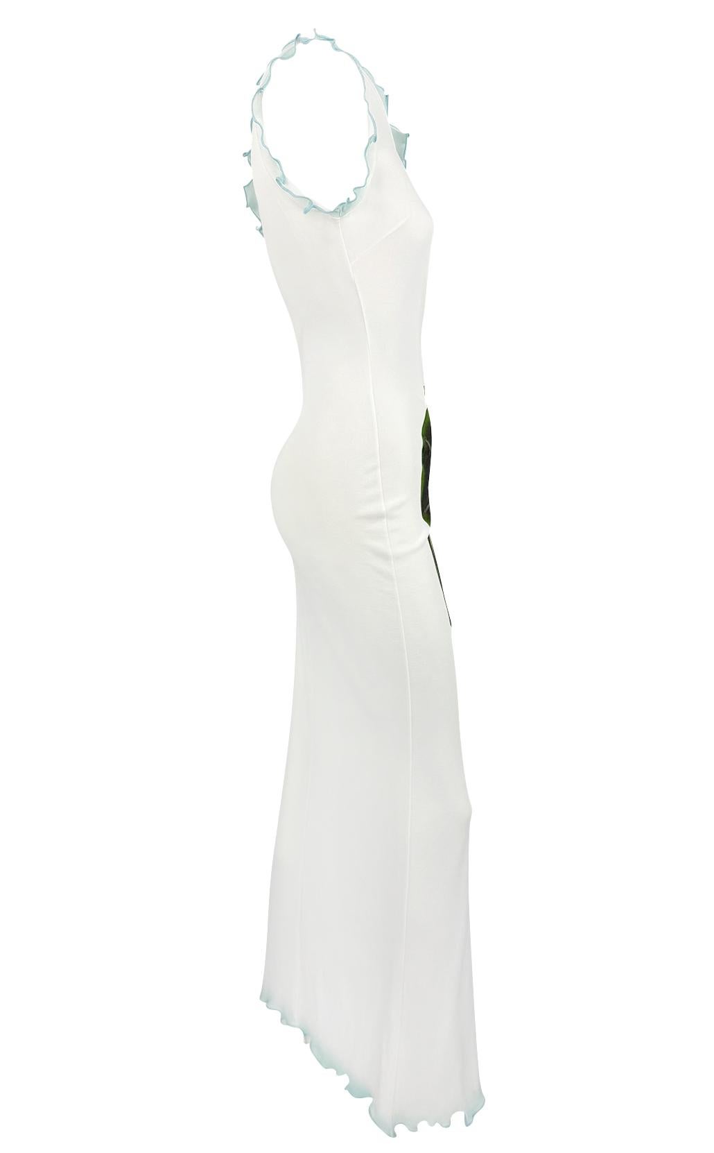 From Christian Lacroix’s Spring/Summer 2000 collection, this white maxi dress showcases an asymmetrical silhouette accented with delicate blue ruffle trim. A bold screen-printed leaf motif wraps around the hip, drawing attention to the dramatic thigh-high slit.