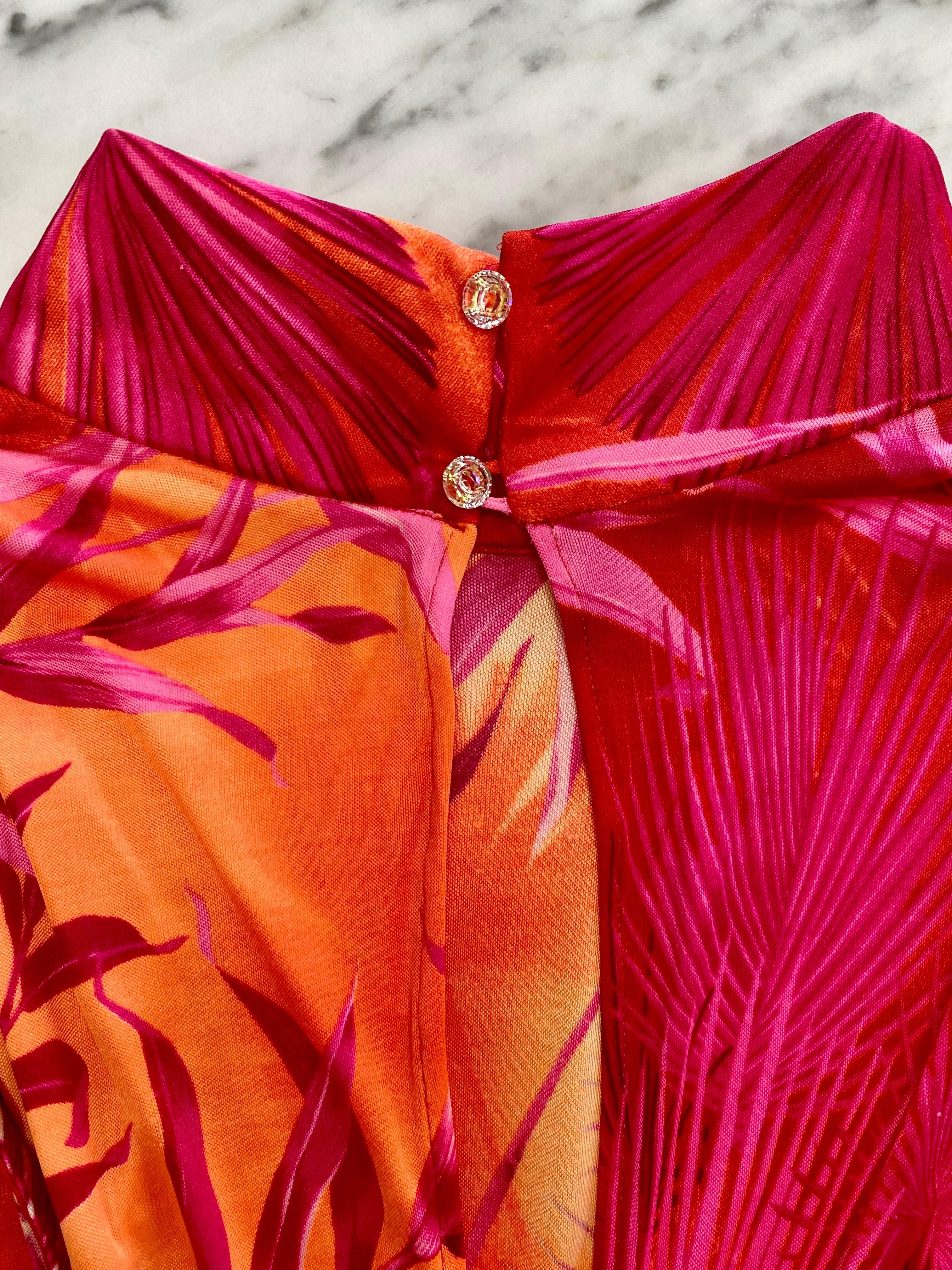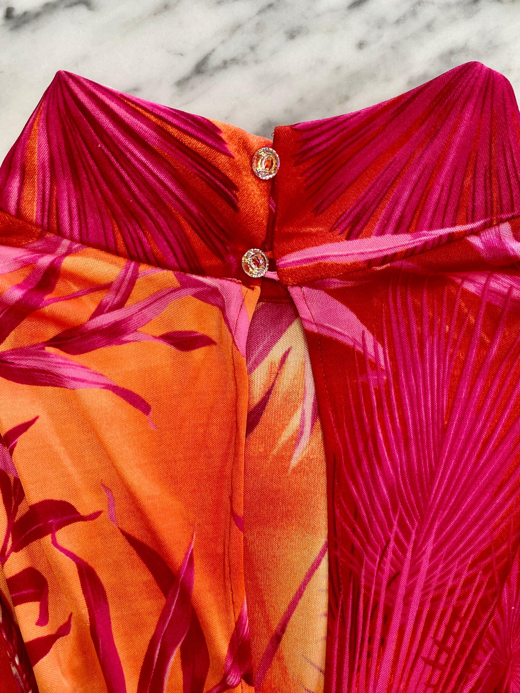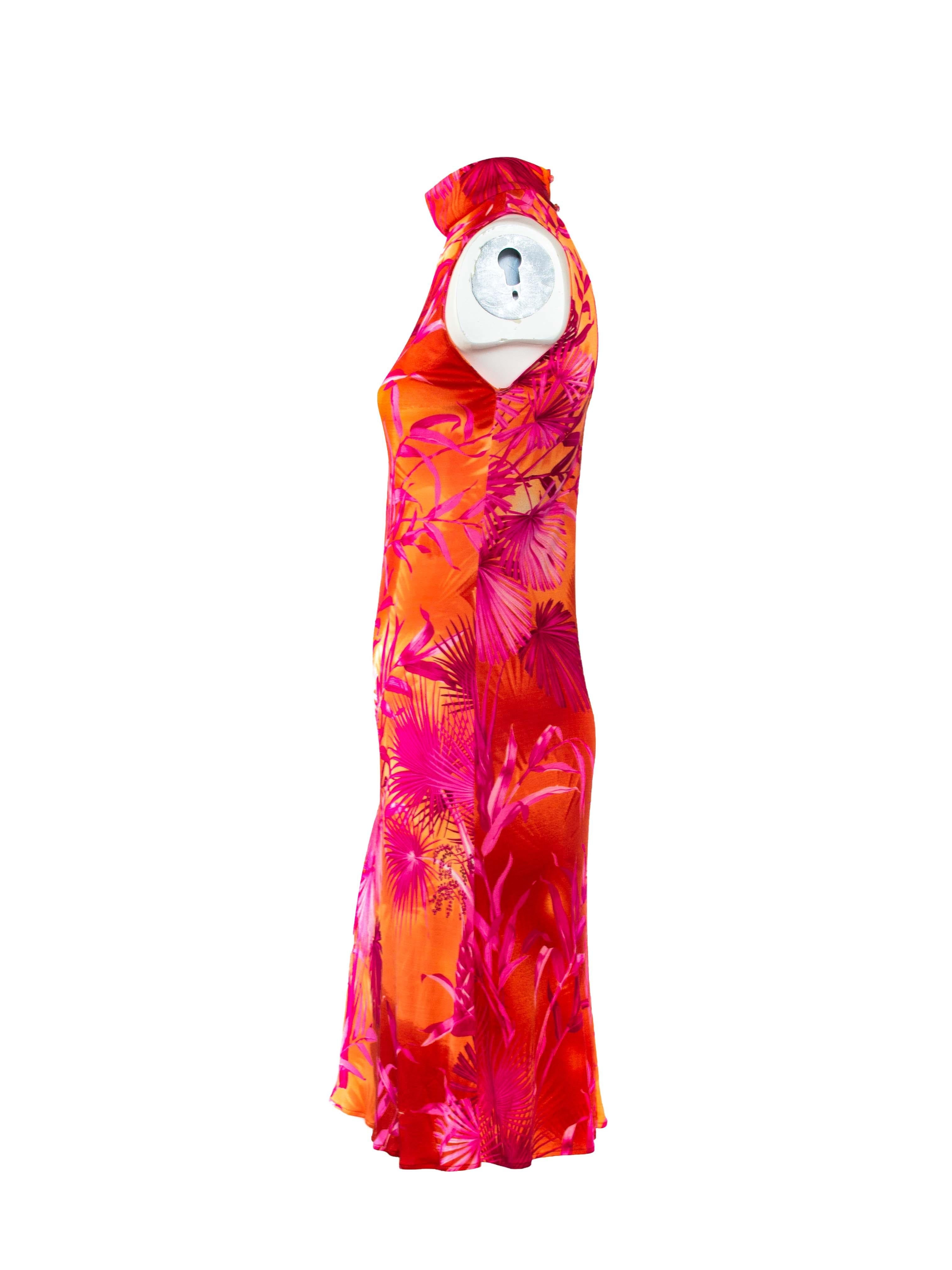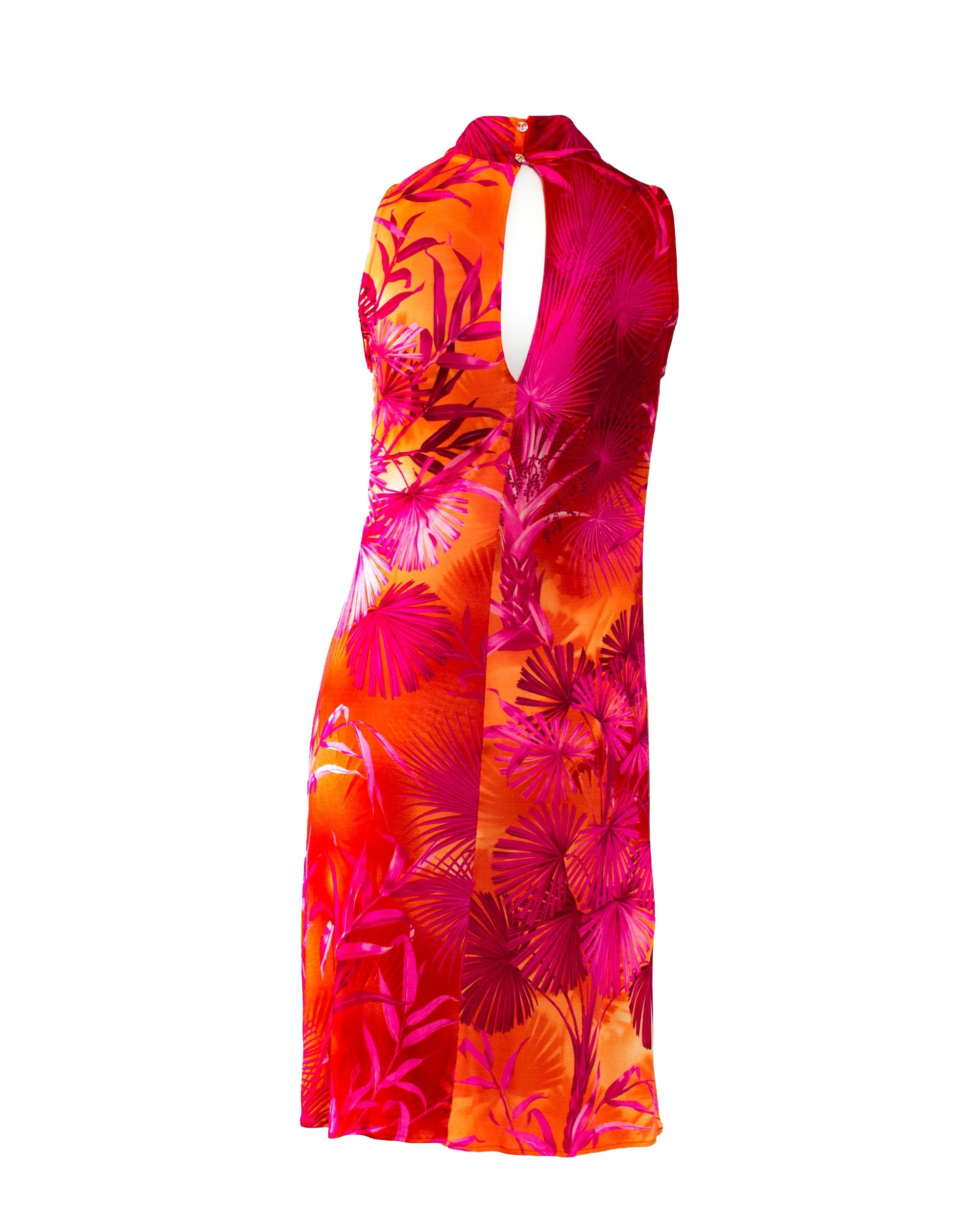 Donatella Versace designed this iconic jungle print dress from the Spring/Summer 2000 collection. This stunning dress has the same pattern but a different color combination than the infamous JLo Versace jungle dress. This beautiful pink/orange jungle dress features a mock neck with a small eyelet in the back. This sleeveless dress is instantly recognizable for its iconic print. Easily dressed up or down, this will undoubtedly be a go-to.