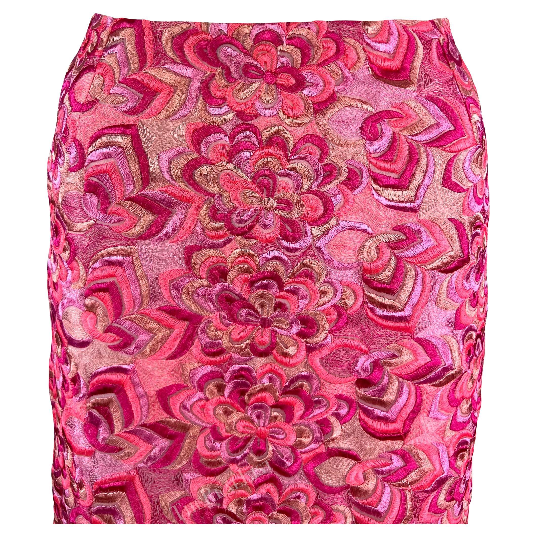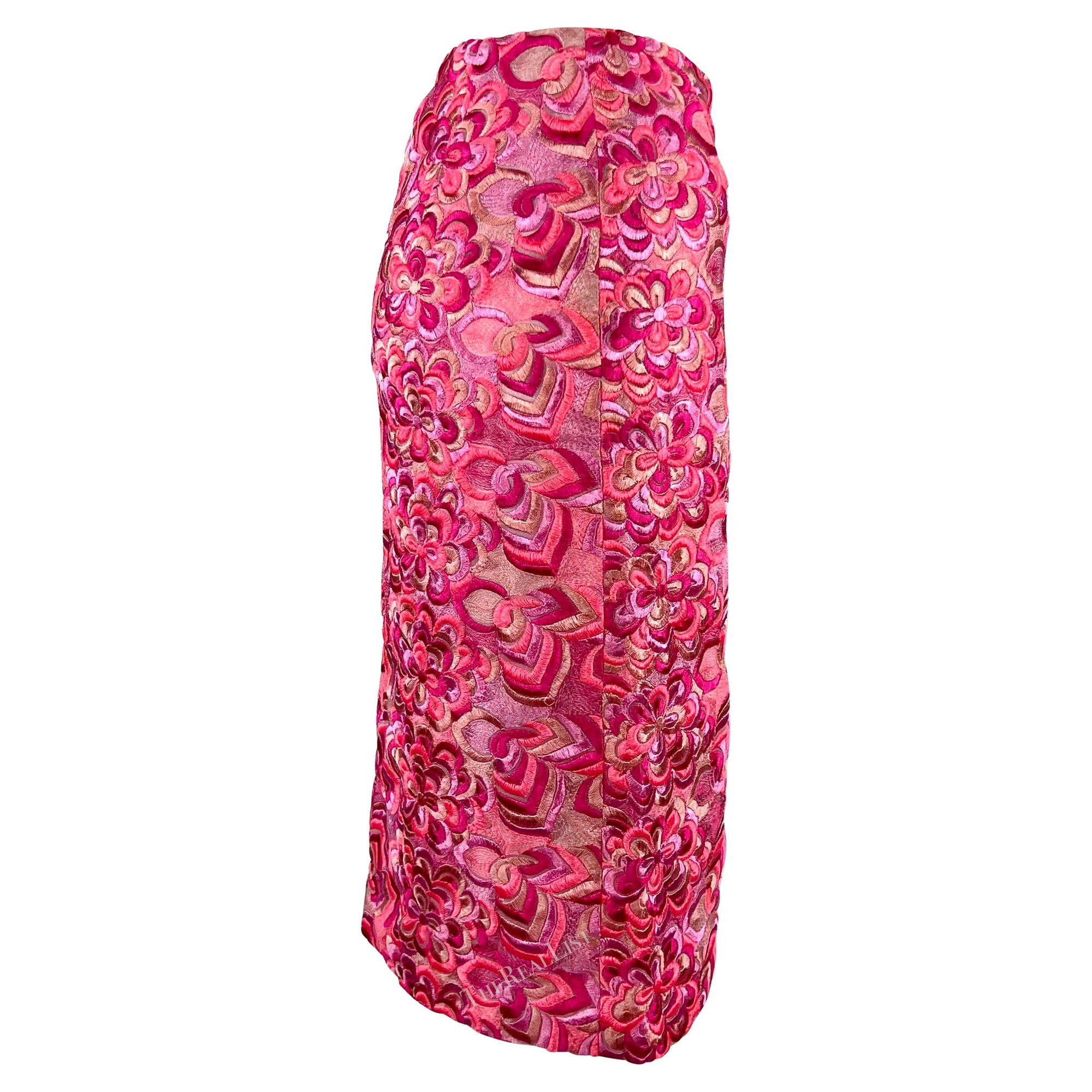 Presenting a hot pink skirt Versace skirt, designed by Donatella Versace. From Donatella's landmark Spring/Summer 2000 collection, this skirt is completely covered in intricate floral embroidery. A rare find, this Y2K beauty is masterfully tapered to hug the body.