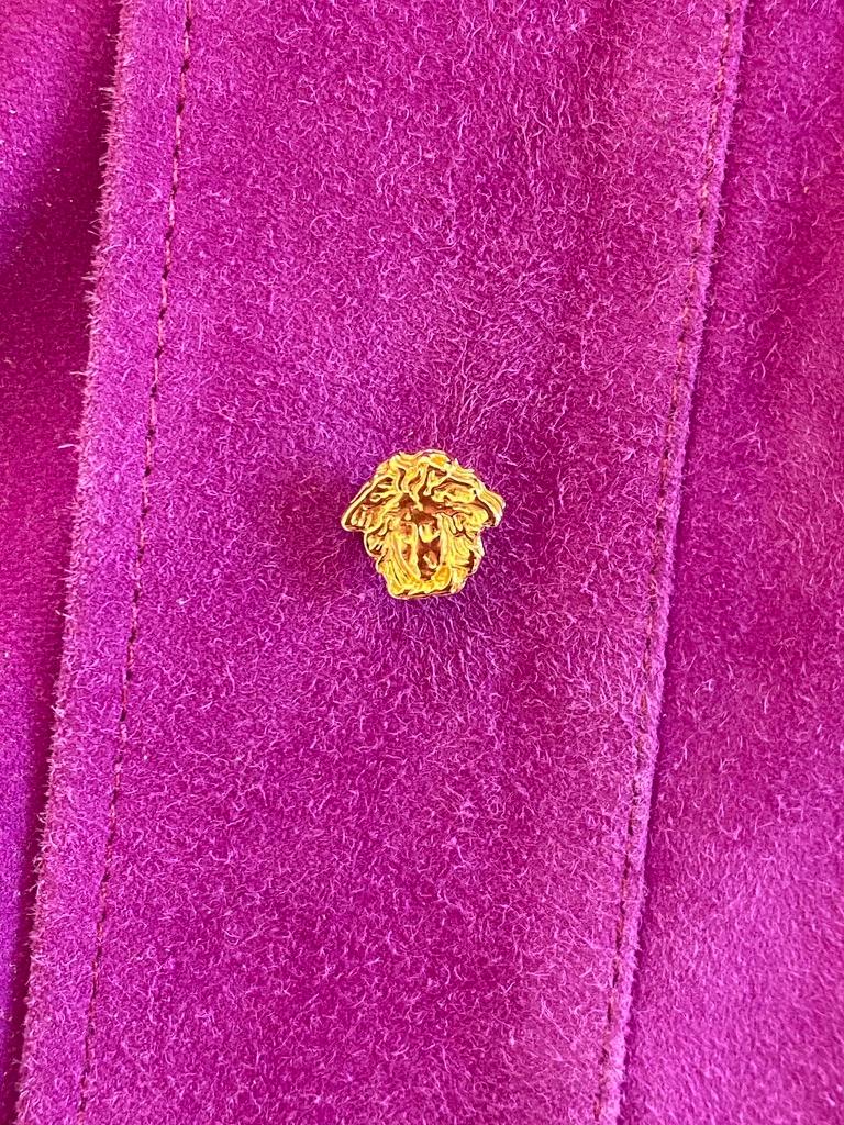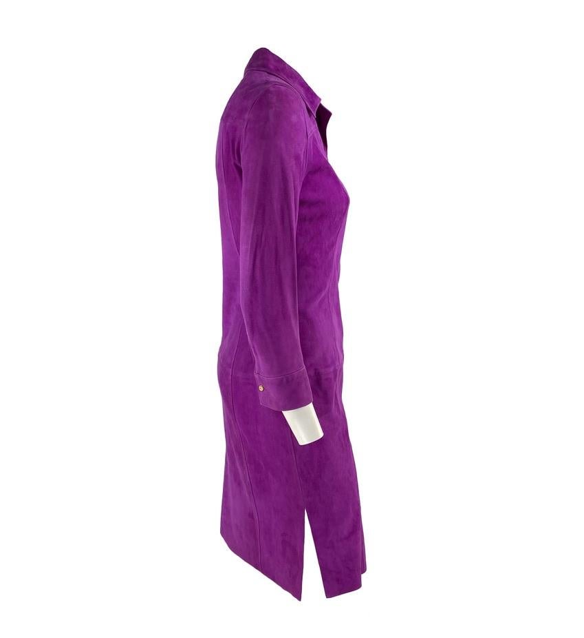 Presenting a purple suede shirt dress designed by Donatella for her iconic Gianni Versace Spring/Summer 2000 collection, remembered for its jungle print. This dress debuted as Look number 31, worn by Frankie Rayder, and appeared in the season's ad campaign on Amber Valetta, captured by Steven Meisel. The center of the dress is adorned with small golden and detailed buttons in the form of the Medusa. Make this piece your own by wearing it fully buttoned or undone to create a plunging neckline!