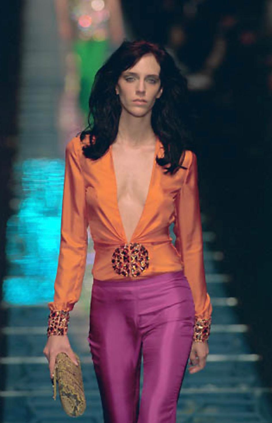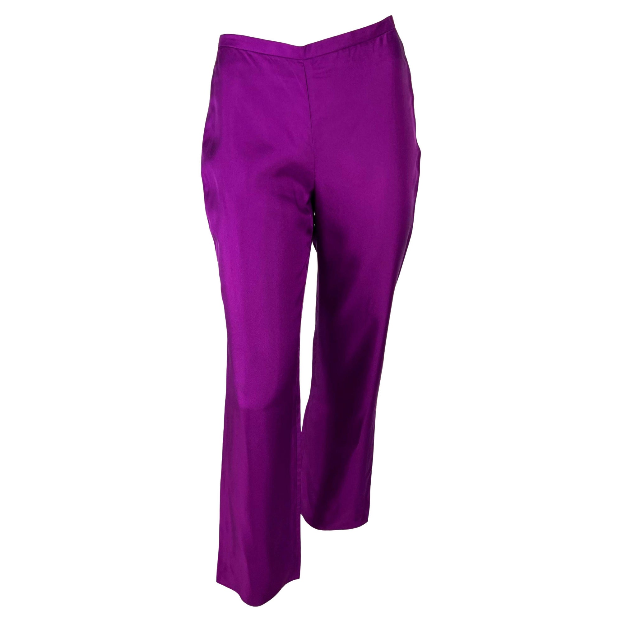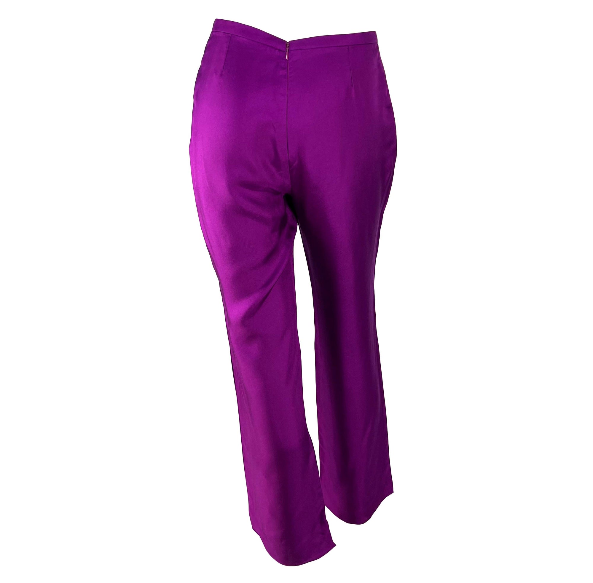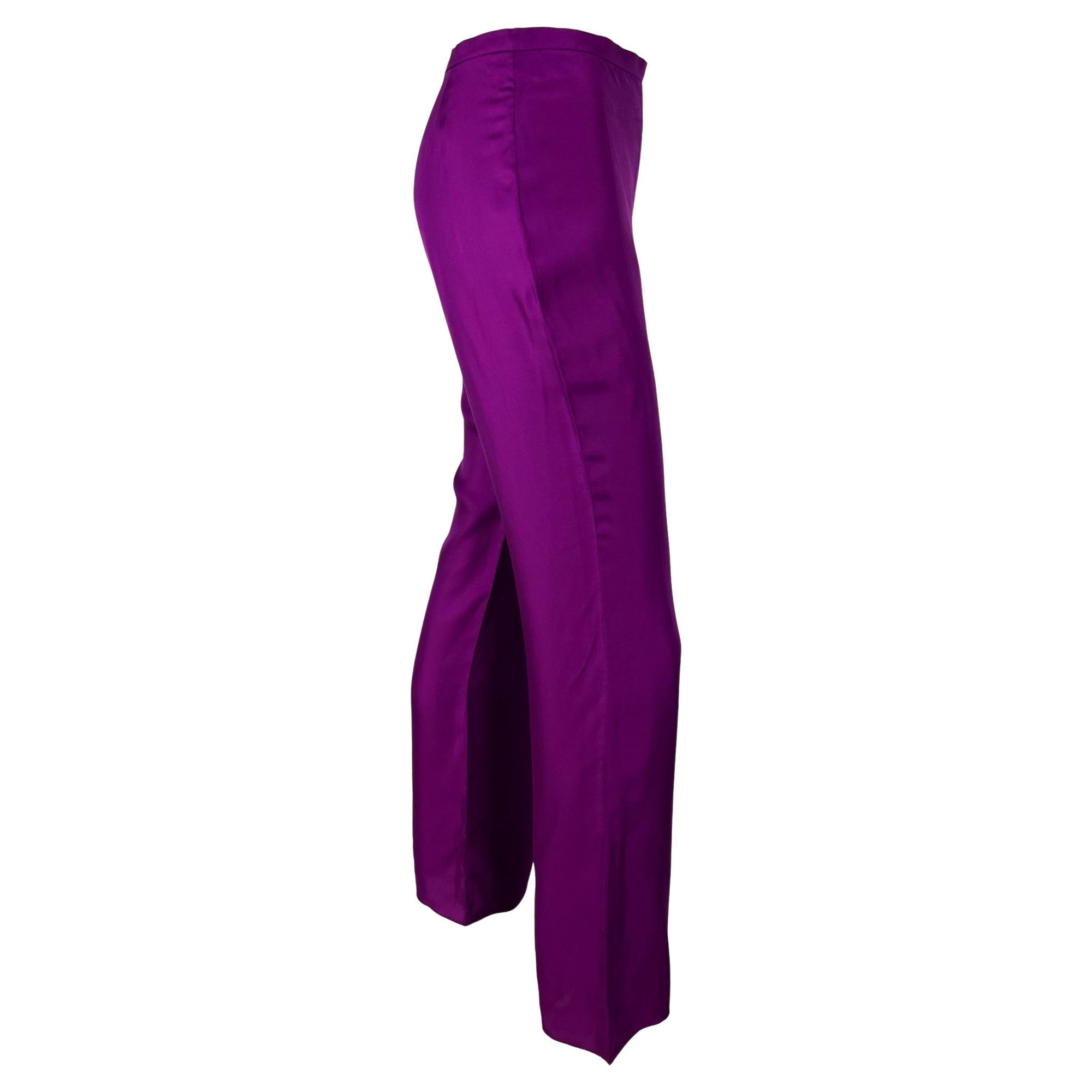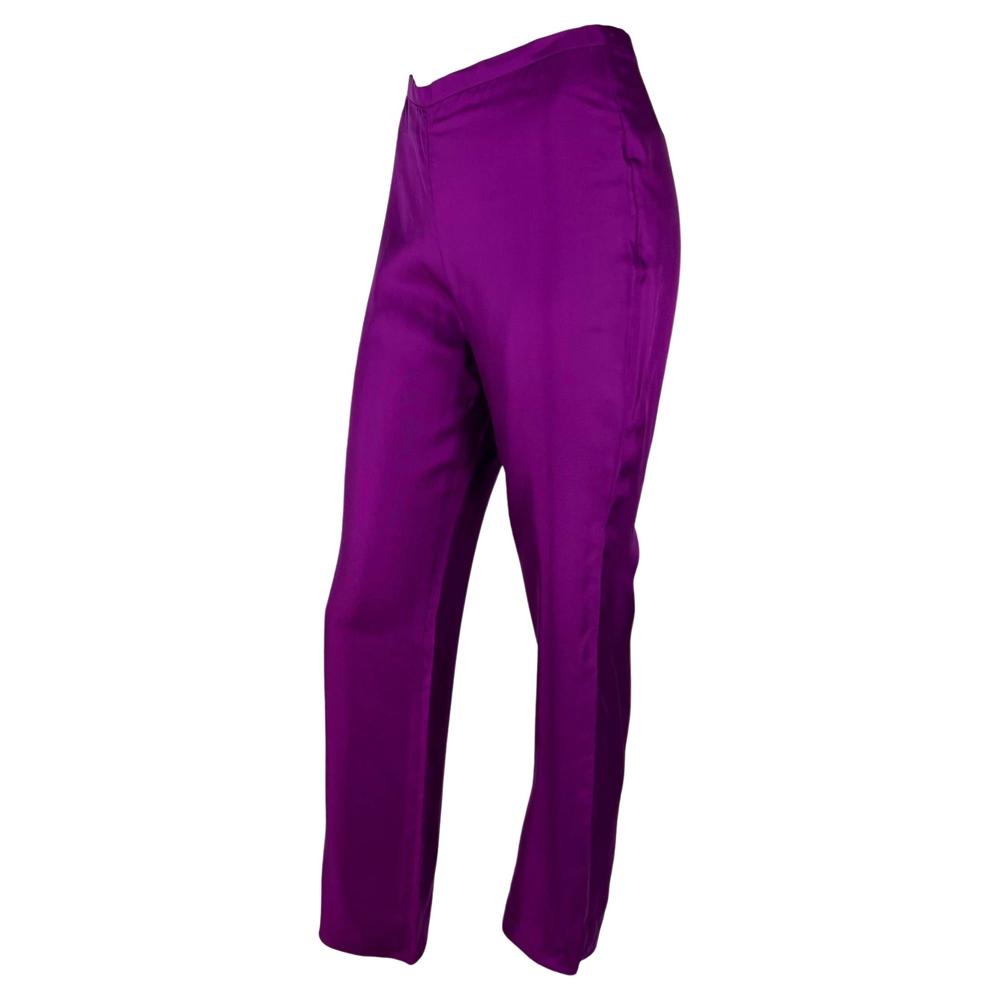 Presenting a stunning pair of purple silk Gianni Versace Couture pants designed by Donatella Versace. From the Spring/Summer 2000 collection, these entirely silk pants debuted in hot pink on the season's runway as part of Look 51, modeled by Hannelore Knuts. These fantastic pants were also featured in the season's ad campaign, modeled by Amber Valletta and photographed by Mario Testino. With a straight-leg style cut, these pants are effortlessly chic and light for warm weather.