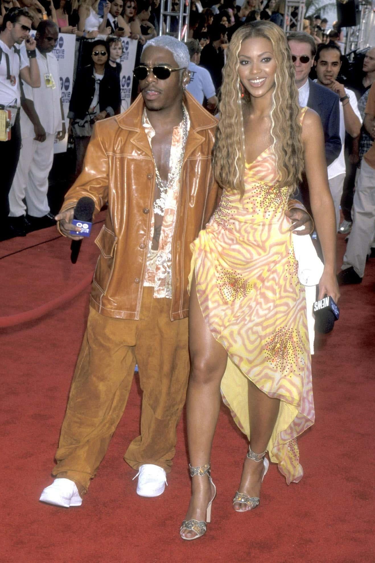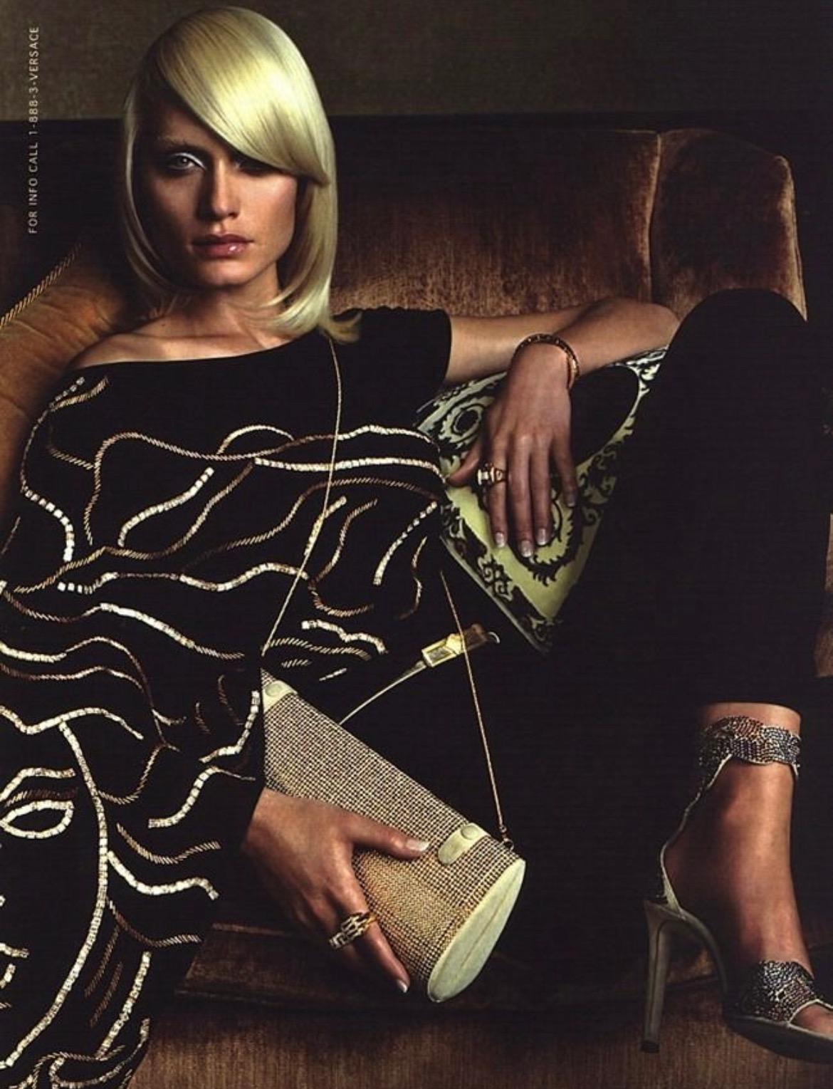 Presenting a pair of gorgeous gold rhinestone Gianni Versace heels, designed by Donatella Versace. From the collection, Spring/Summer 2000 these stunning heels feature an abstract design made up of copper, silver, and gold rhinestones that wrap around the toe and ankle. Featured in the season's ad campaign modeled by Amber Valetta and photographed by Steven Meisel, these heels debuted on the season's runway as part of look 23 modeled by Alexandra Egorova. Well documented, these heels were featured in British Vogue in a 1999 editorial spread by Raymond Meier and were also worn by Beyonce when she co-hosted the red carpet preshow for the 2000 MTV Movie Awards. These Y2K gold suede rhinestone heels are the perfect chic addition to any wardrobe.