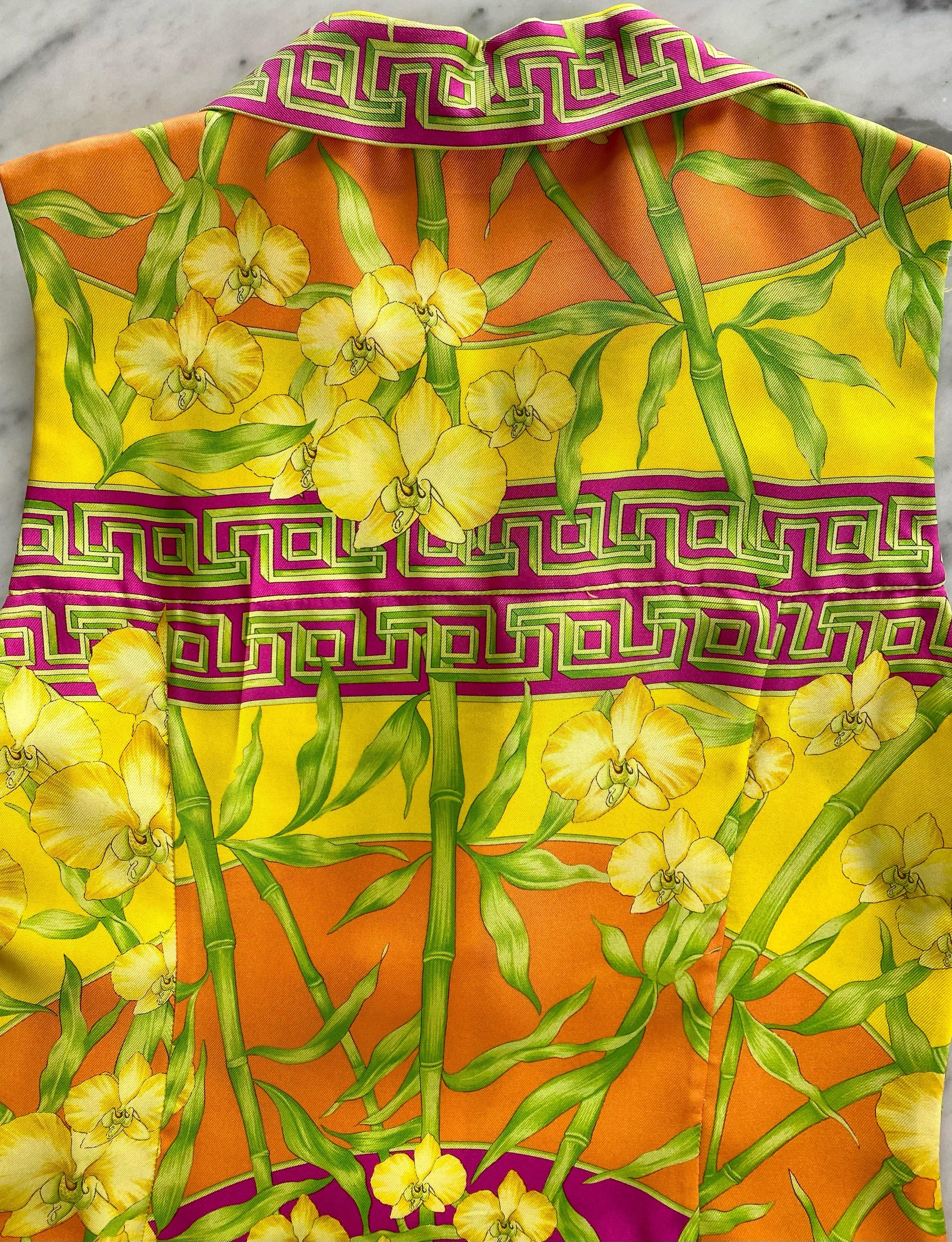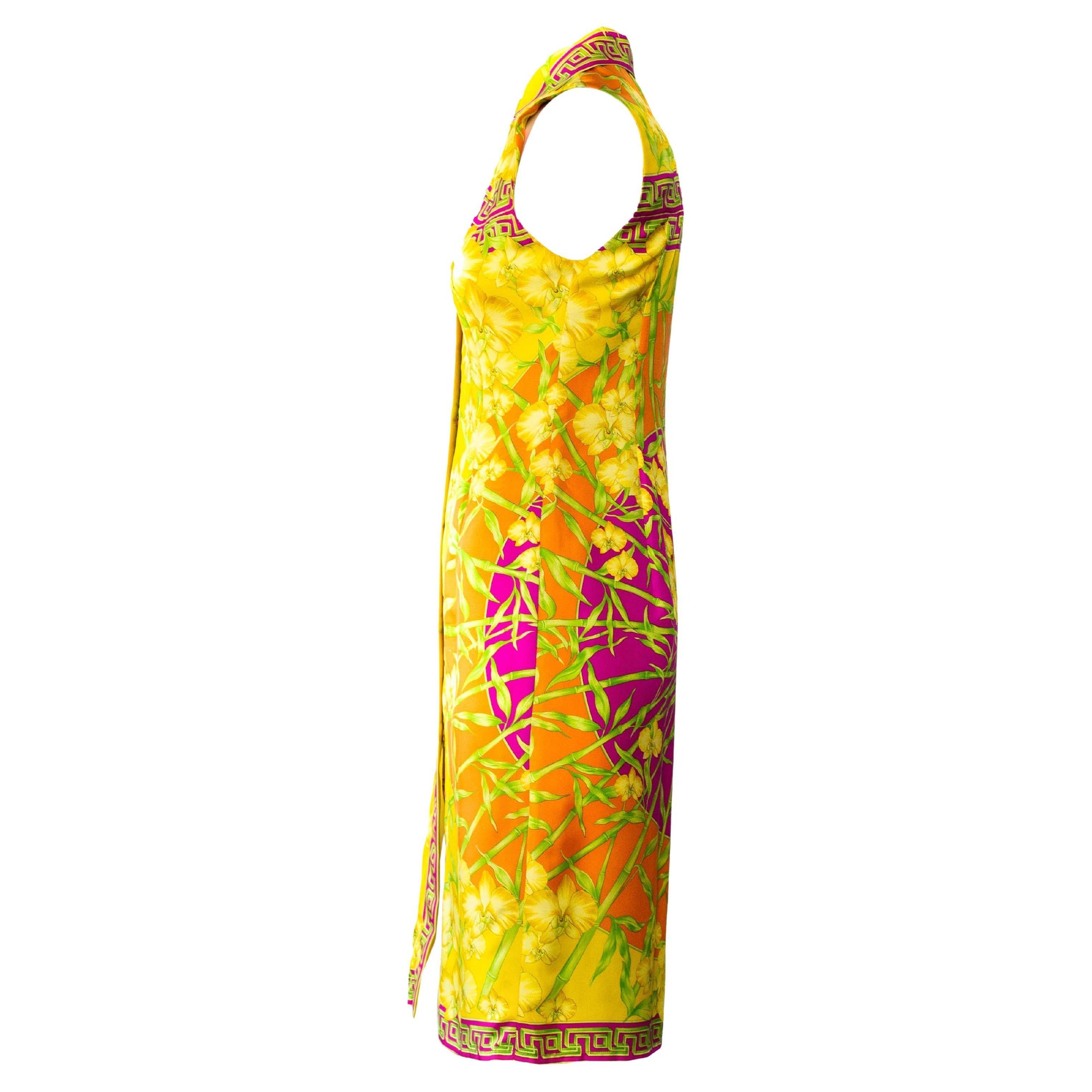 This Versace take on a collared 'ladies who Donatella Versace designed lunch' dress. This dress by Gianni Versace for the Spring/Summer 2000 collection includes an orchid jungle motif, similar to Donatella's famous jungle print on JLo and other items from that season's runway. The primarily yellow and orange dress is sleeveless and features crystal buttons from top to bottom on the front of the garment. The dress also features a classic Greek key pattern in pink and a large Versace Medusa logo on the back.