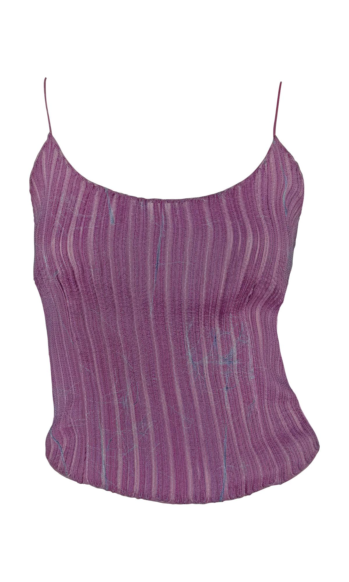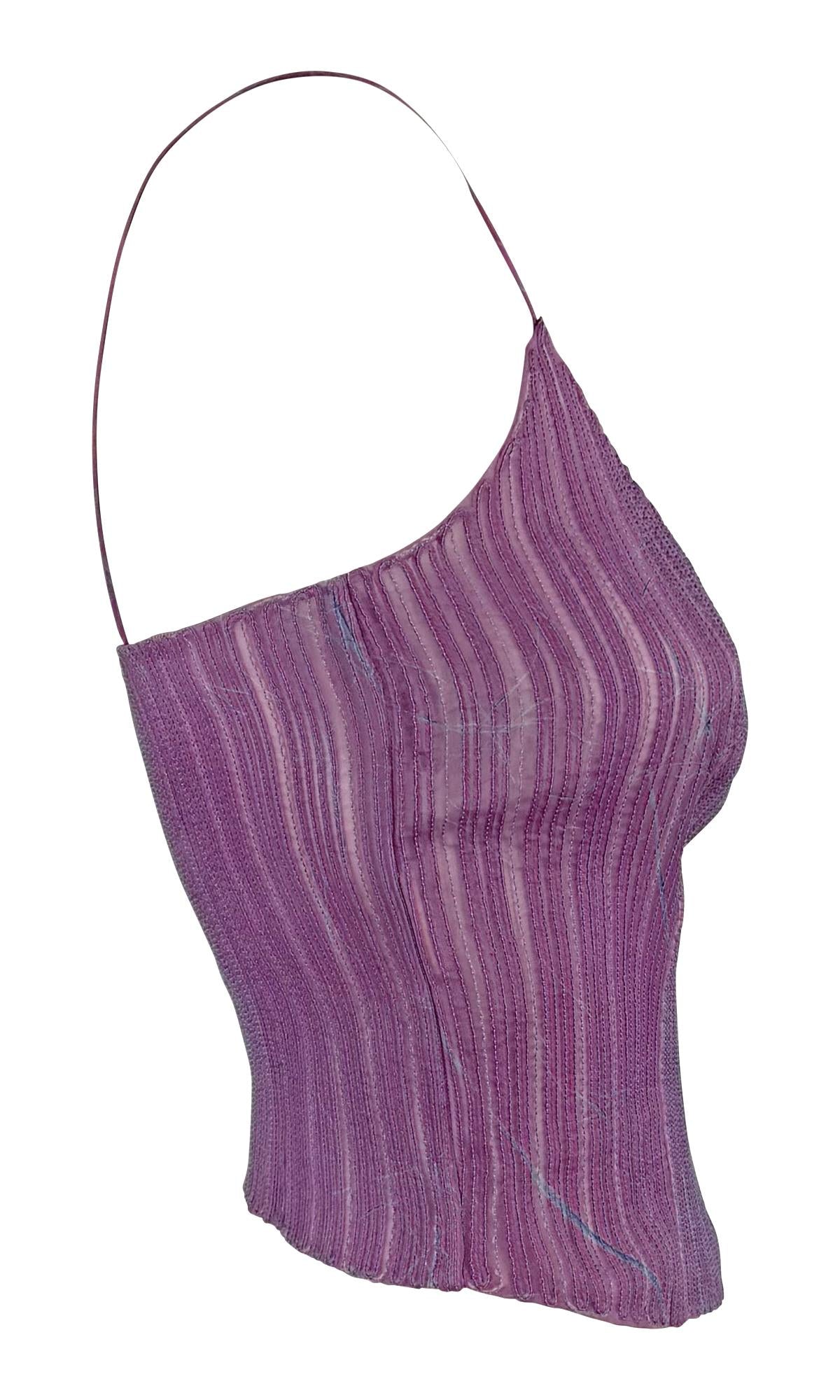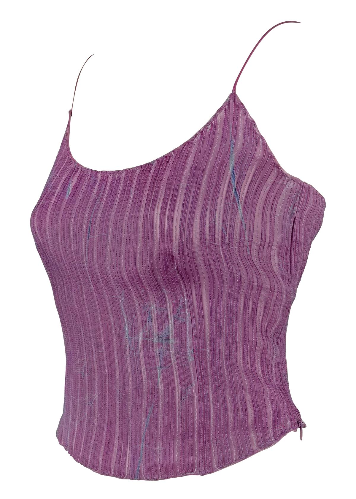 This sheer purple tank top from Giorgio Armani's Spring/Summer 2000 runway collection is crafted from delicate embroidered silk. Designed with a subtle cropped cut, the piece features tonal vertical stitching and fine spaghetti straps, showcasing Armani's refined, minimalist approach to feminine dressing.