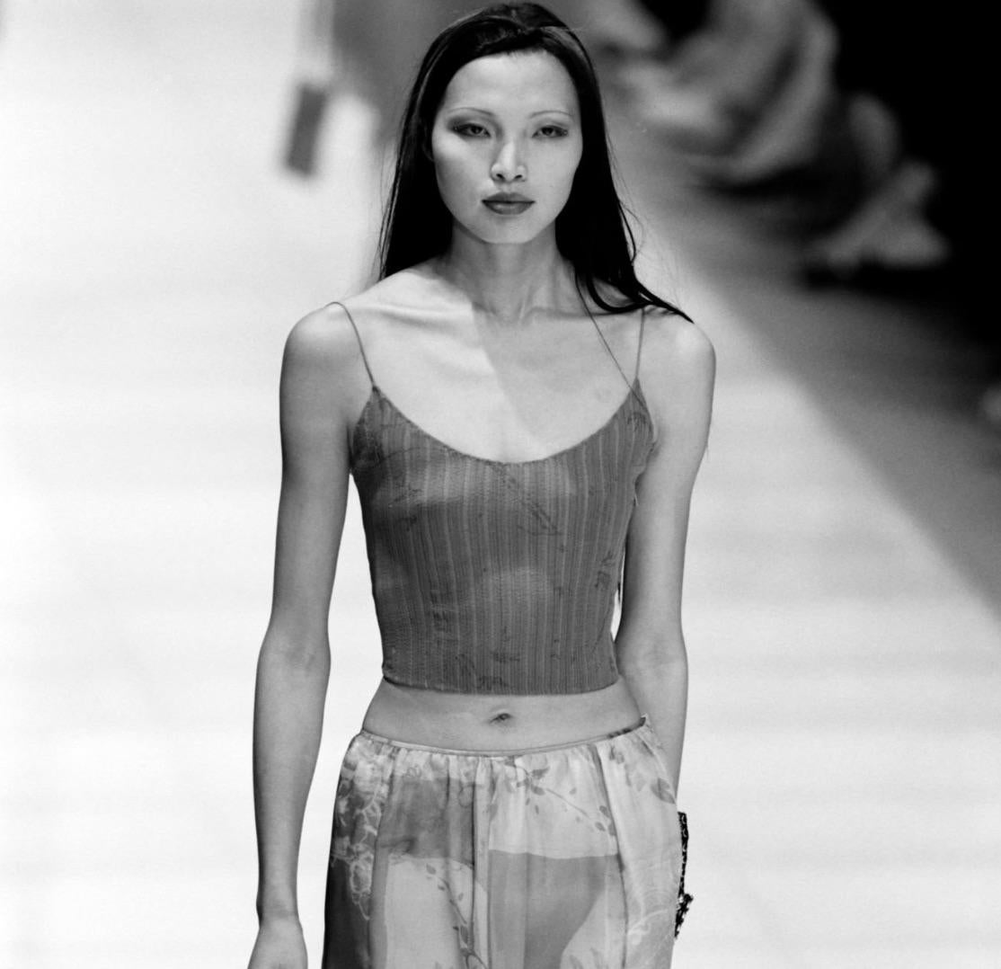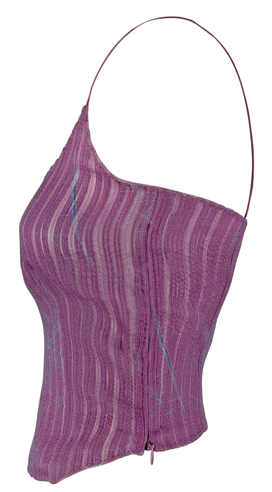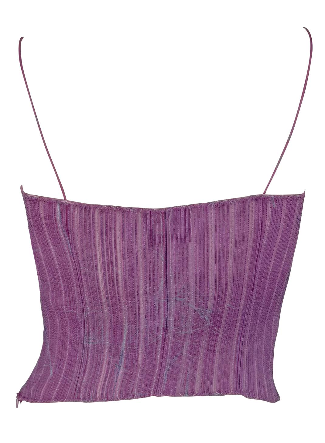 This sheer purple tank top from Giorgio Armani's Spring/Summer 2000 runway collection is crafted from delicate embroidered silk. Designed with a subtle cropped cut, the piece features tonal vertical stitching and fine spaghetti straps, showcasing Armani's refined, minimalist approach to feminine dressing.