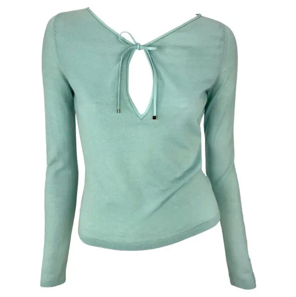 Presenting a fabulous light blue knit cashmere Gucci Shirt, designed by Tom Ford. From the Spring/Summer 2000 collection, this top is constructed entirely of cashmere and features a leather lace detail at the neckline. The top is made complete with an eyelet at the bust and silver-tone metal accents at the leather lace. The perfectly elevated closet staple, this Gucci by Tom Ford top is a must-have addition to any wardrobe!