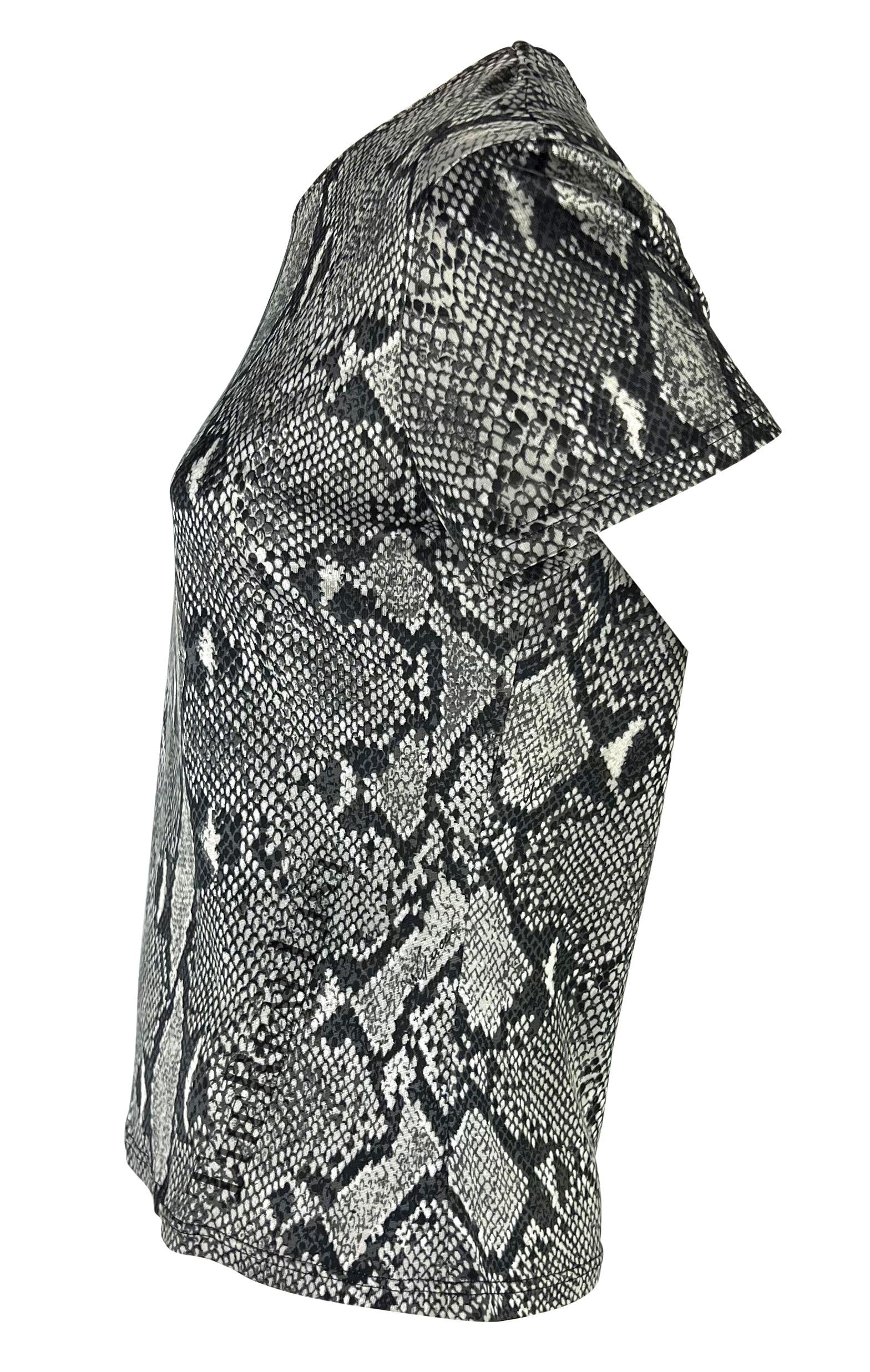 This grey snakeskin print t-shirt from Gucci’s Spring/Summer 2000 collection, designed by Tom Ford, features the same signature print that appeared throughout the season’s runway. Constructed entirely of viscose, the top has a wide crew neckline and a slightly cropped hem. A quintessential Y2K piece, it exemplifies Ford’s sleek, sensual approach to everyday luxury.