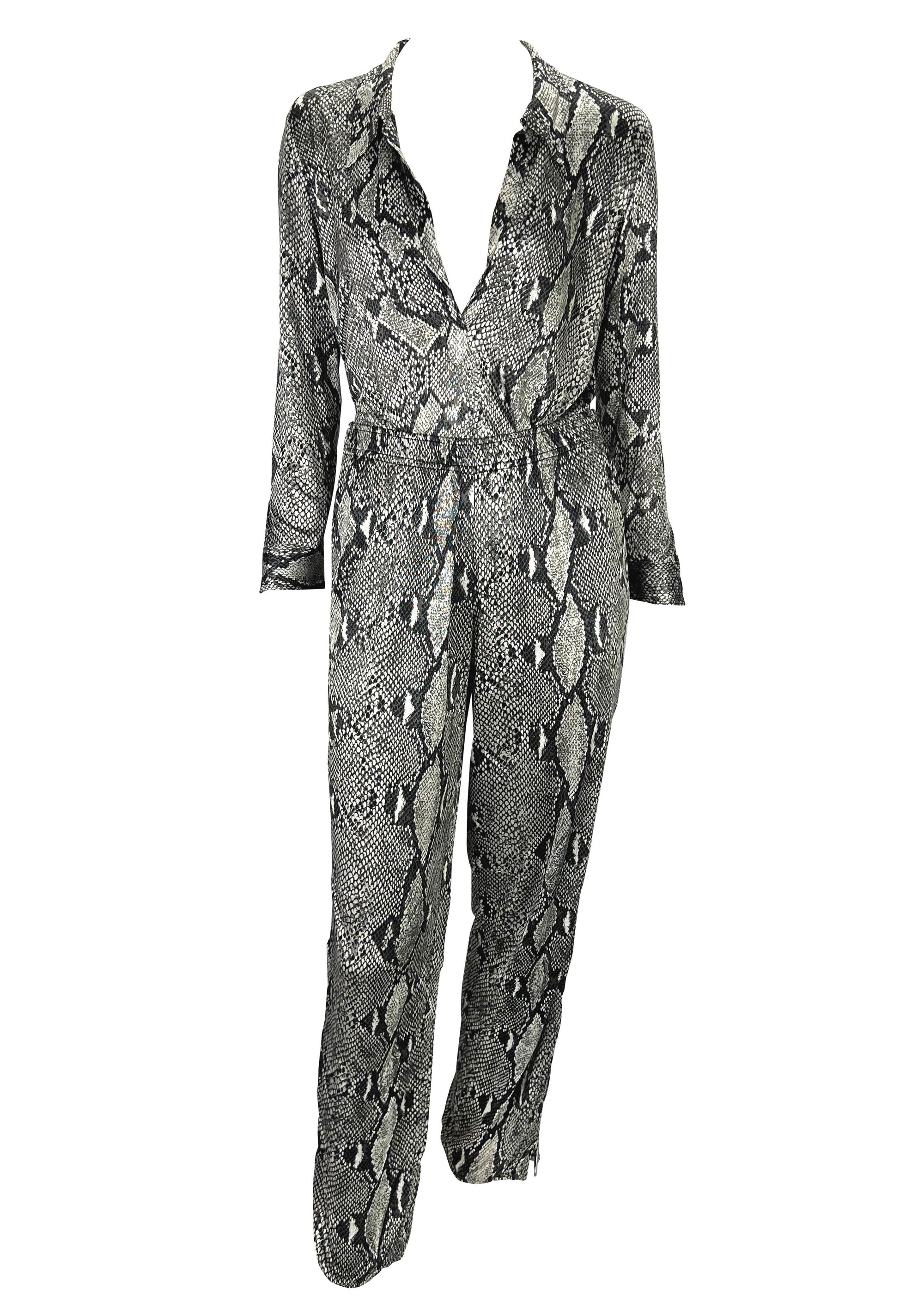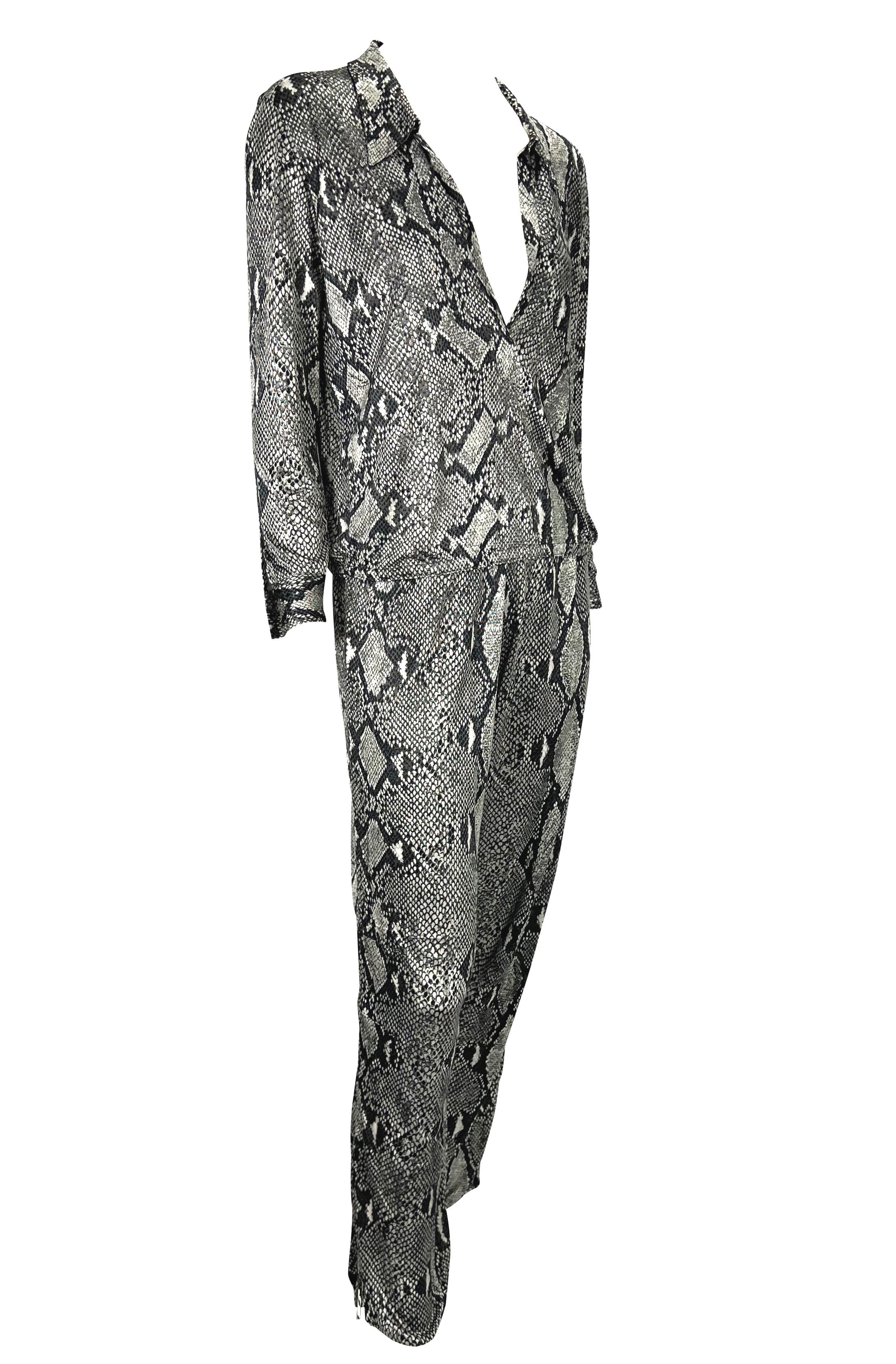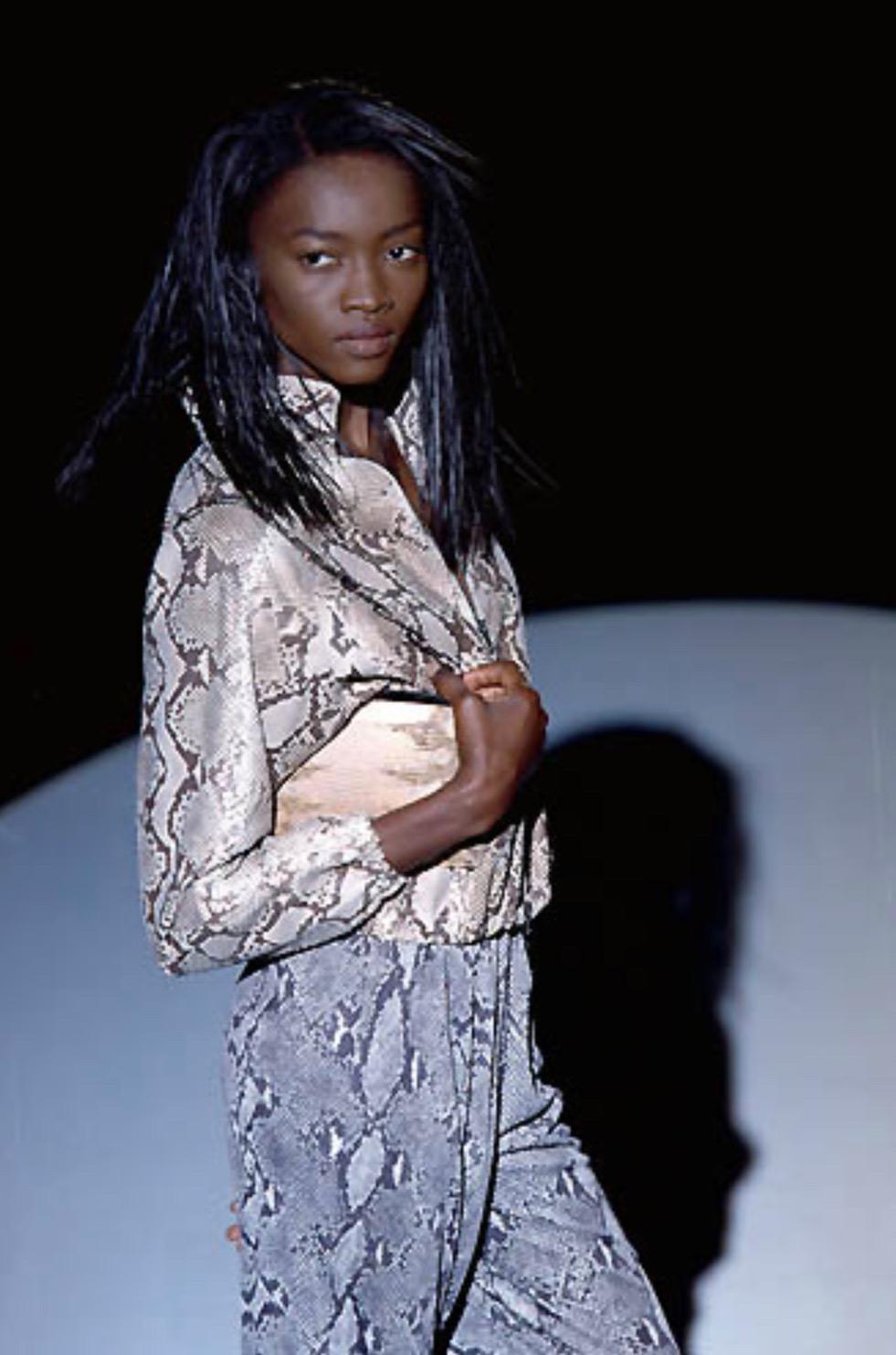 This grey snake print pant set from Gucci’s Spring/Summer 2000 collection was designed by Tom Ford. The season’s runway was covered in this distinctive snakeskin motif, with the pants debuting as part of Look 3 modeled by Oluchi Onweagba. The set includes loungy viscose pants and a matching t-shirt. The top features a wide crew neckline and a slightly cropped hem, while the pants are detailed with oversized zipper pulls at the ankles and a silver buckle at the adjustable waistband. An instantly recognizable Tom Ford for Gucci design, this documented set is a standout of the era.