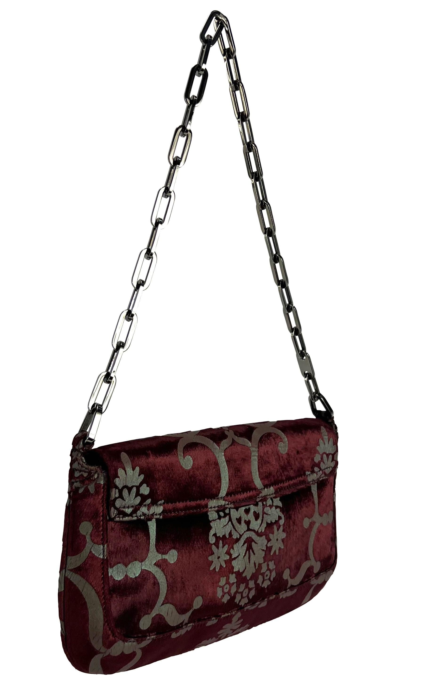 Presenting a fabulous burgundy velvet Gucci chain shoulder bag designed by Tom Ford. This Spring/Summer 2000 collection bag features a gunmetal-tone baroque pattern atop the luxurious deep red velvet. Add this timeless Gucci by Tom Ford bag to your collection!