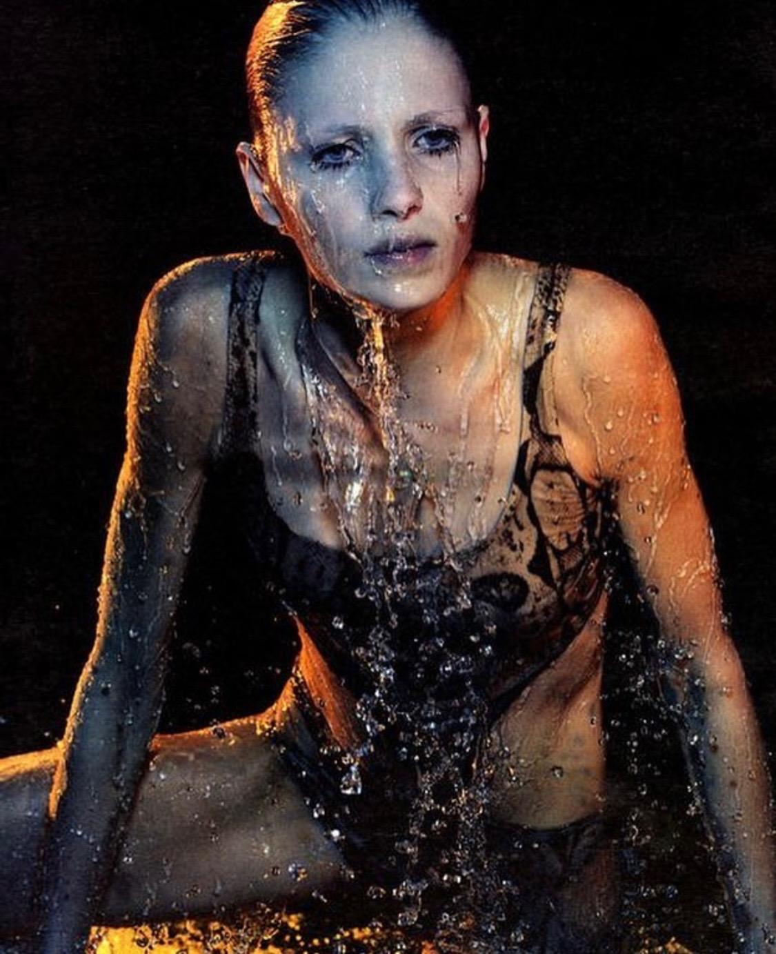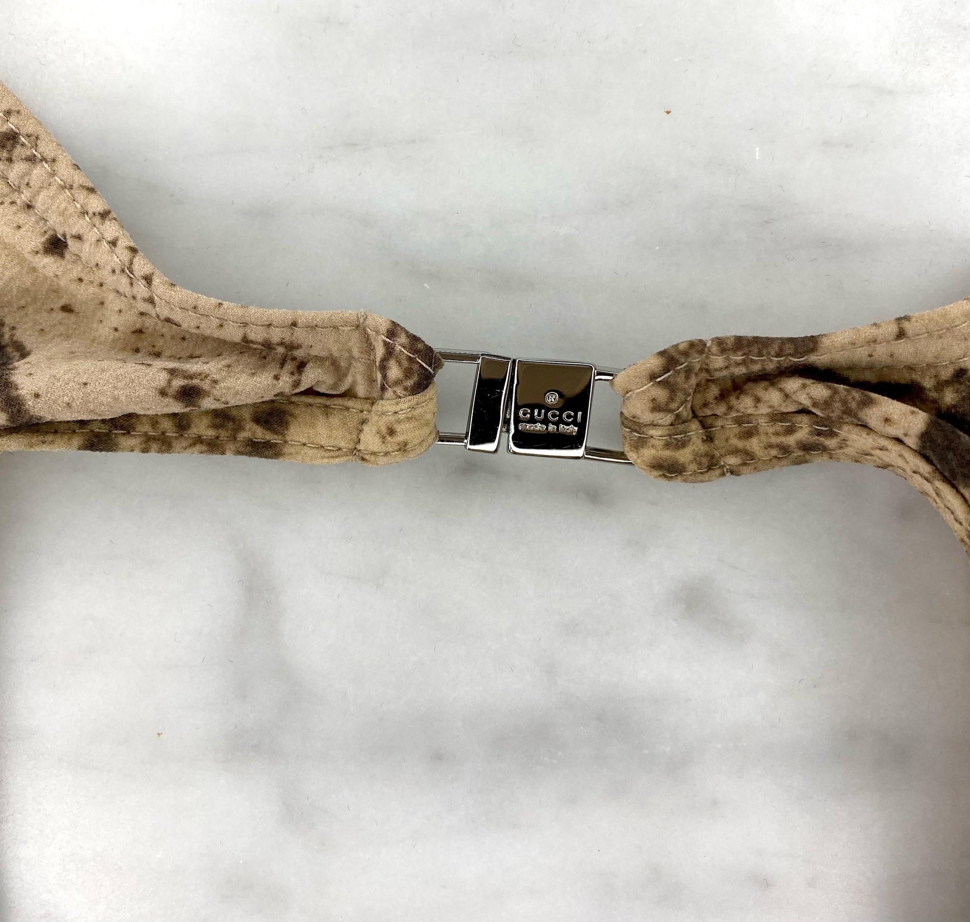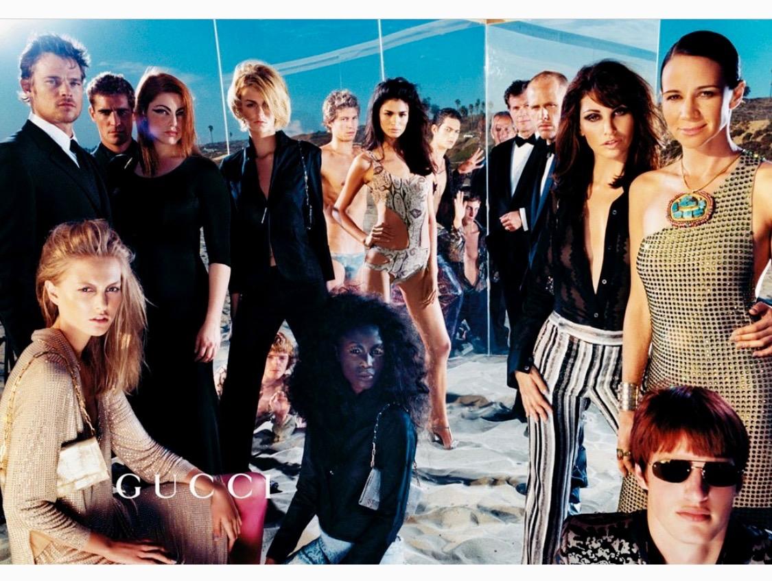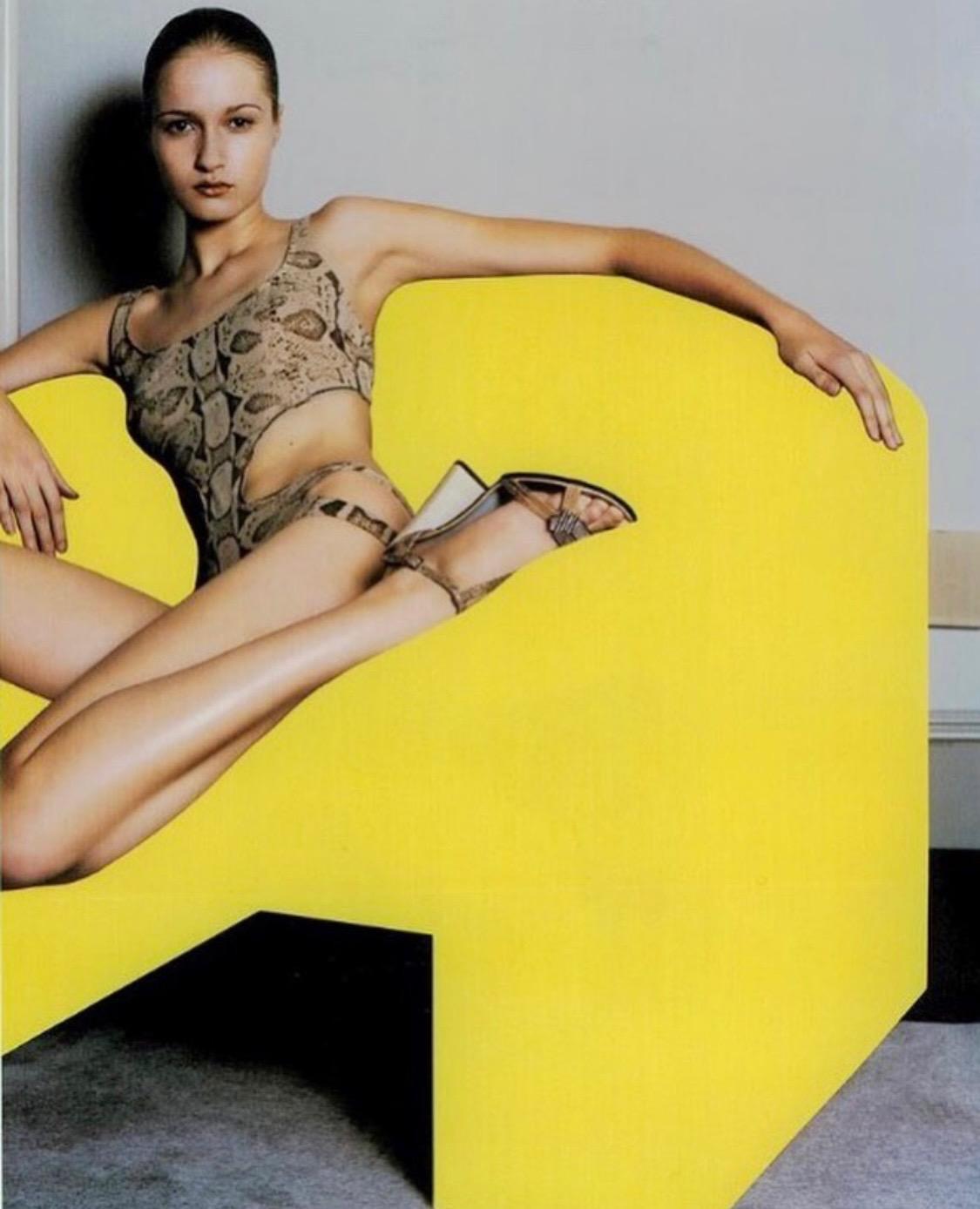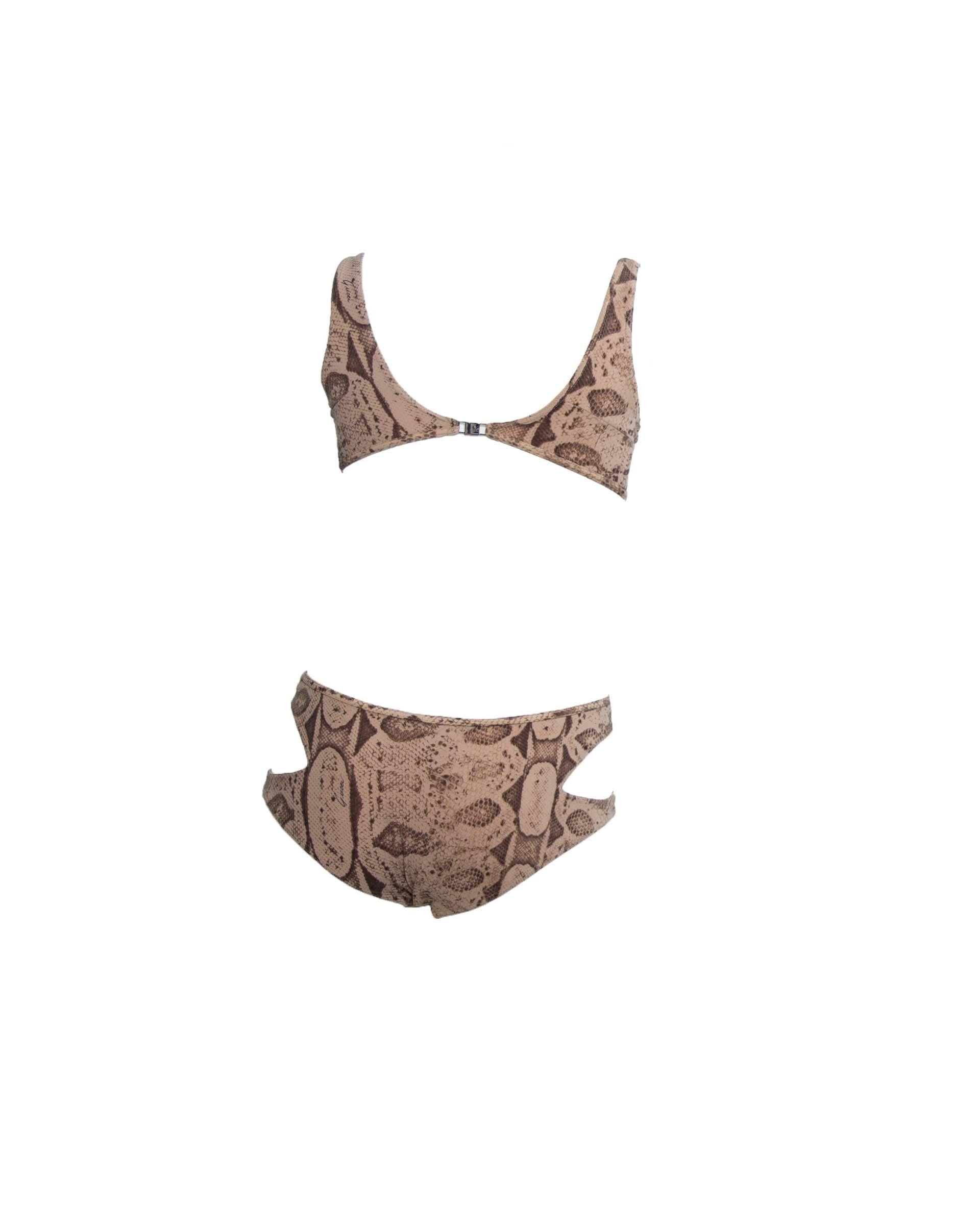 Presenting an absolutely iconic and sexy snakeskin print Gucci cut-away bathing suit, designed by Tom Ford. This swimsuit debuted on the Spring/Summer 2000 Gucci runway as look 31, modeled by Aurélie Claudel. This one-piece swimsuit is not your typical one-piece with cutouts at the hips and waist on either side and a backless reverse. This suit was not only showcased on the runway but also in that season's campaign, on Yfke Sturm in W Magazine, Danitta Angell in Vogue Italia, Hannelore Knuts in Dutch Magazine, and Gisele Bündchen in British Vogue. This bathing suit pattern was also seen on Mariah Carey.
