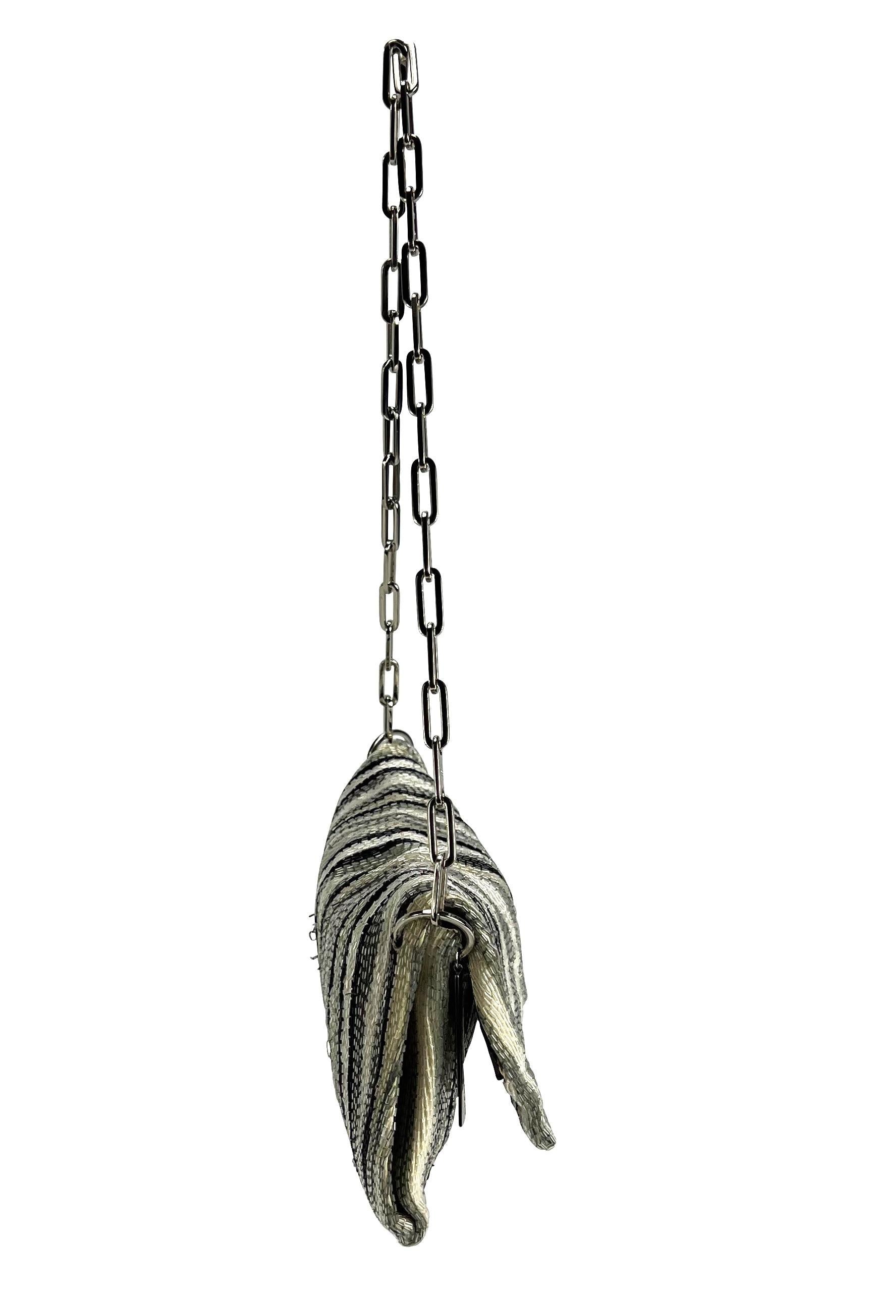 This Gucci flap bag, designed by Tom Ford for the Spring/Summer 2000 collection, features a grey and white beaded abstract pattern with a shimmery finish. It includes a silver-plated chain handle and a branded keychain. A striking pair of the matching beaded pants are also available on our storefront!