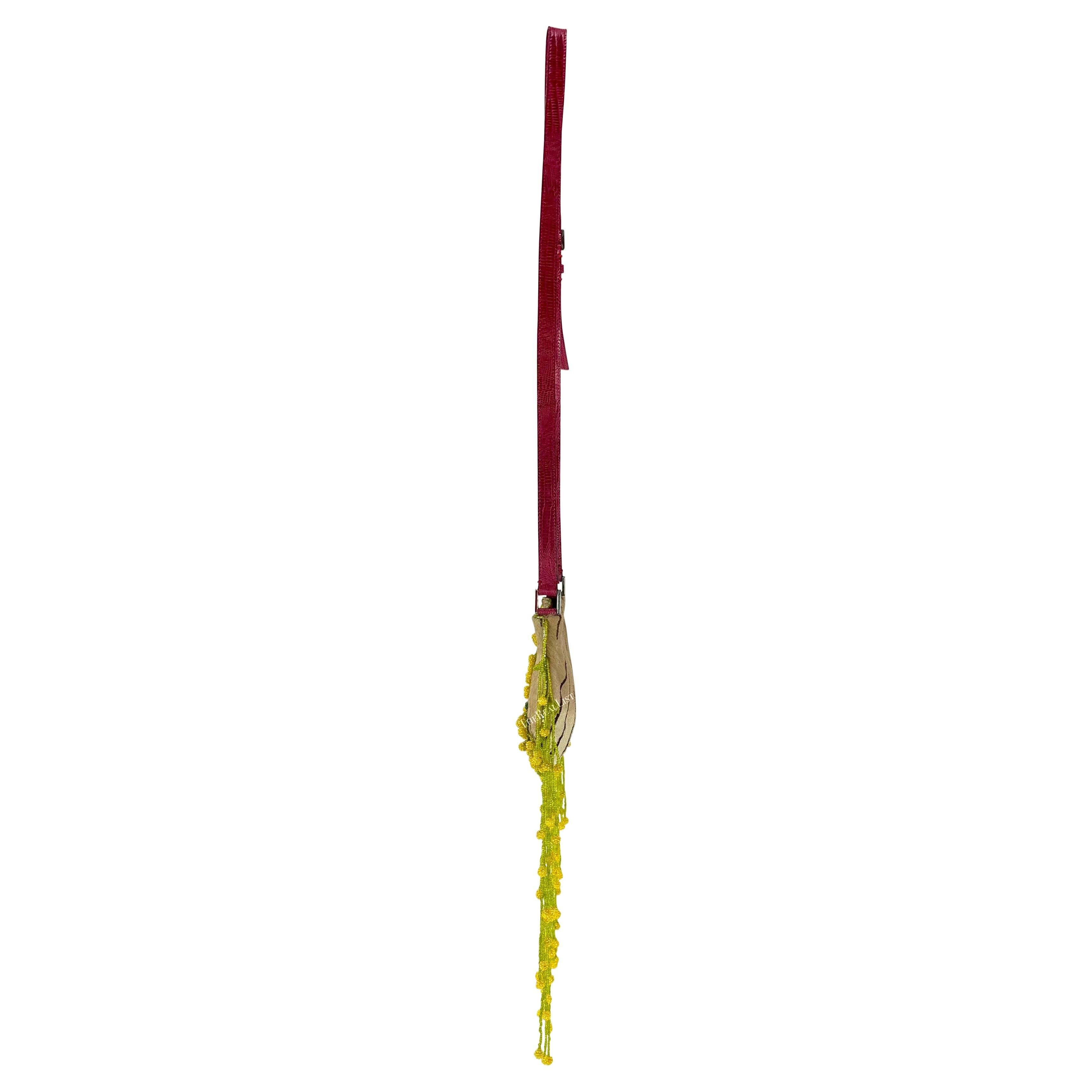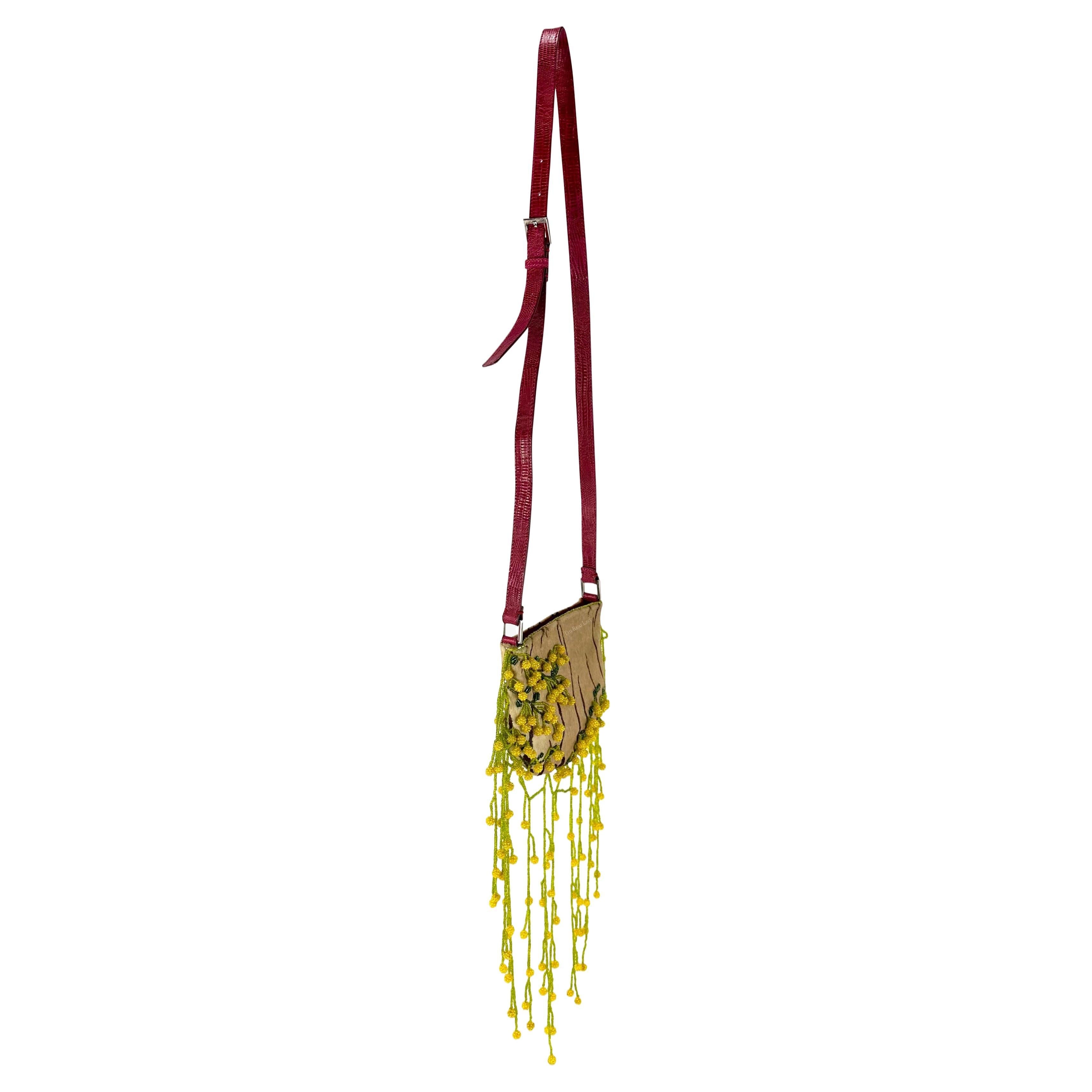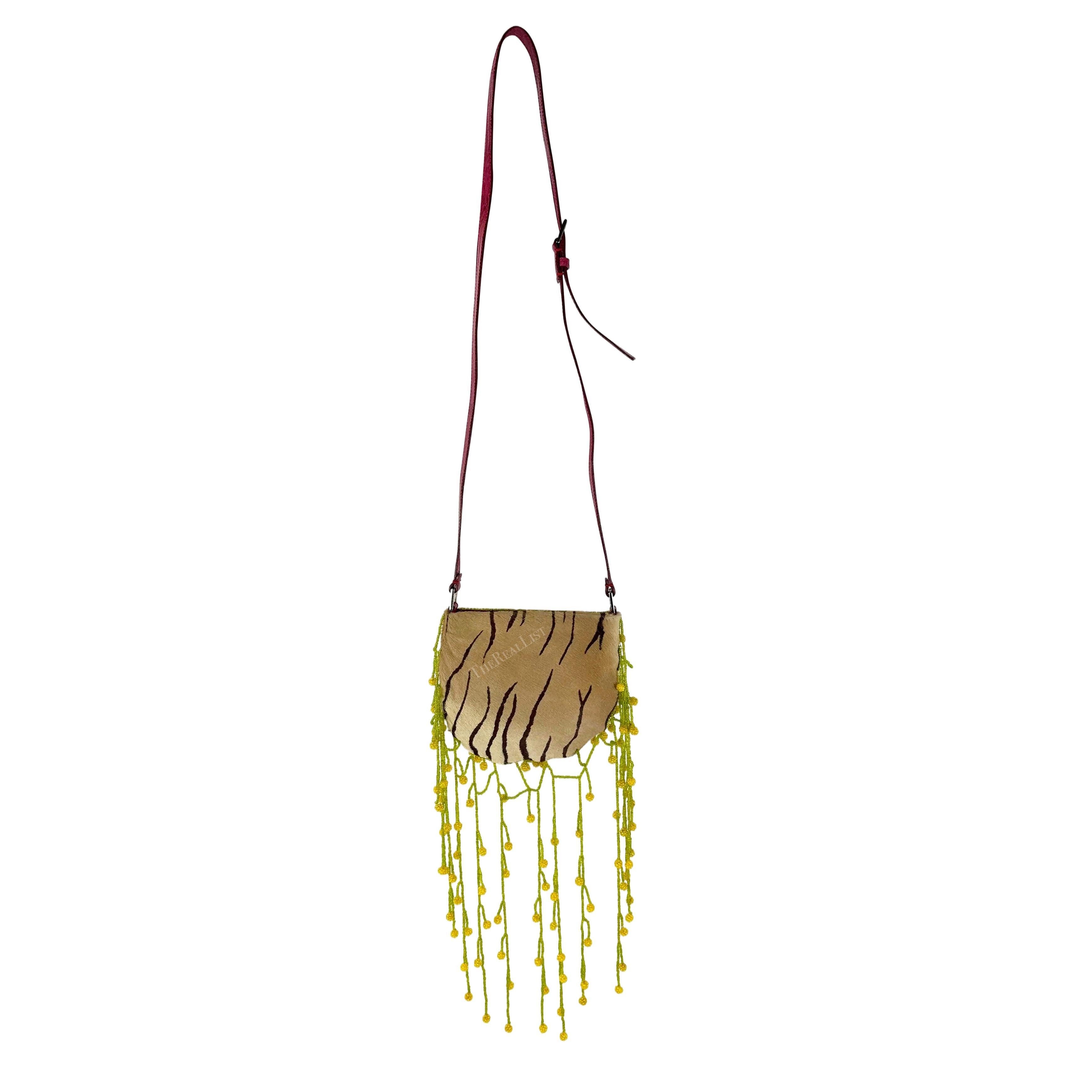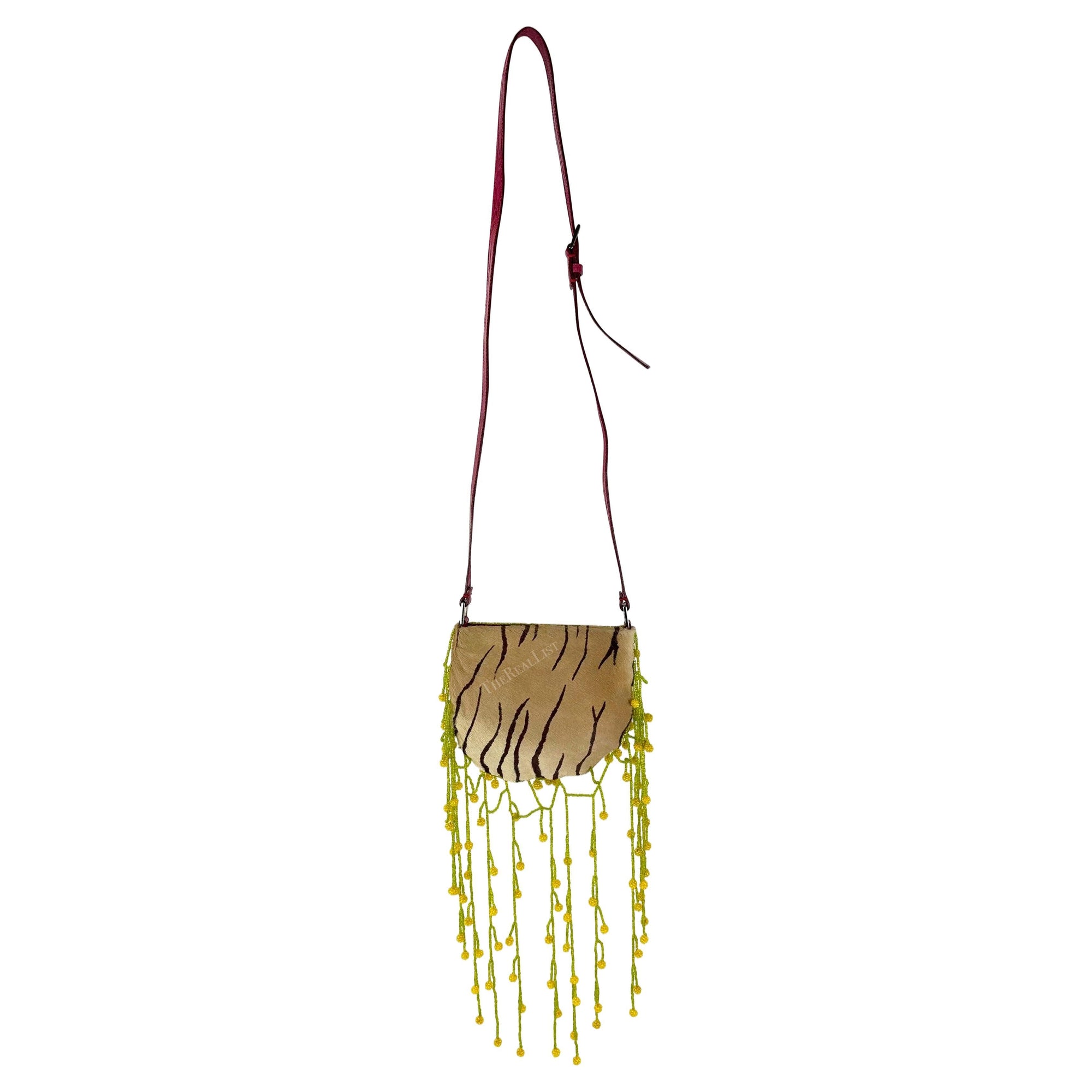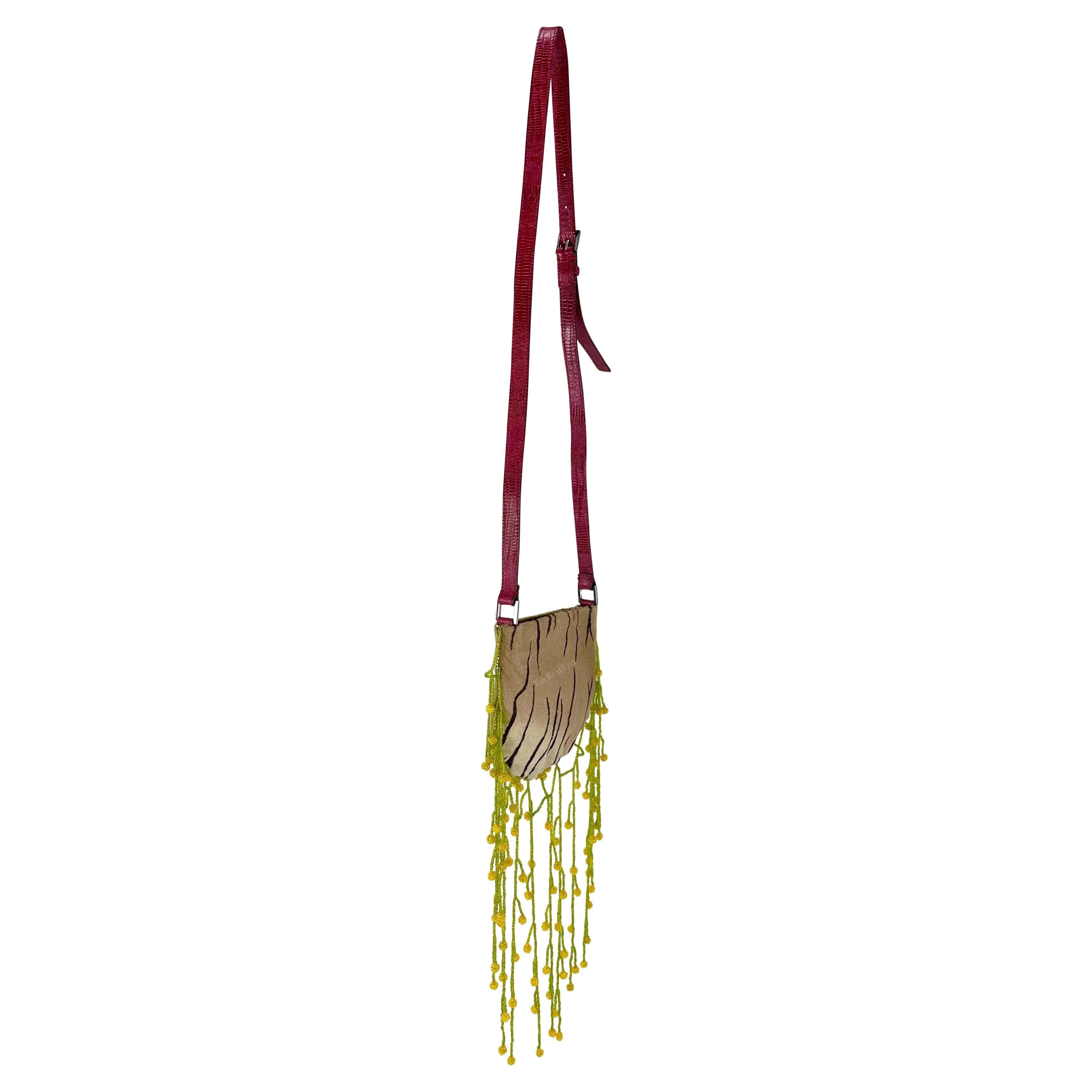 Introducing a fabulous tan pony hair shoulder bag by Valentino from the Spring/Summer 2000 collection. This small bag appeared in multiple versions on the season's runway The bag features a red genuine lizard skin strap, striped pony hair style cowhide body, and intricately beaded floral accents that fall off the bag creating an intricate fringe.