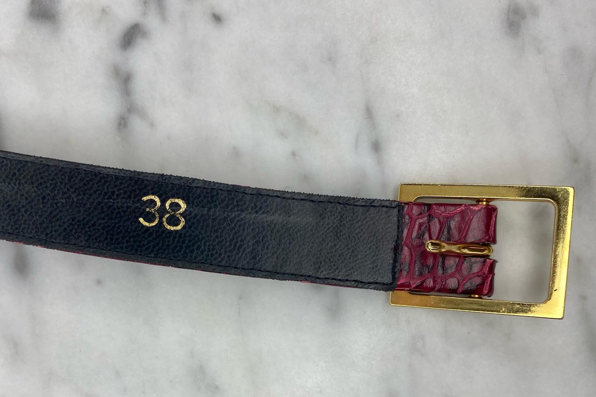 Presenting a watercolor tie-dye three-piece blouse belt and skirt set. The zip-up blouse is constructed of sheer mesh and features a 'D' shaped initial zipper pull, two pockets at the bust, and a sheer chiffon collar. The skirt is constructed of layered silk chiffon in beautiful orange and red tie-dye and has a matching burgundy embossed belt.