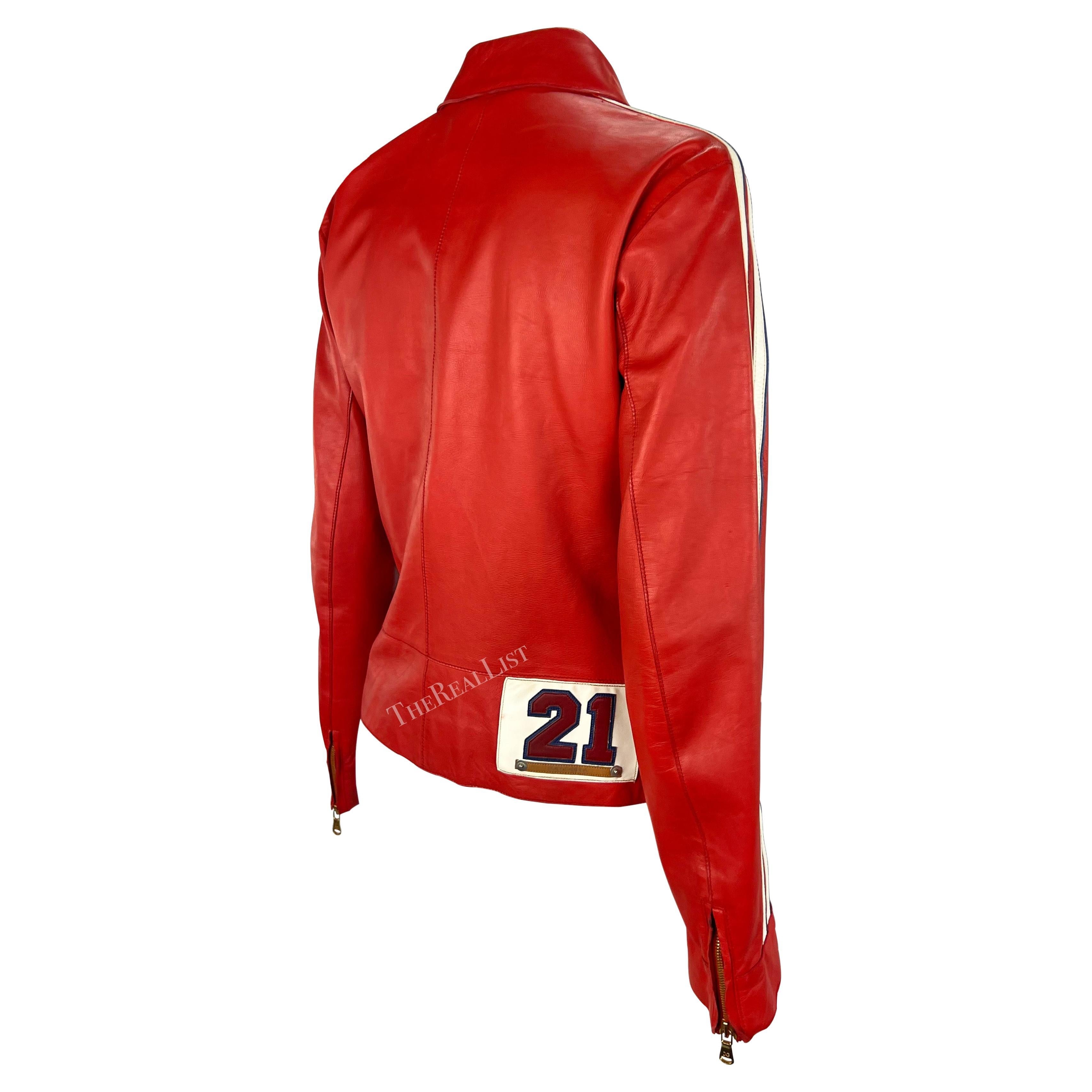 Presenting a chic red leather Dolce & Gabbana moto jacket. From the Spring/Summer 2001 collection, this jacket features a fold-over collar, white stripes that run along the arms, and a small '21' accent at the back. The jacket is made complete with a gold-tone zipper closure at the front with matching zippers at the front pockets and cuffs. Add this fabulous Dolce & Gabbana vintage motto jacket to your wardrobe!