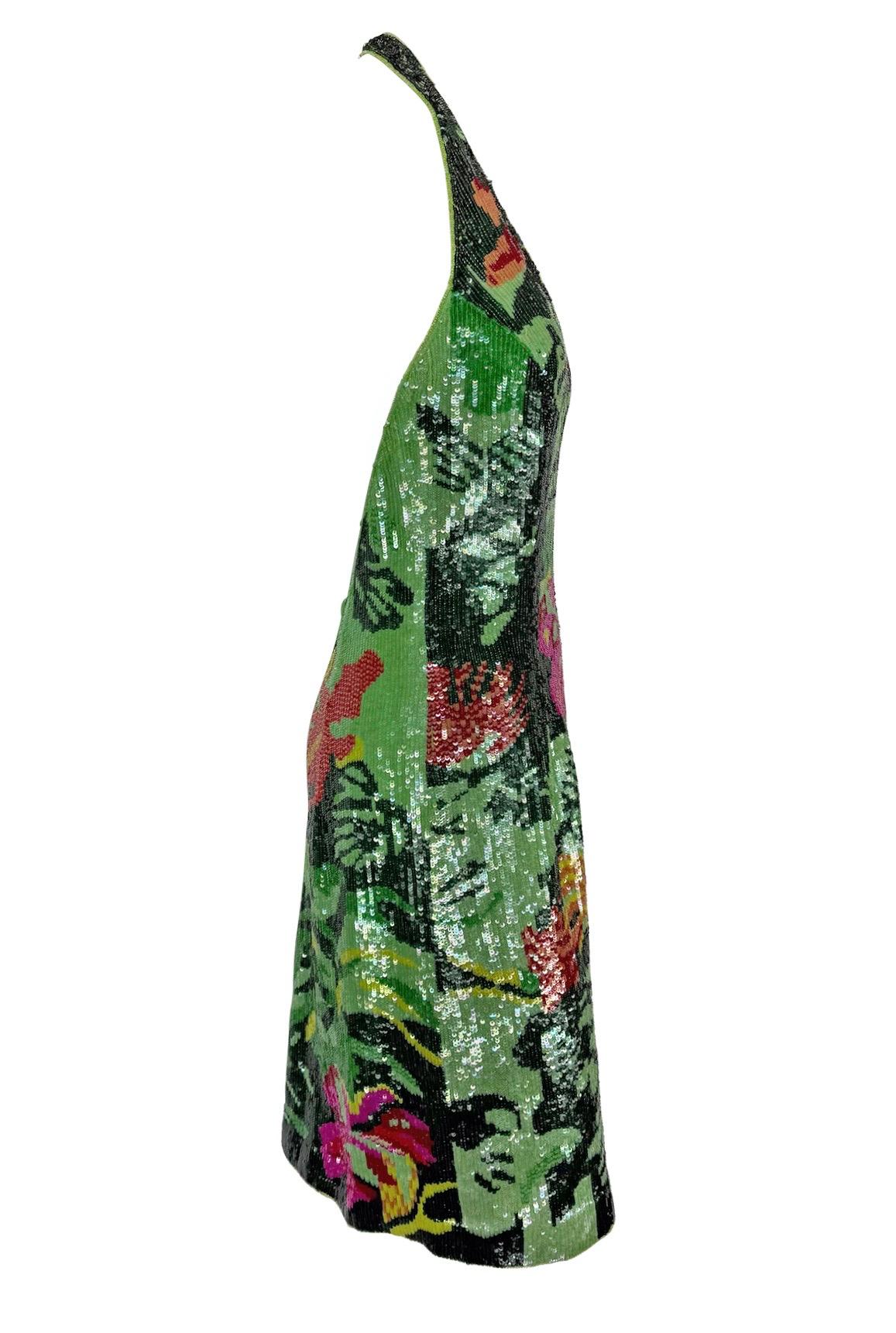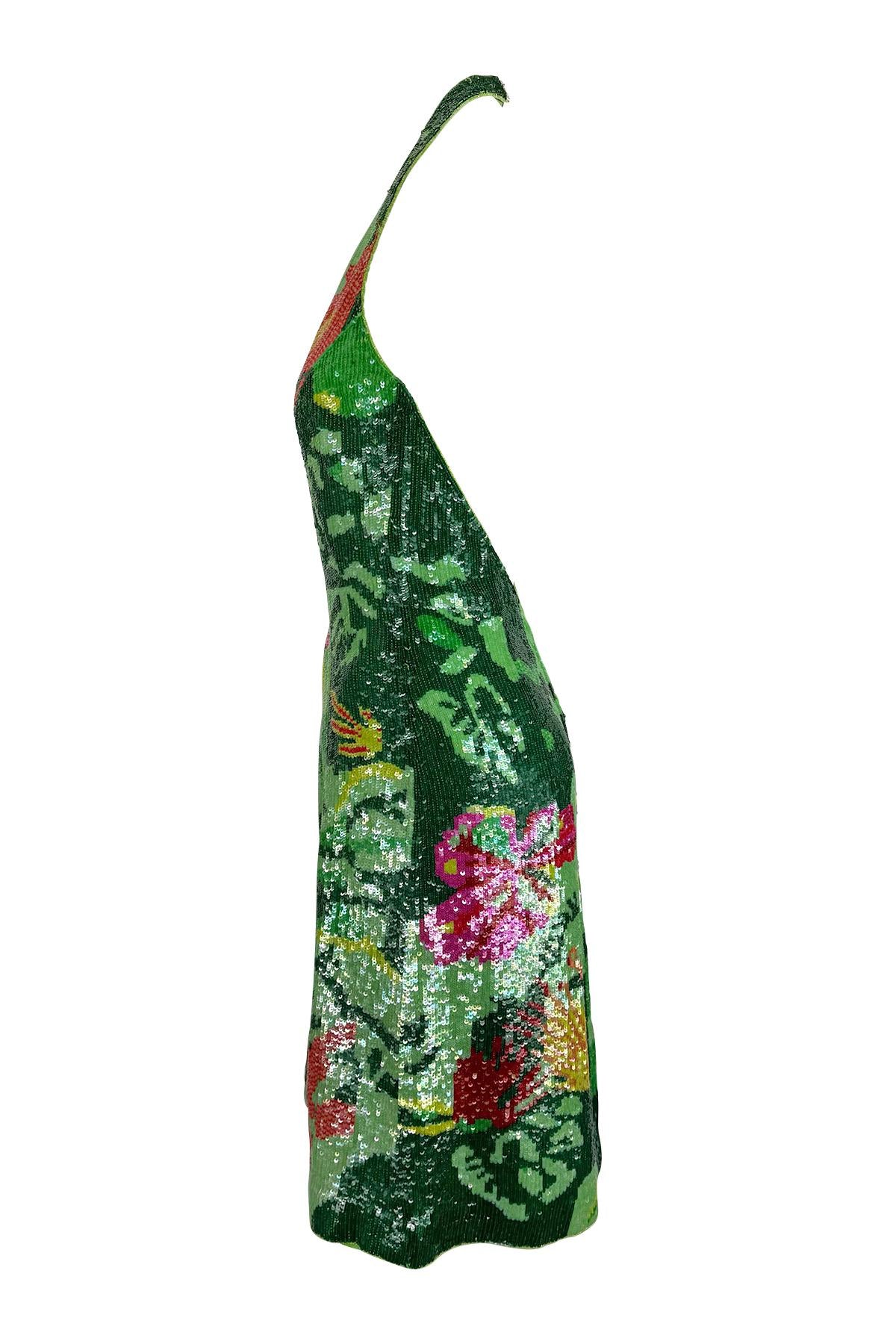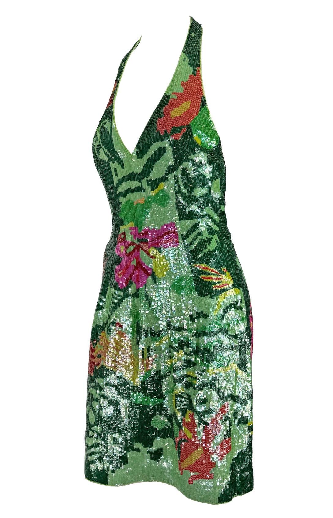 From Escada’s Spring/Summer 2001 collection, this vibrant halter dress is covered entirely in shimmering green sequins and adorned with a bold tropical floral motif in tones of fuchsia, red, orange, and yellow. Featuring a plunging neckline and open back, the eye-catching silhouette is the ultimate summer time dress.