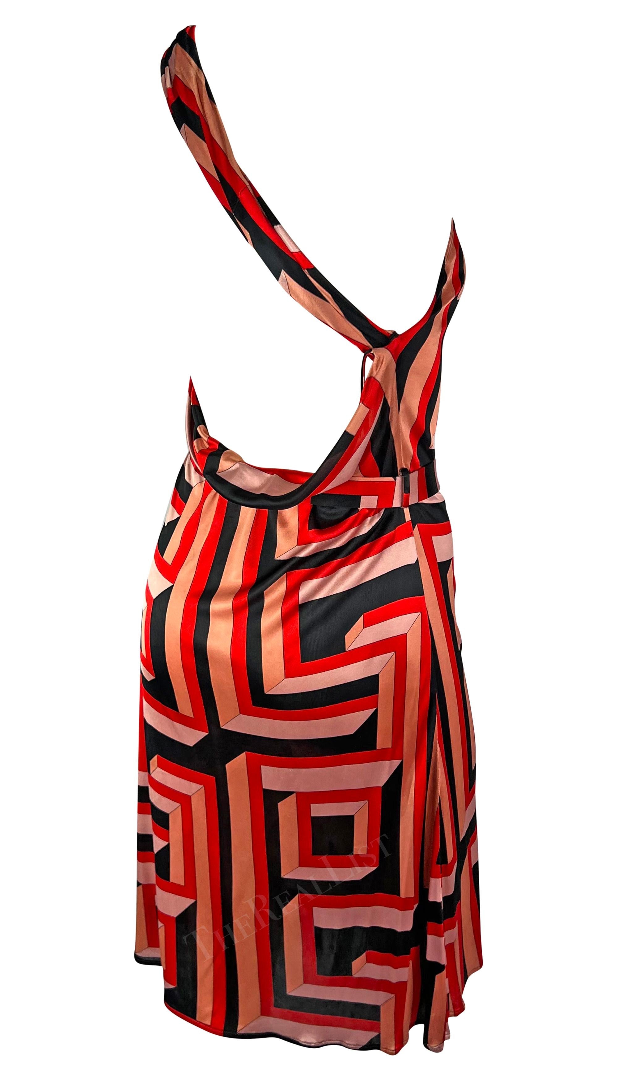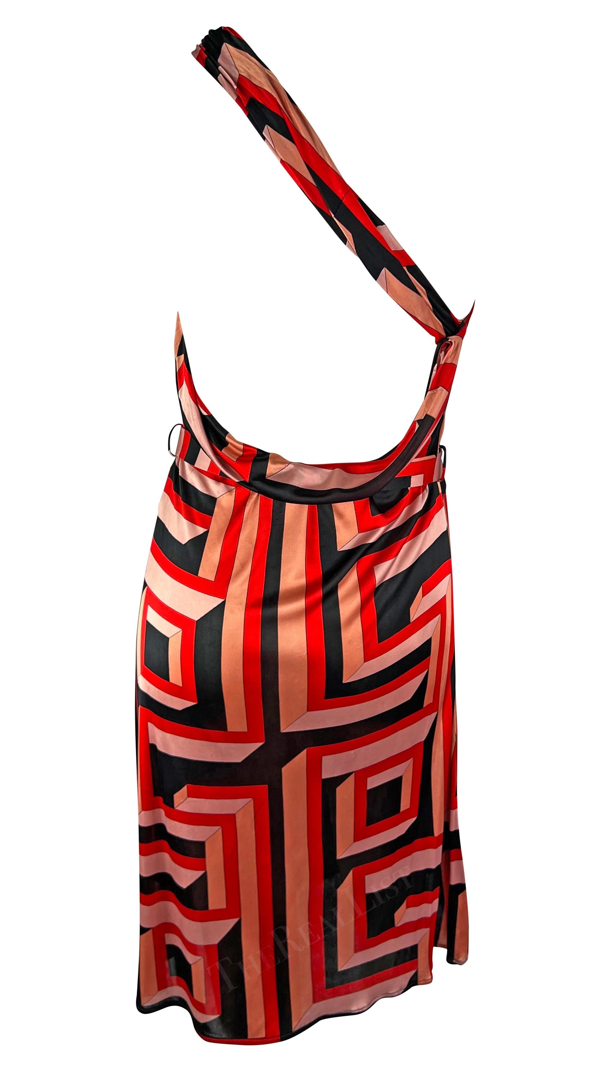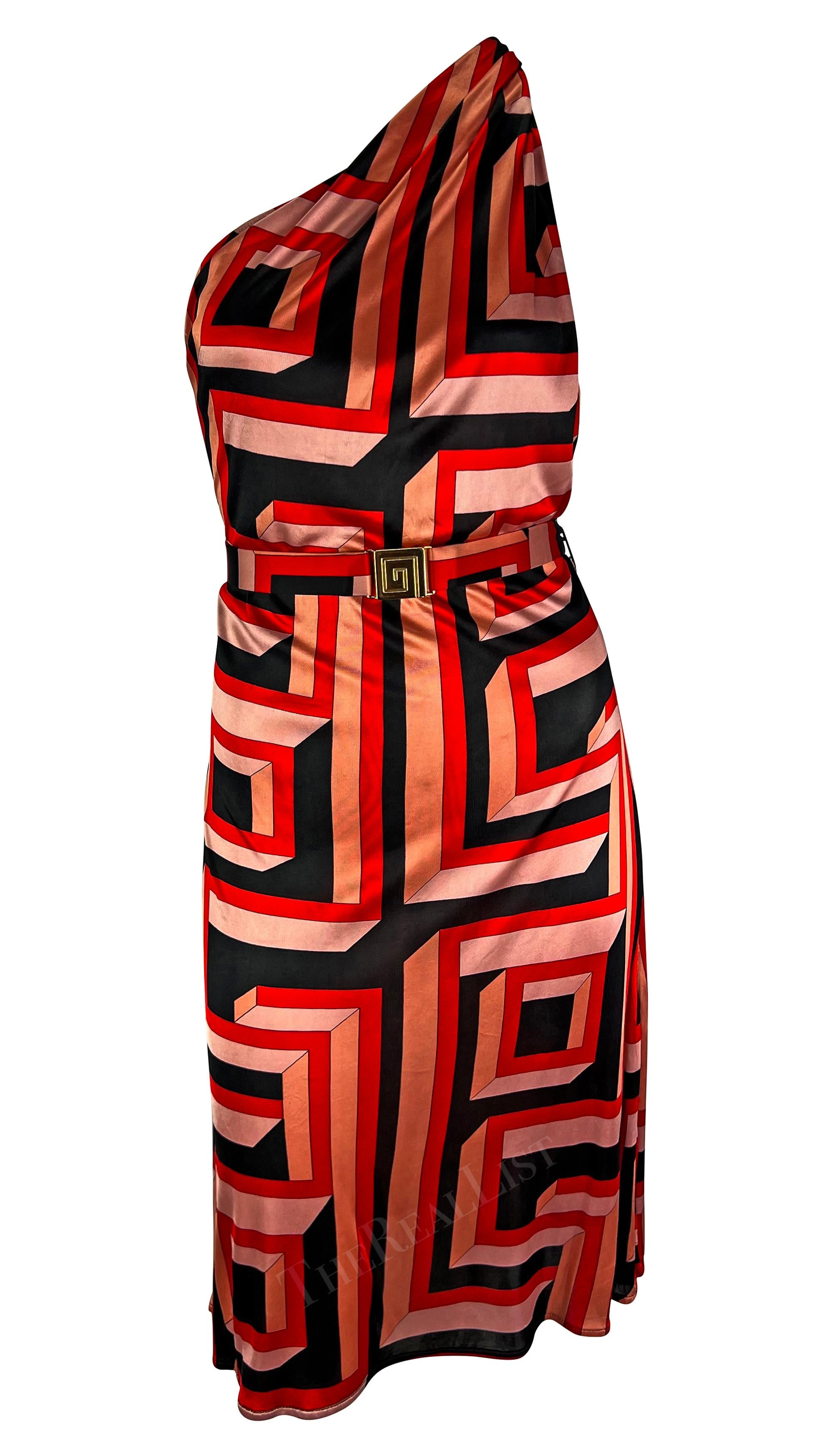 Presenting a chic red and black Greek key Gianni Versace mini dress, designed by Donatella Versace. From the Spring/Summer 2001 collection, this single-shoulder asymmetric dress is covered in a large red Greek key pattern. The single shoulder strap extends over the exposed back. The dress is made complete with a light cowl detail at the back and a matching waist belt with a gold-tone Greek key buckle.