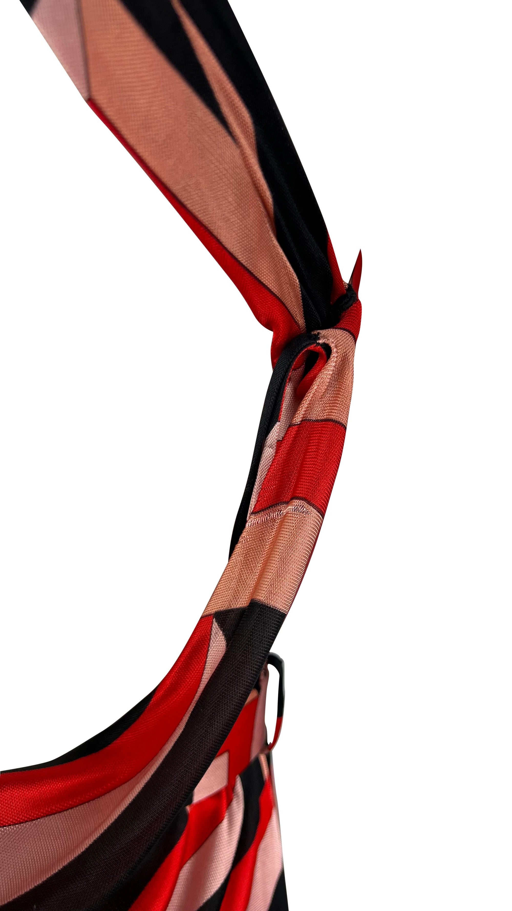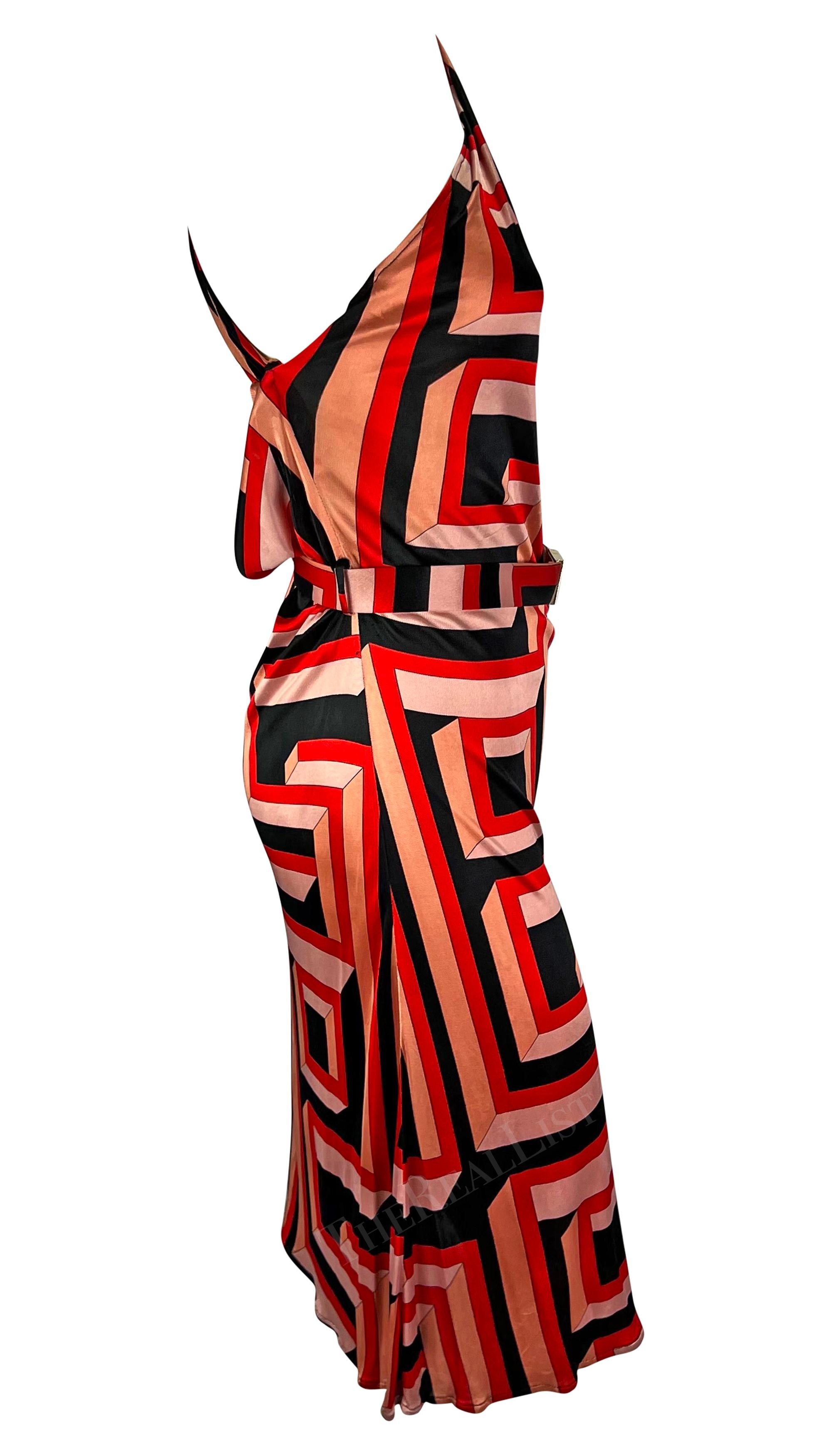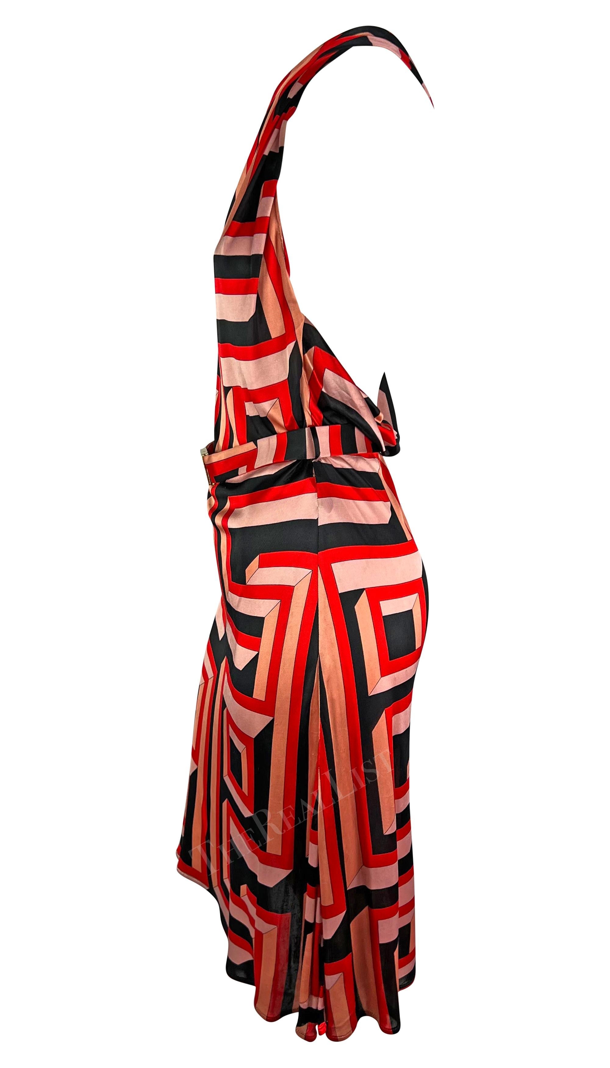 Presenting a chic red and black Greek key Gianni Versace mini dress, designed by Donatella Versace. From the Spring/Summer 2001 collection, this single-shoulder asymmetric dress is covered in a large red Greek key pattern. The single shoulder strap extends over the exposed back. The dress is made complete with a light cowl detail at the back and a matching waist belt with a gold-tone Greek key buckle.