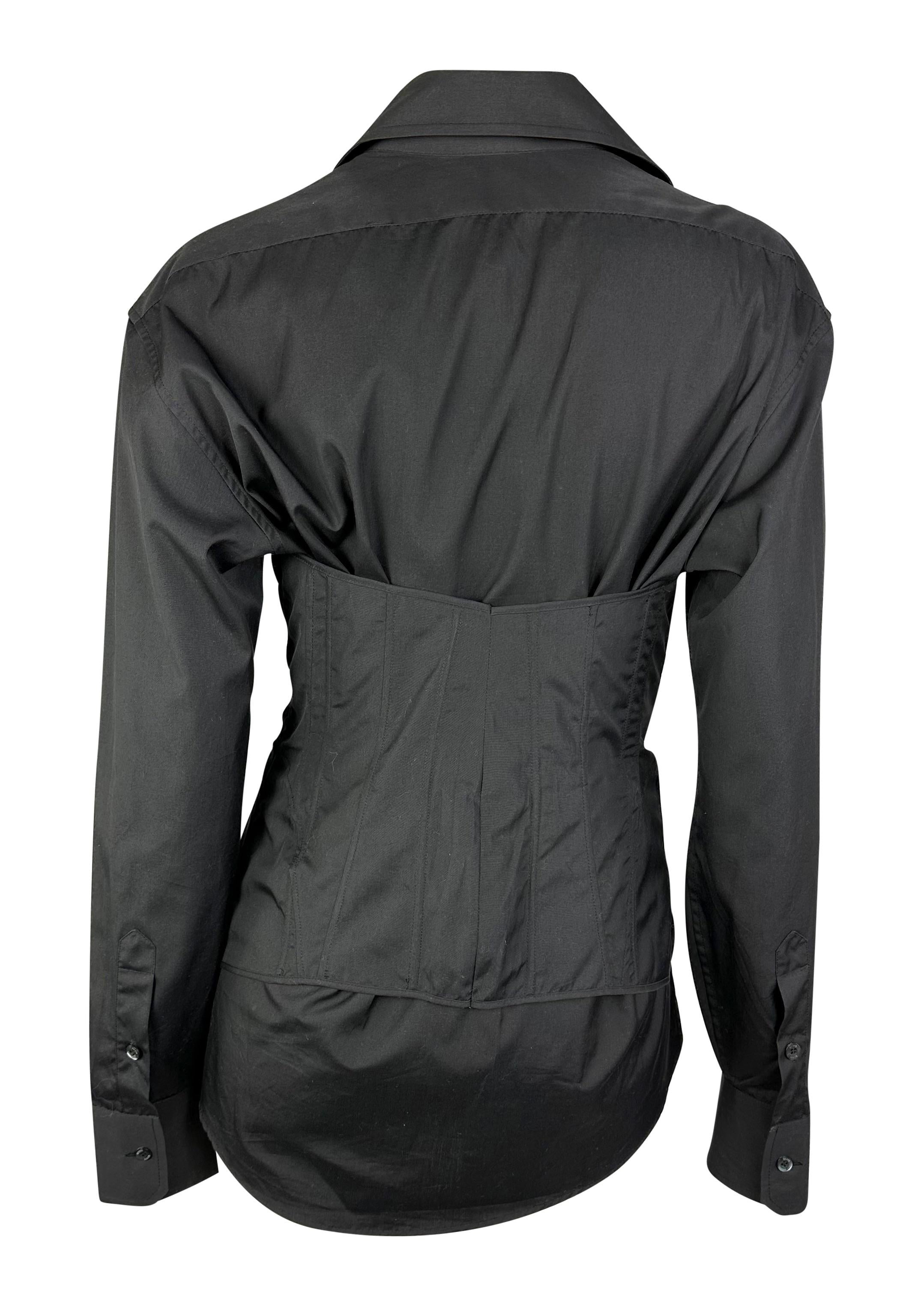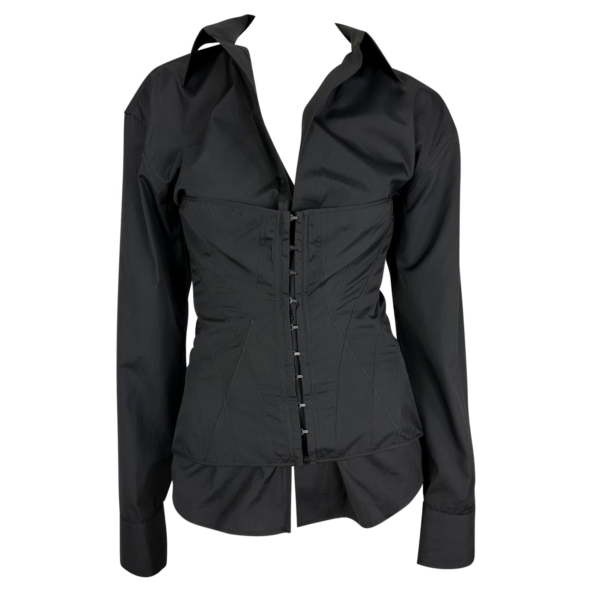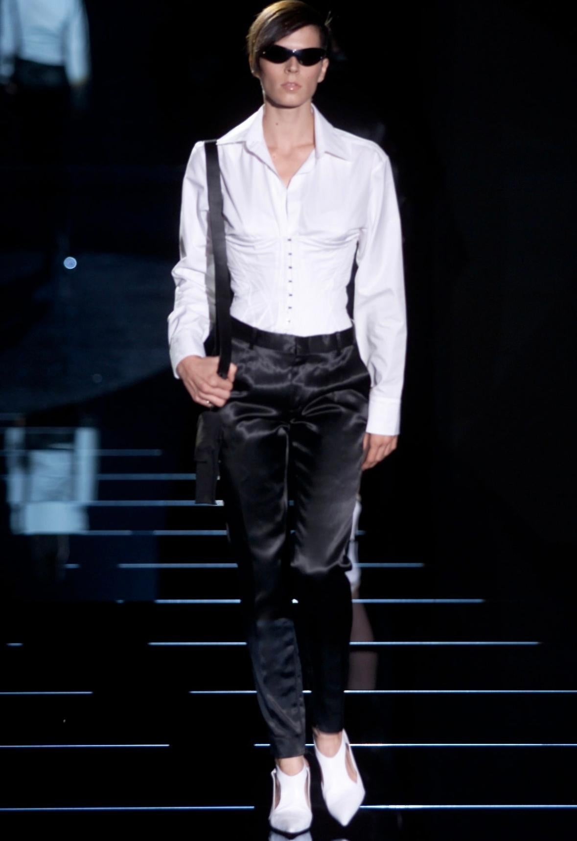 Presenting an incredible Gucci collared corset top, designed by Tom Ford for Gucci's Spring/Summer 2001 collection. Versions of this fabulous top debuted on runway looks 13 and 19 and were highlighted in the season's ad campaign, modeled by Kate Moss. This top features a classic collared shirt silhouette instantly elevated with an attached external corset. The top does not have the standard button-down closure creating a free-flowing plunging neckline. This punk chic top is a must-have for any Gucci by Tom Ford lover!