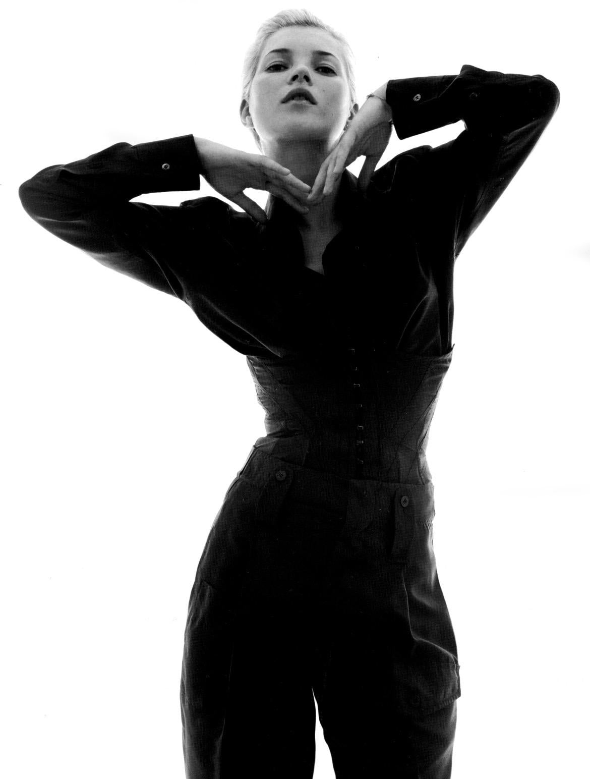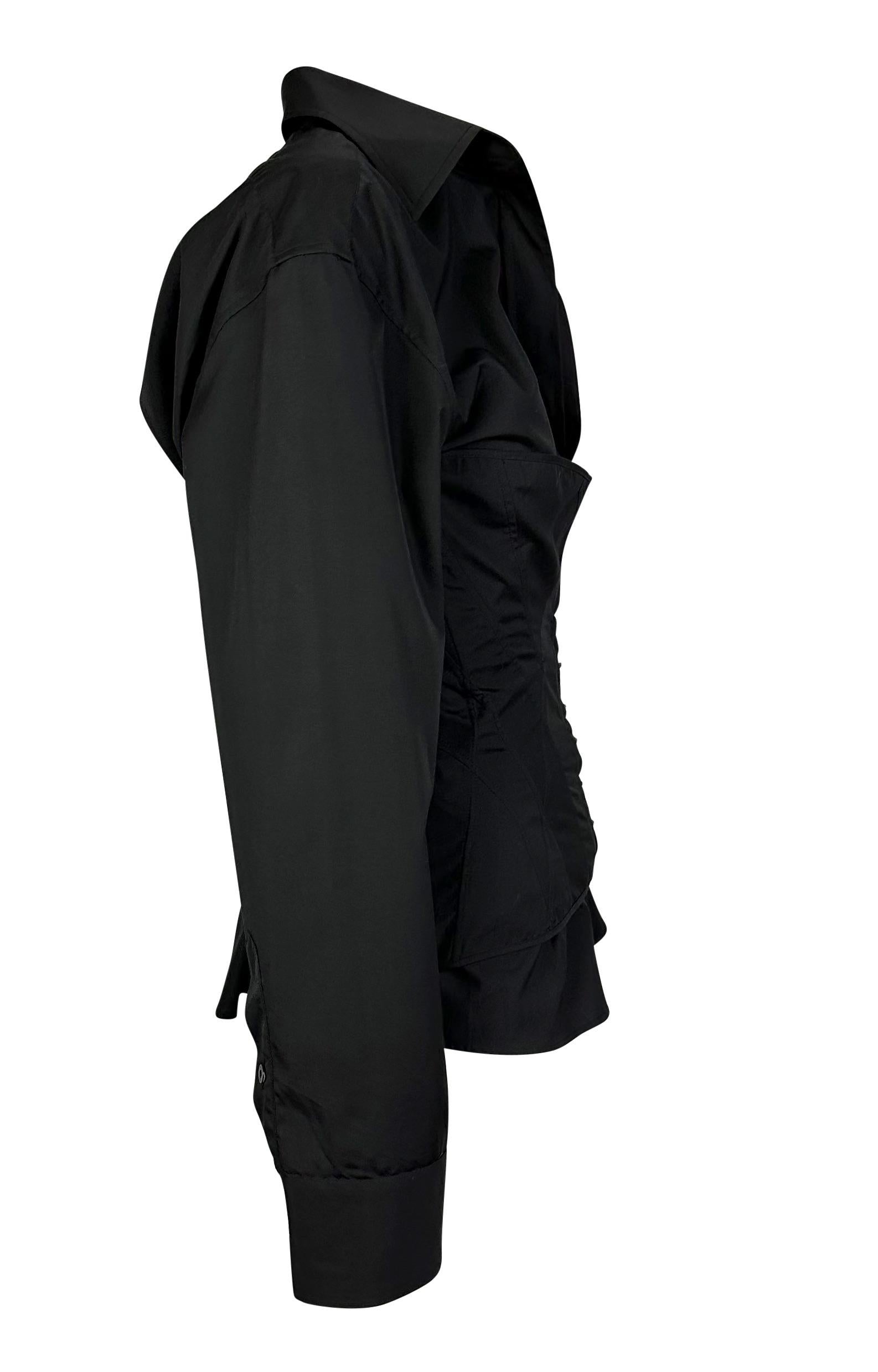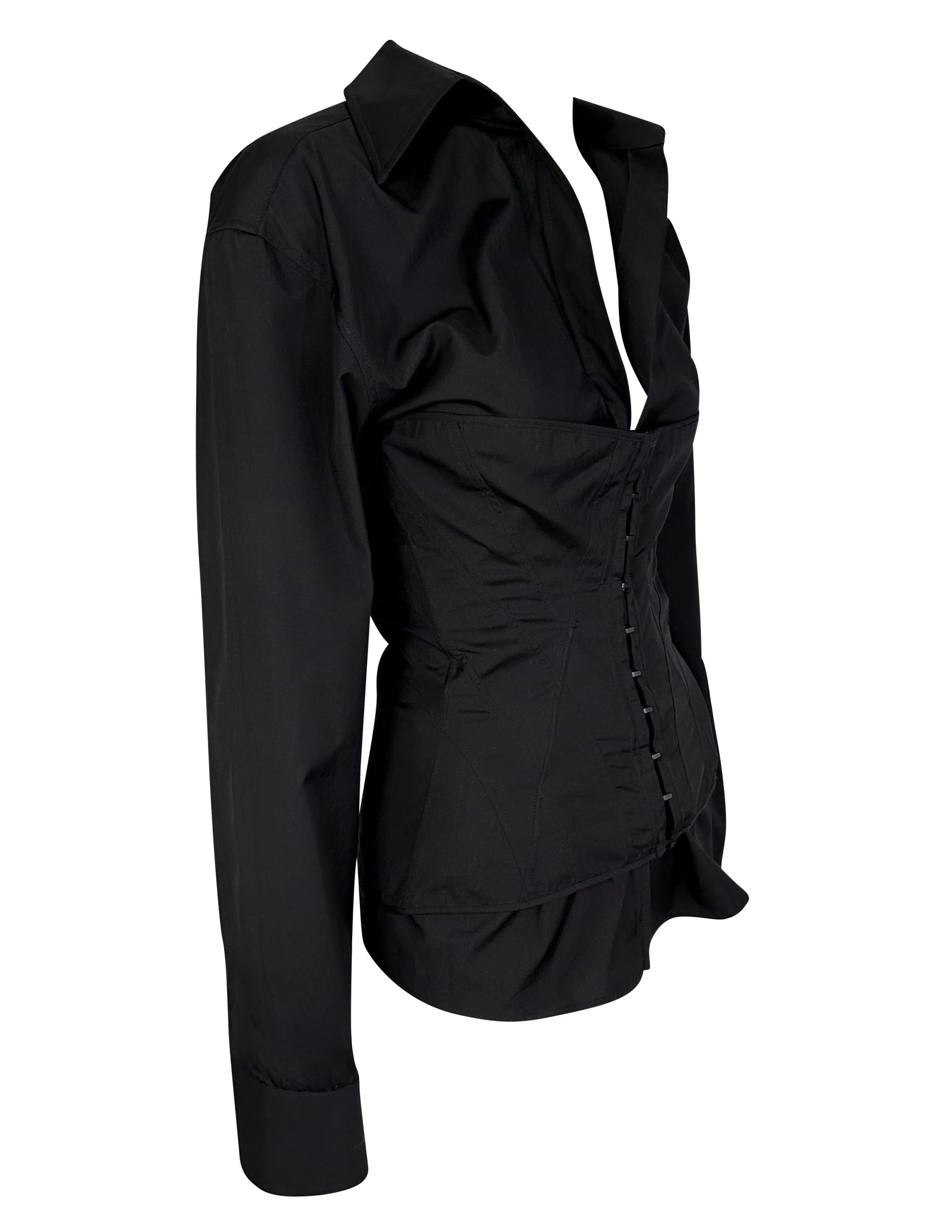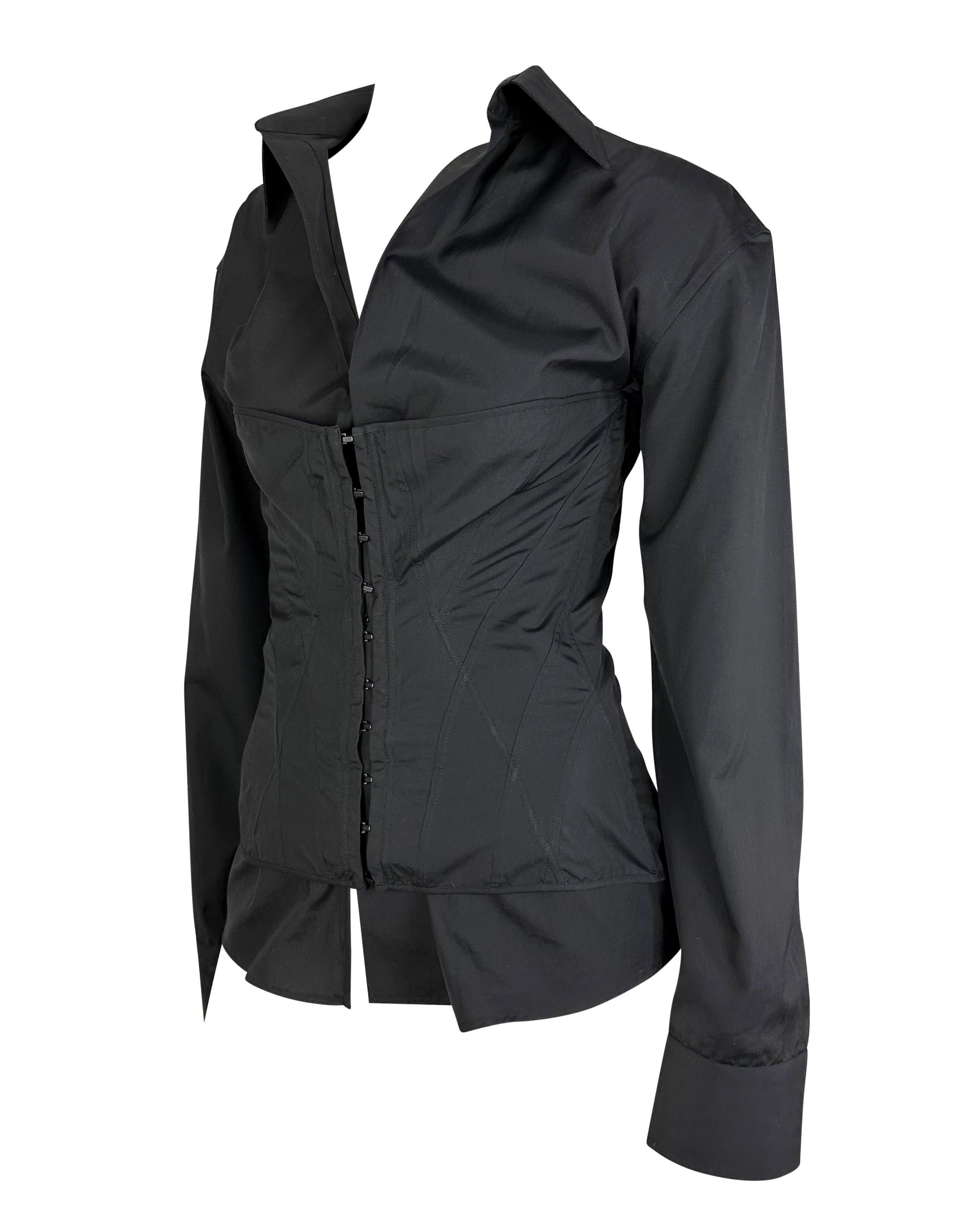 Presenting an incredible Gucci collared corset top, designed by Tom Ford for Gucci's Spring/Summer 2001 collection. Versions of this fabulous top debuted on runway looks 13 and 19 and were highlighted in the season's ad campaign, modeled by Kate Moss. This top features a classic collared shirt silhouette instantly elevated with an attached external corset. The top does not have the standard button-down closure creating a free-flowing plunging neckline. This punk chic top is a must-have for any Gucci by Tom Ford lover!