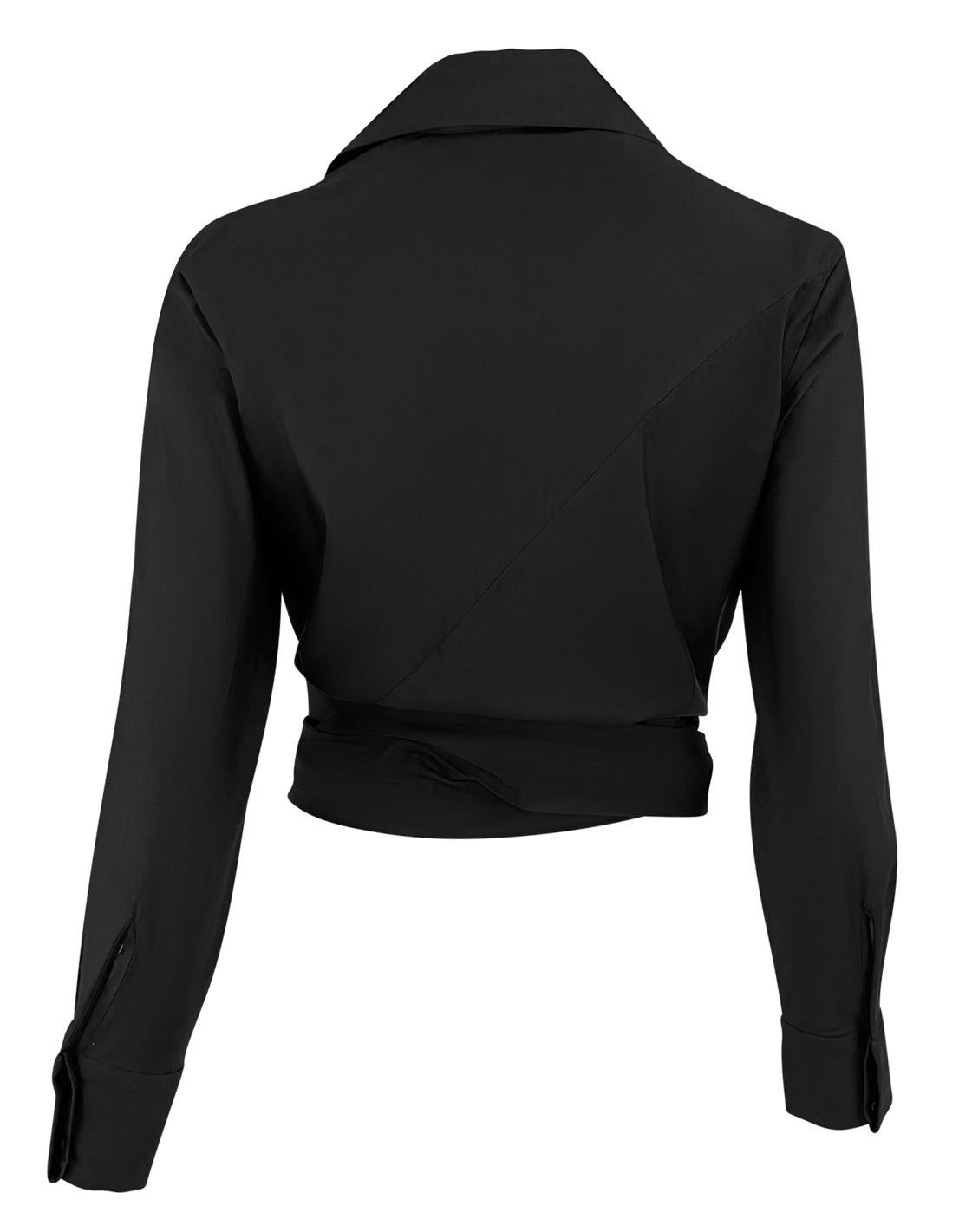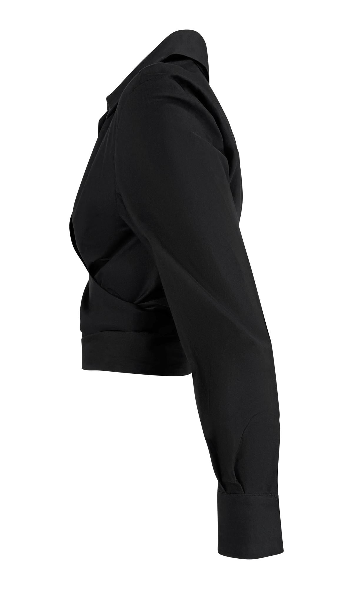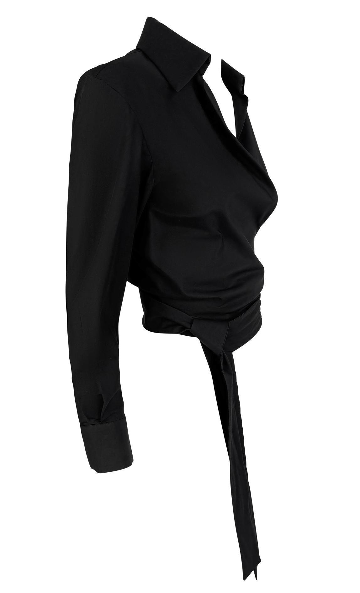 From Gucci’s Spring/Summer 2001 collection under Tom Ford, this black cotton crop top features a deep plunging neckline, structured collar, and an asymmetrical wrap silhouette that ties at the waist.