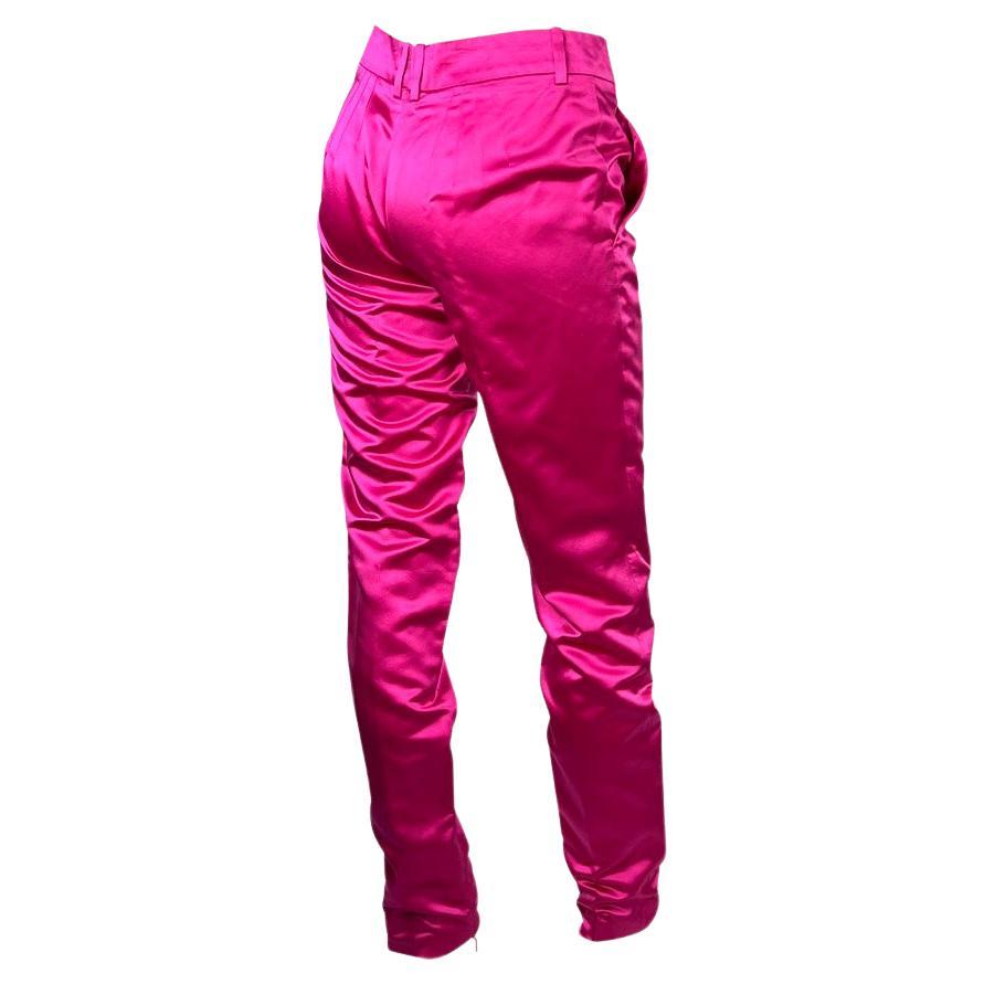 Presenting a pair of hot, hot pink satin Gucci pants designed by Tom Ford. These incredible pants debuted on the Spring/Summer 2001 runway on Look 23, modeled by Anouck Lepère. Constructed entirely of lustrous satin silk, the pants glisten with every movement. The trousers feature pleating at the back as well as zippers at the ankles, which allow for a tapered fit. These pants are incredible, and they make a statement.