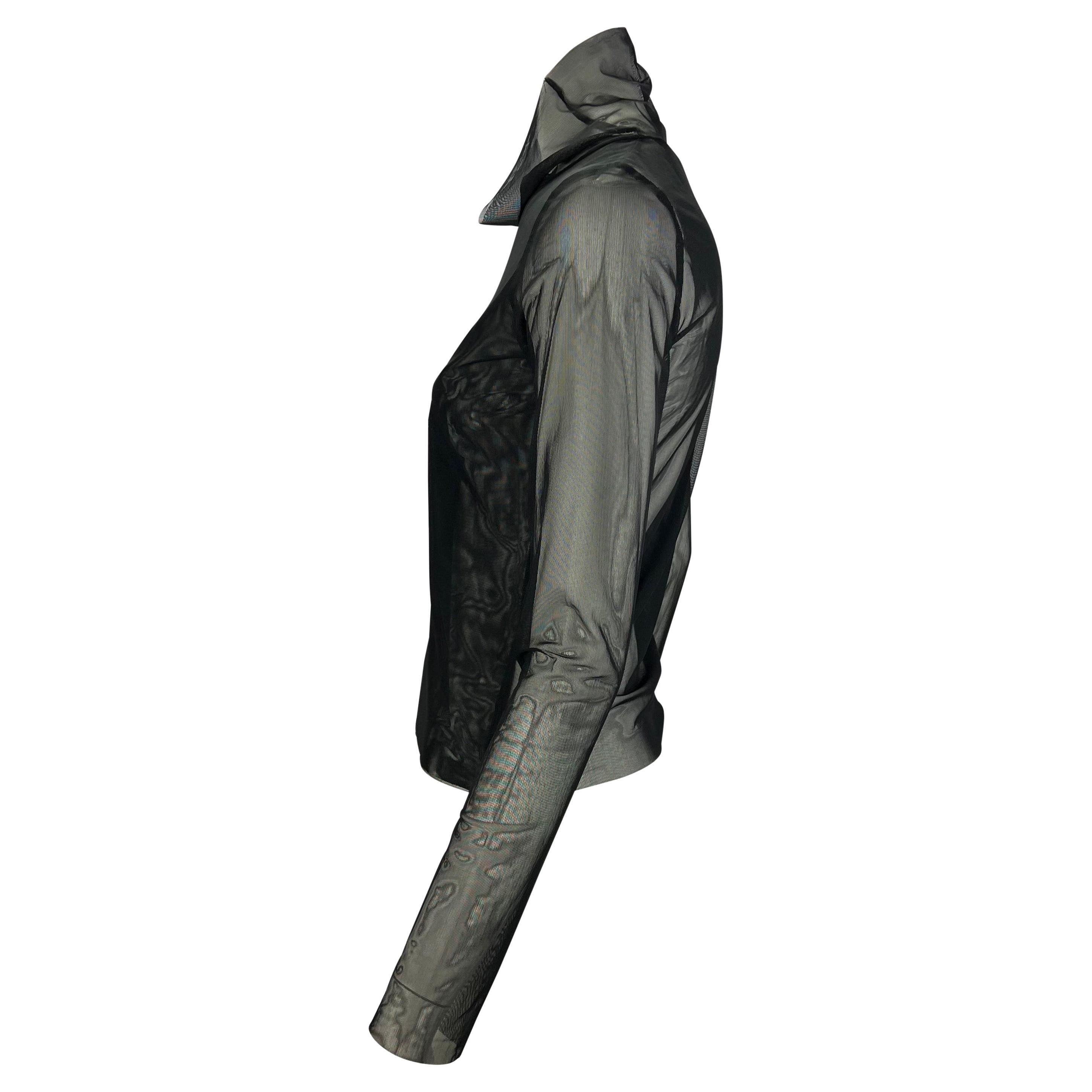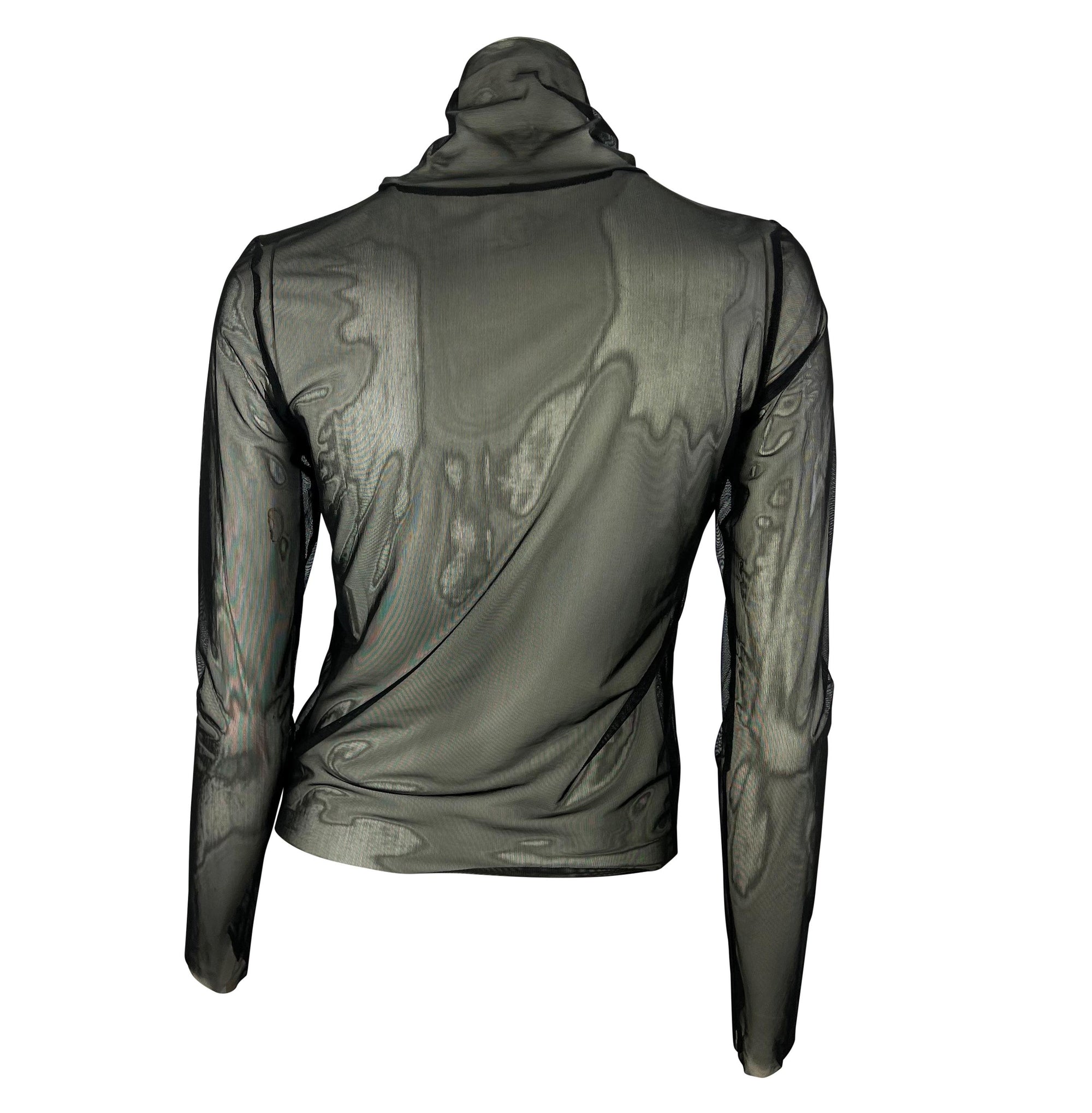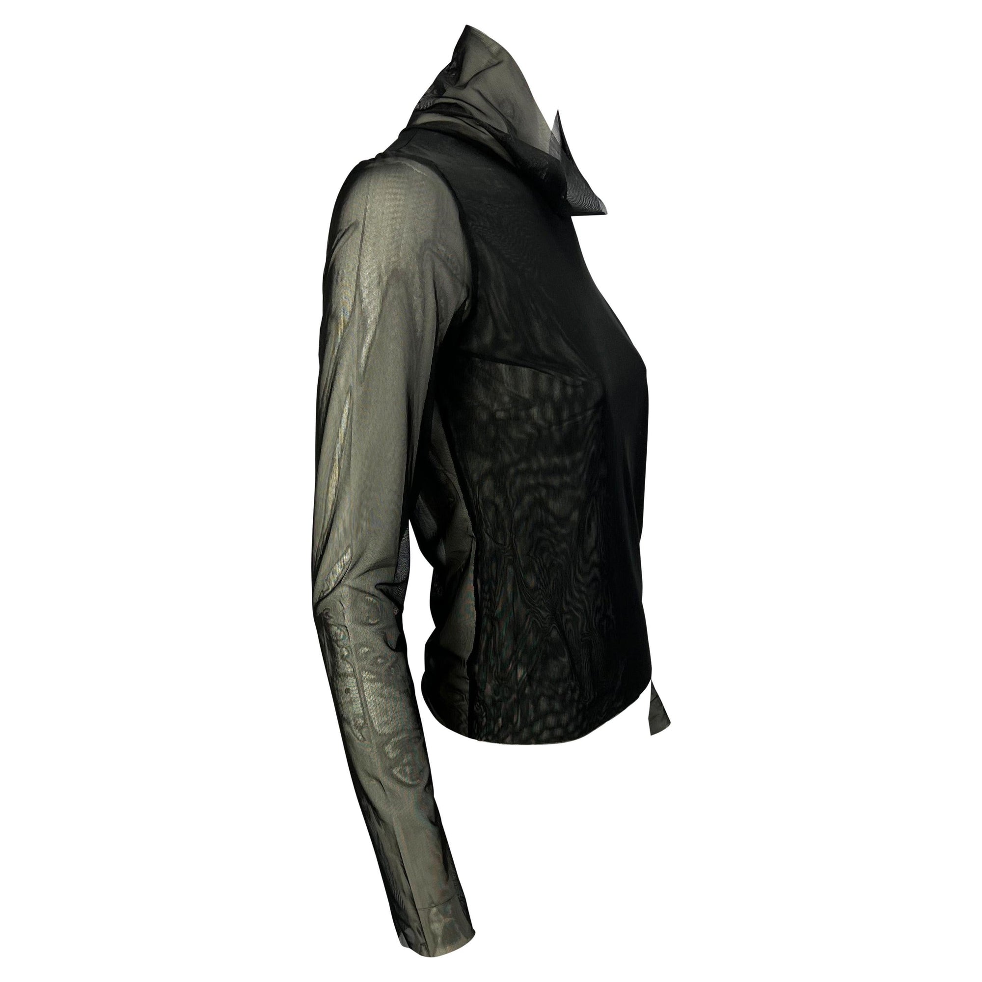 Presenting a black sheer mesh mock neck Gucci shirt, designed by Tom Ford. From the Spring/Summer 2001 collection, this top debuted on the season's runway as part of look 5 modeled by Hannelore Knuts, look 6 modeled by Eleonora Bose, and look 8 modeled by Juliana McCarthy. This entirely sheer top features a double layer of mesh at the front and a wide mock neck which can be fashioned in several ways. This fabulous top can be worn with a bra, slip, or on its own. The incredible crossover bralette as seen with this top on look 8 is available for purchase in black leather and satin in multiple sizes!