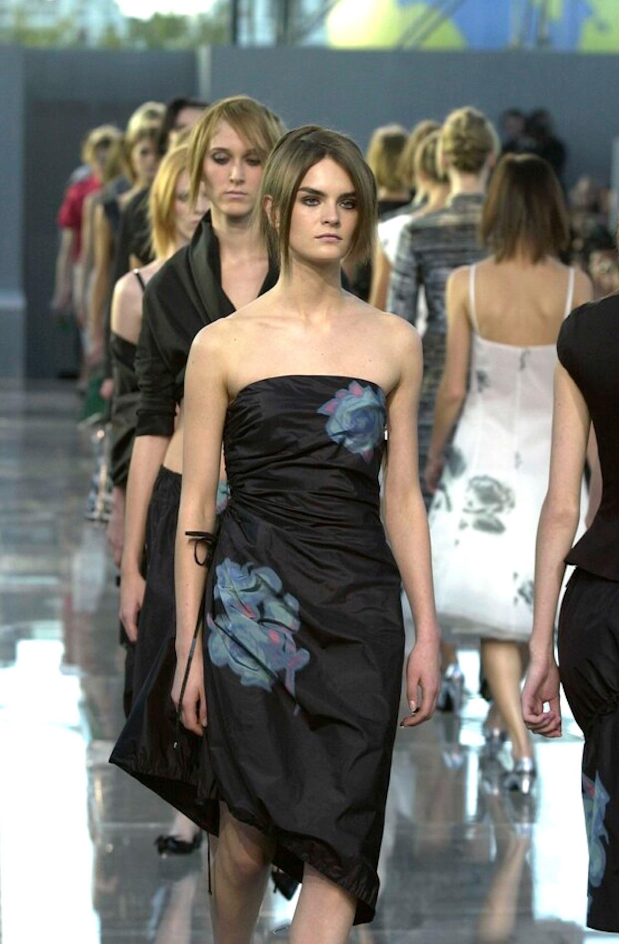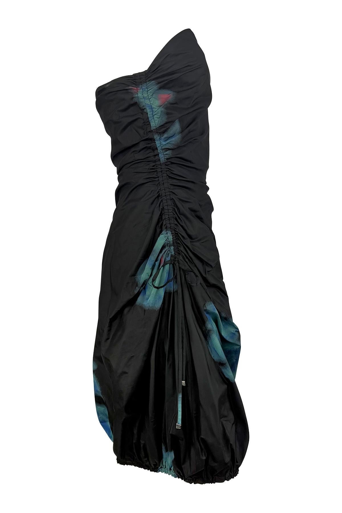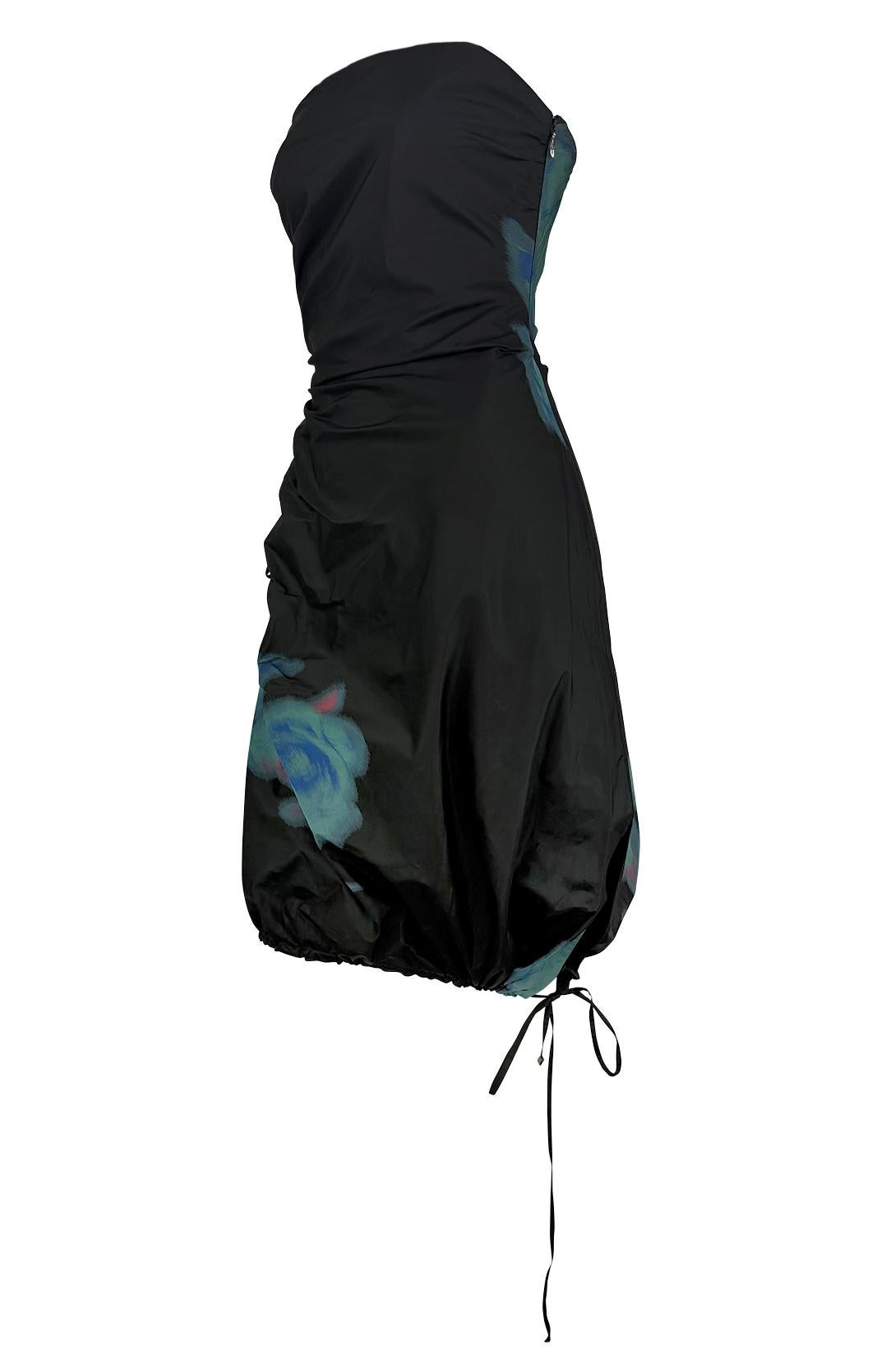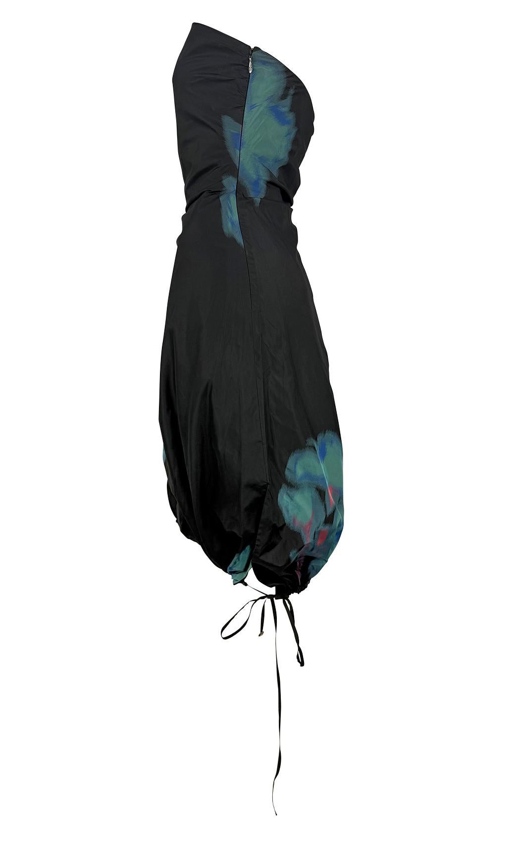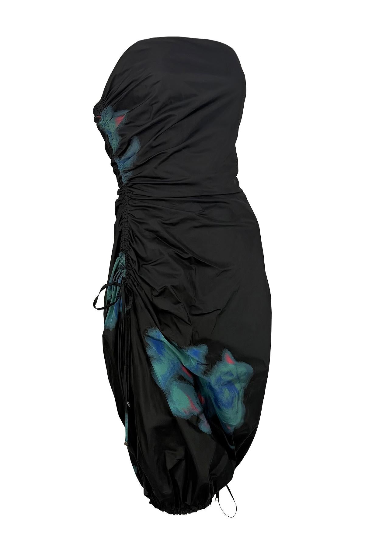 From Louis Vuitton's Spring/Summer 2001 collection by Marc Jacobs, this strapless black dress is crafted from crisp silk taffeta and printed with painterly blue and green floral motifs. Debuting on the season's runway, the design features ruched side seams and adjustable drawstrings at the hem and hip, allowing the silhouette to be customized in volume and length.