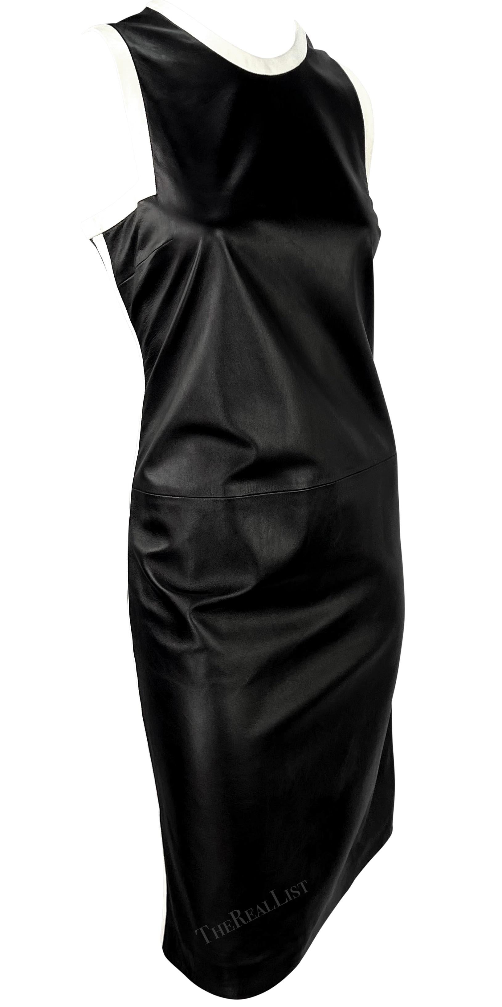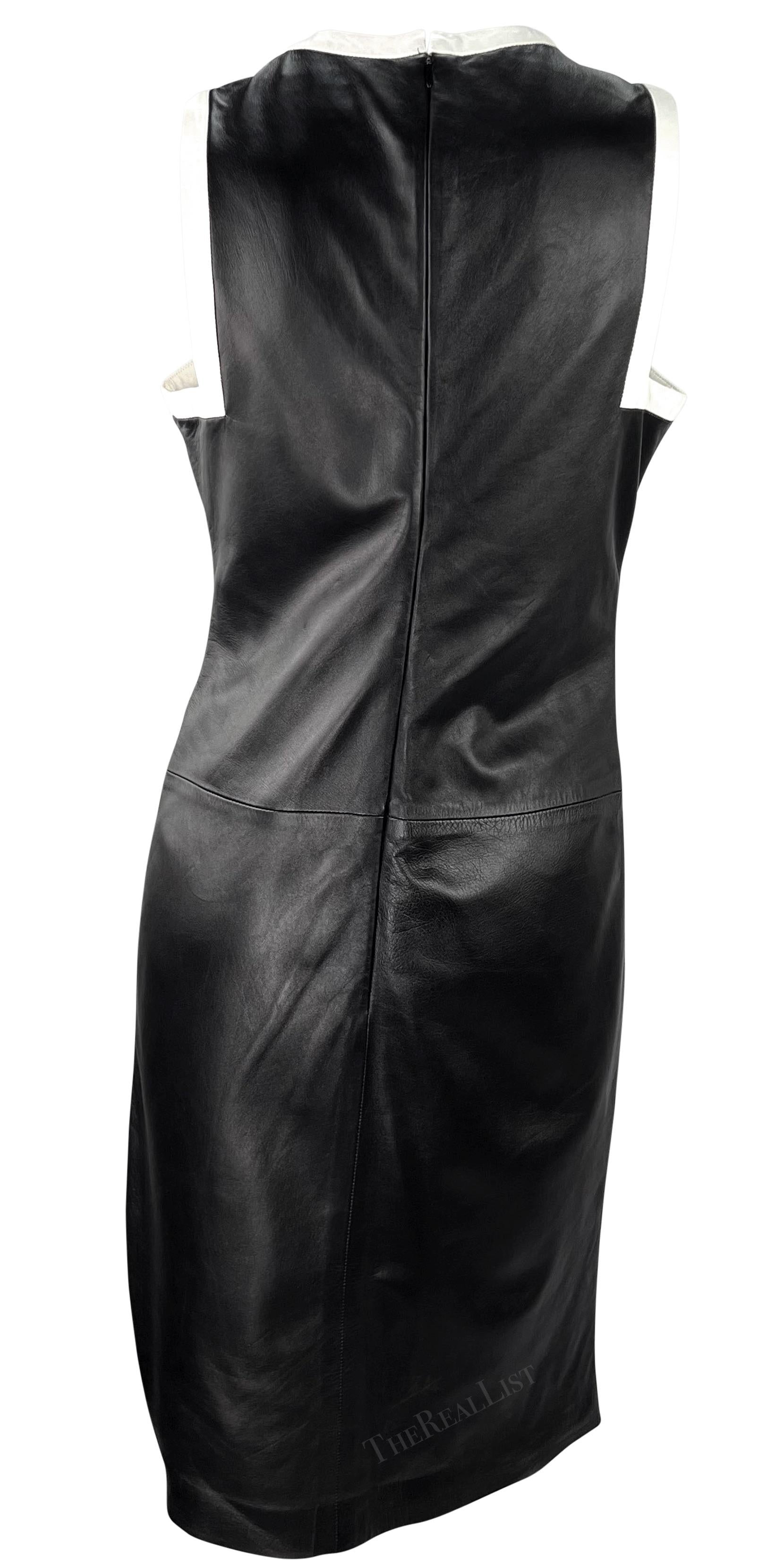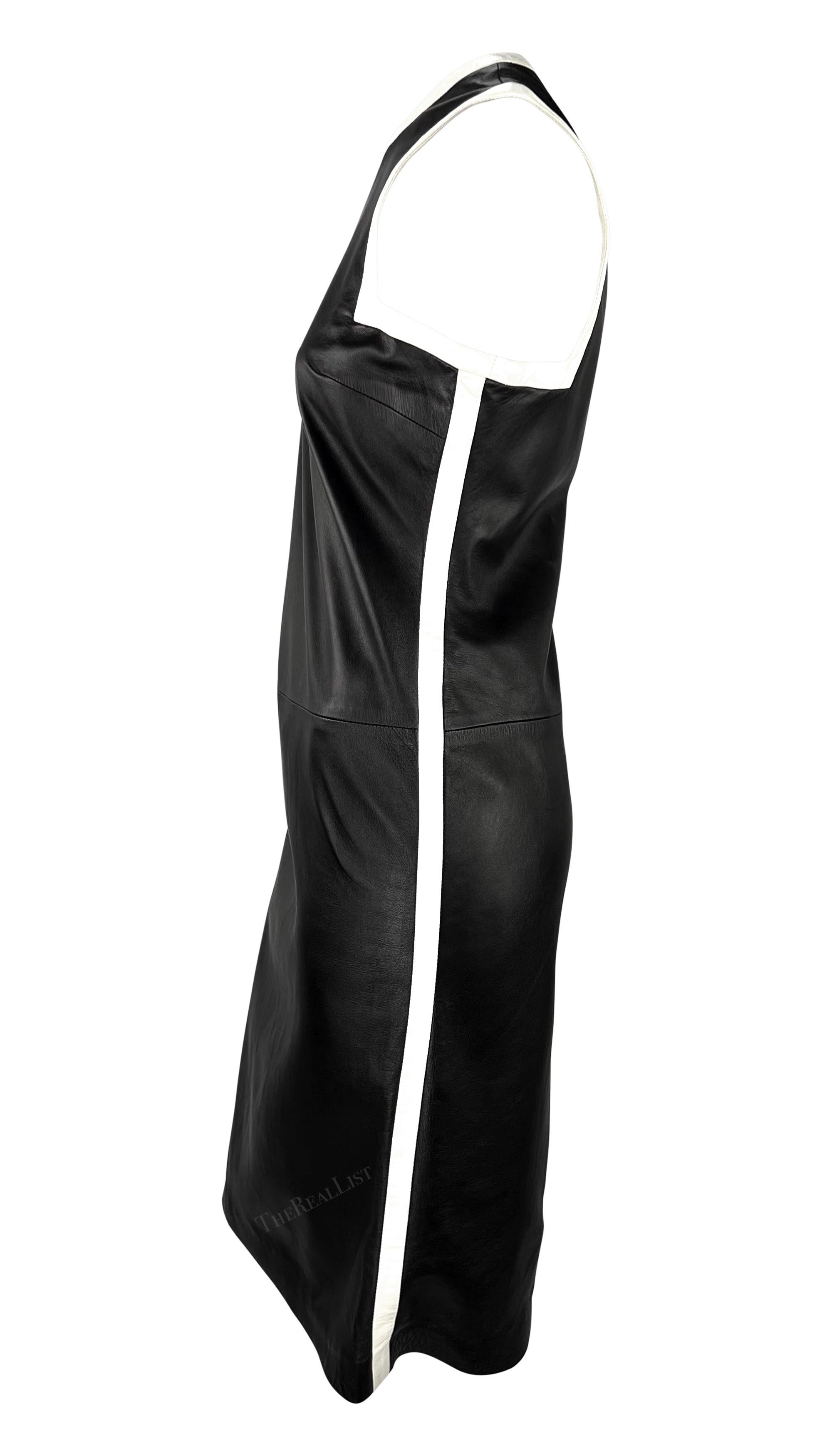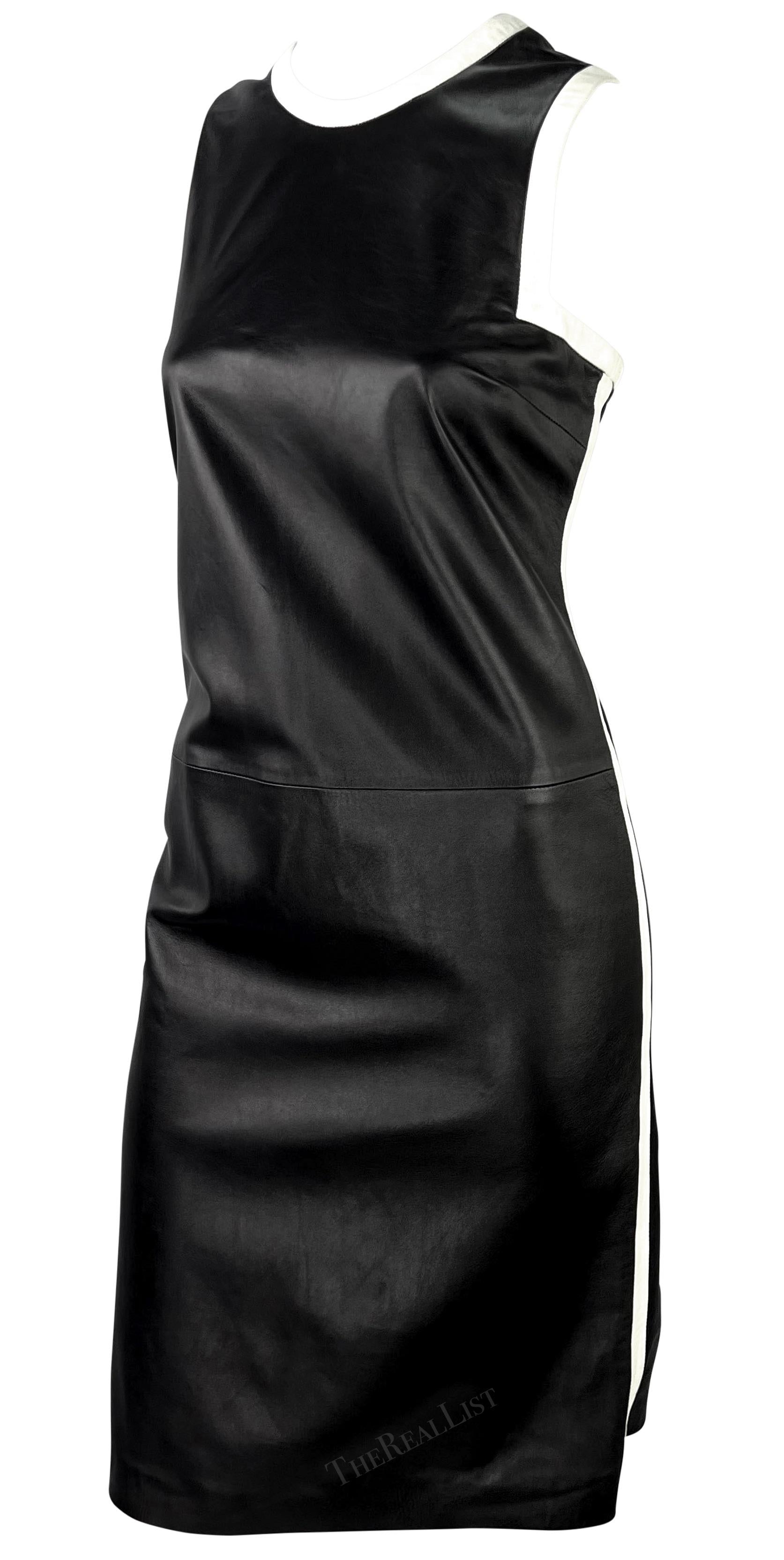 Introducing a stunning black and white leather dress by Ralph Lauren from the Spring/Summer 2001 collection. The inverse colorway of this dress opened the season's runway as look 1, modeled Yfke Sturm. Constructed of soft black leather this dress falls just above the knee. The dress features white accents around the collar/arm holes and down either side. Easily dressed up or down, this vintage Ralph Lauren runway dress is the perfect addition to any refined wardrobe.