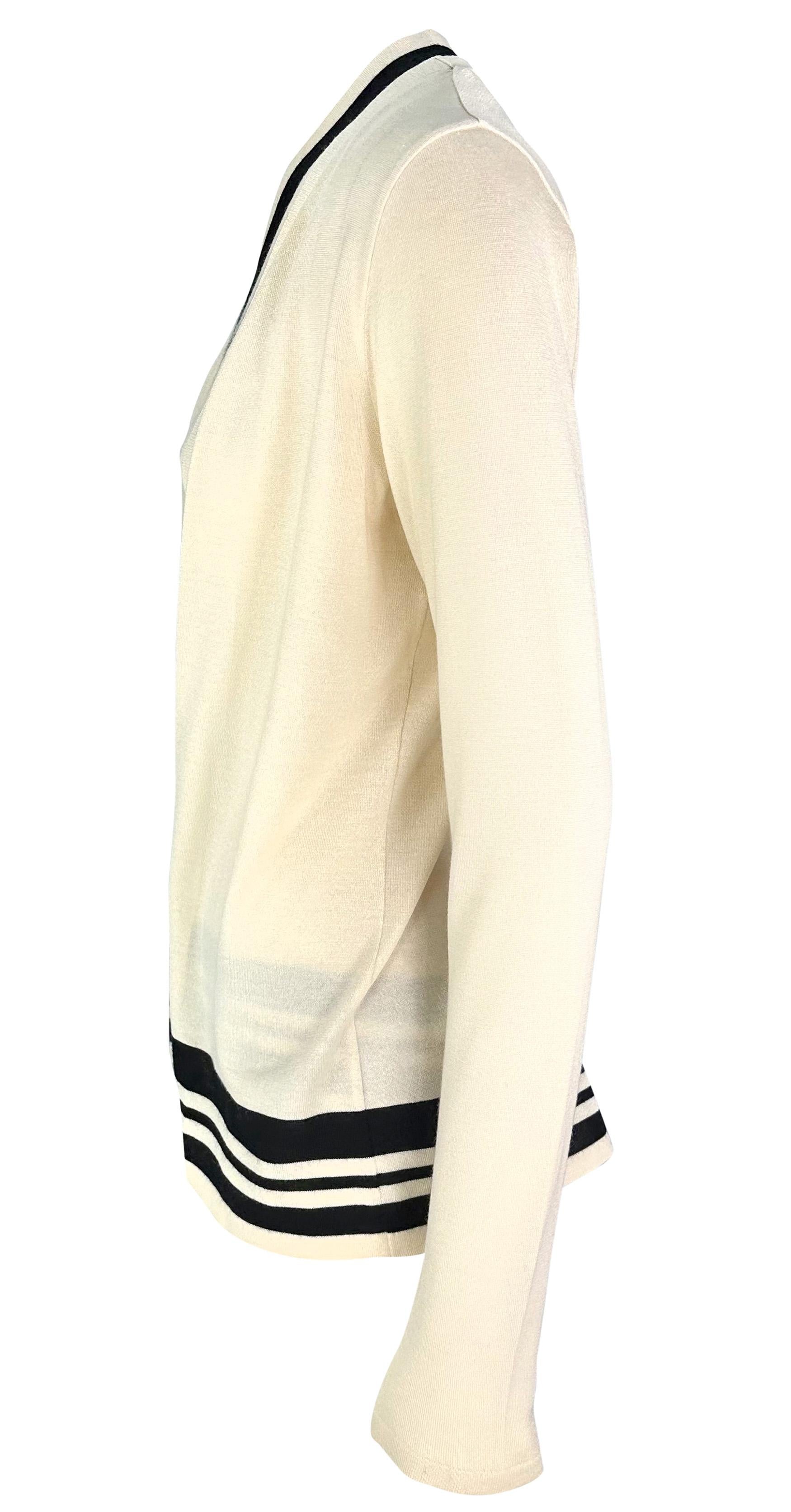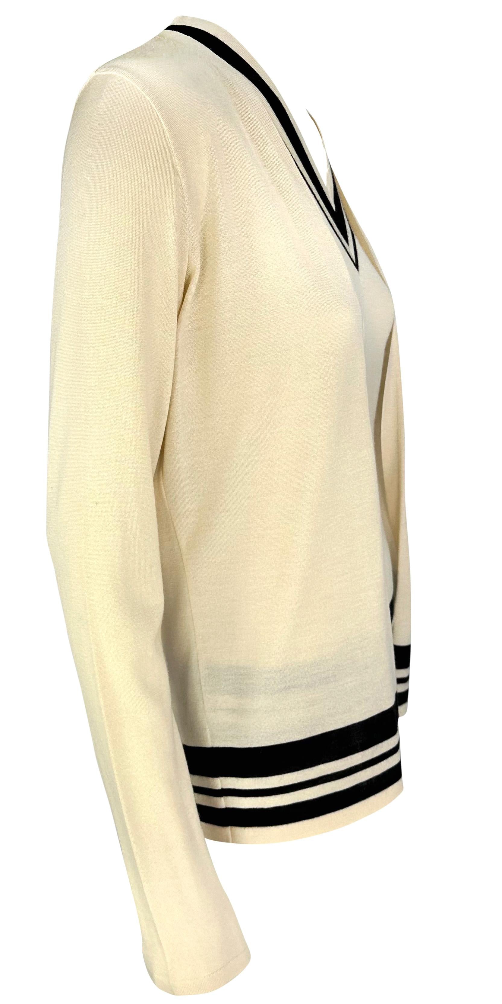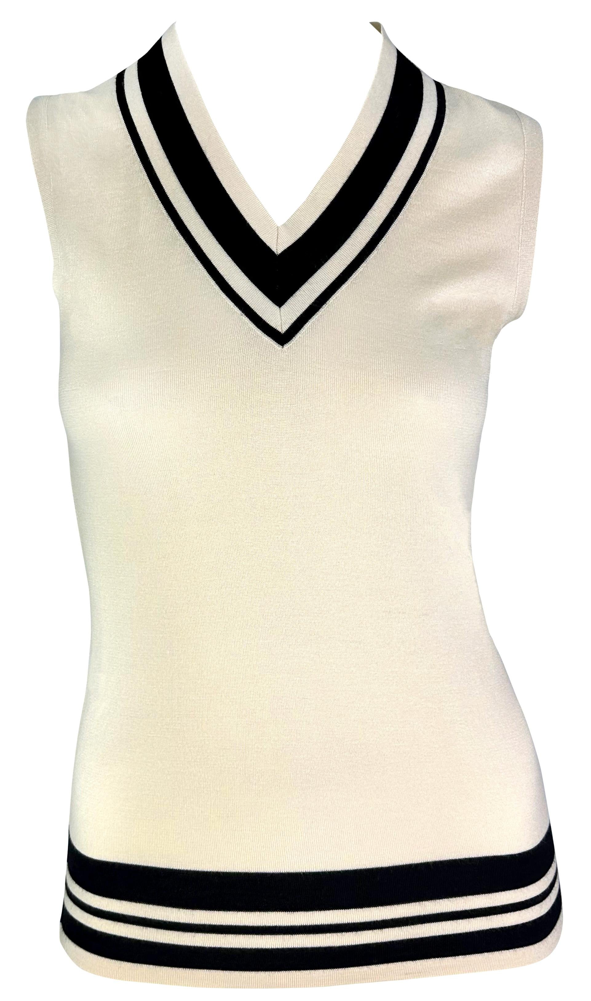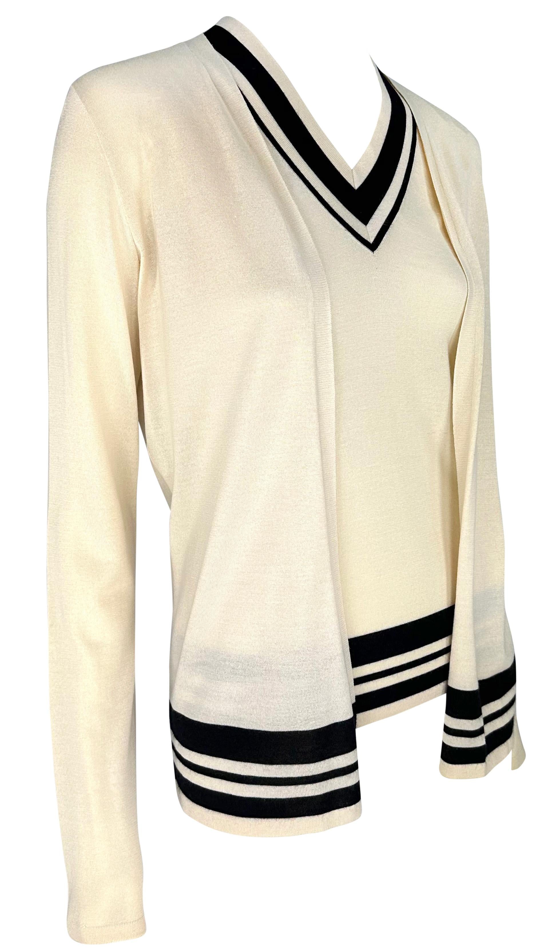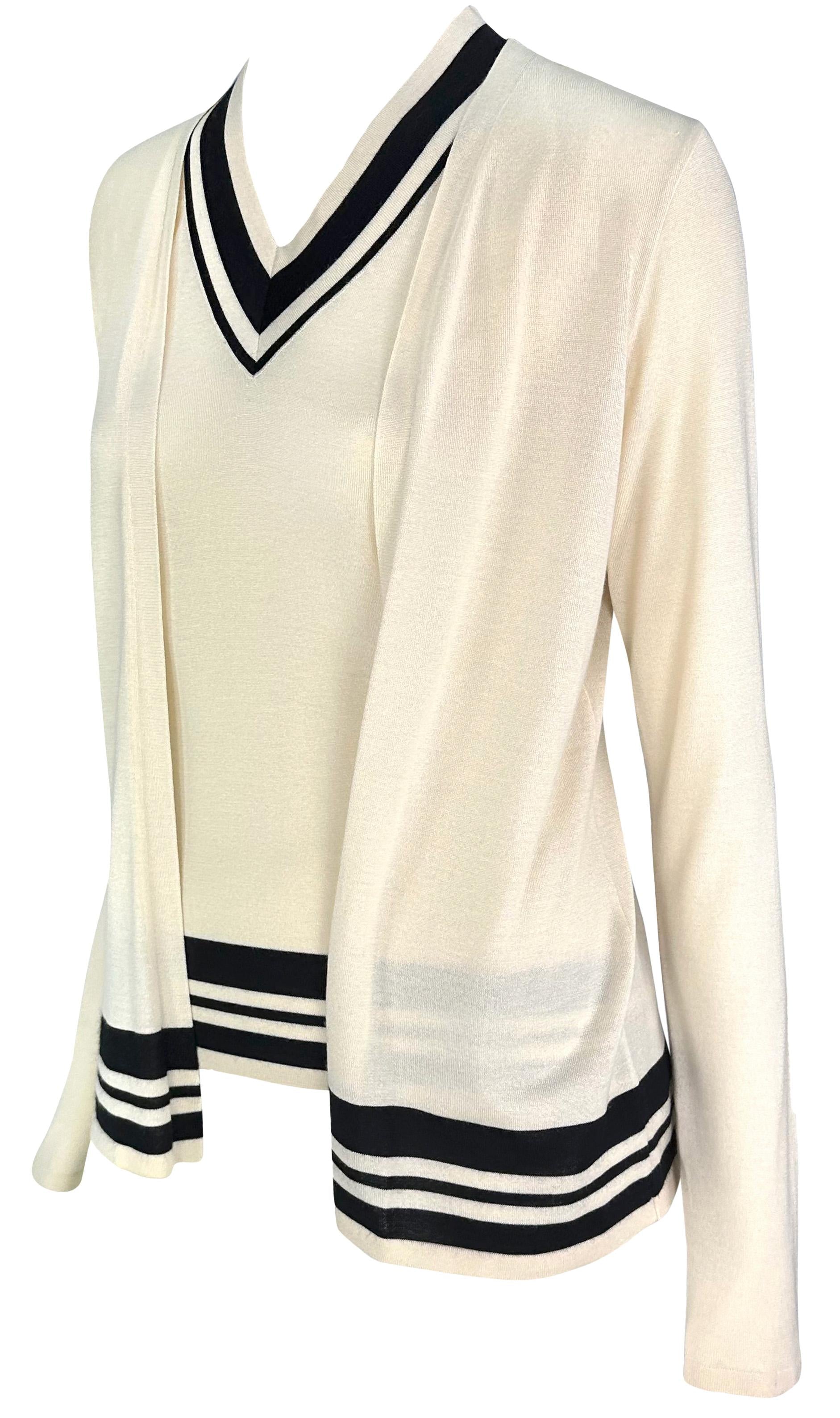 This off-white two-piece sweater set was showcased in Ralph Lauren's Spring/Summer 2001 Purple Label collection. It made its debut on the runway as part of look 26, worn by model Malgosia Bela. The set includes a sweater vest and a matching cardigan, both crafted from a luxurious cashmere blend. The knit sweater vest boasts a v-neckline with stripe details that seamlessly coordinate with the hem of the vest and cardigan. Whether you're going for a casual daytime look or hitting the courts, this versatile set effortlessly fits the bill.