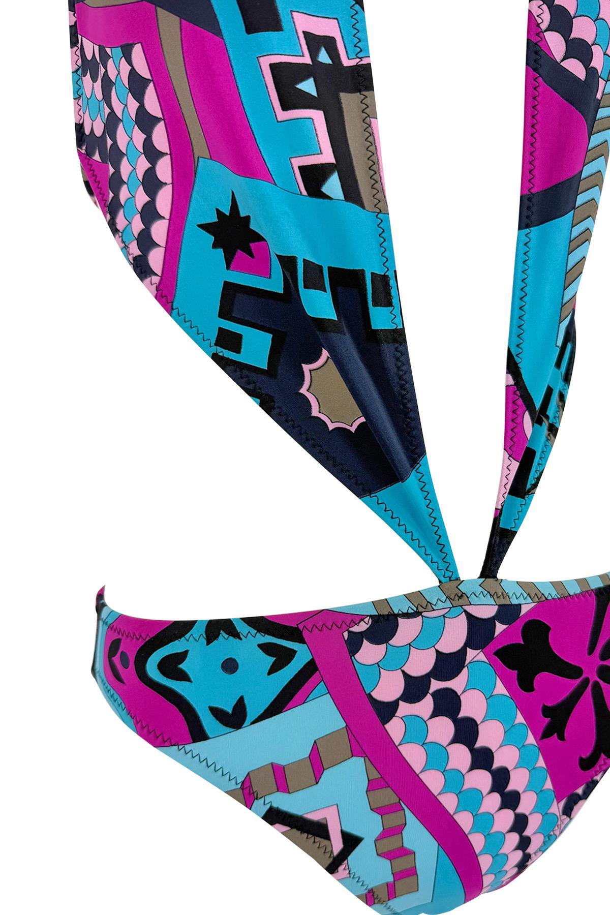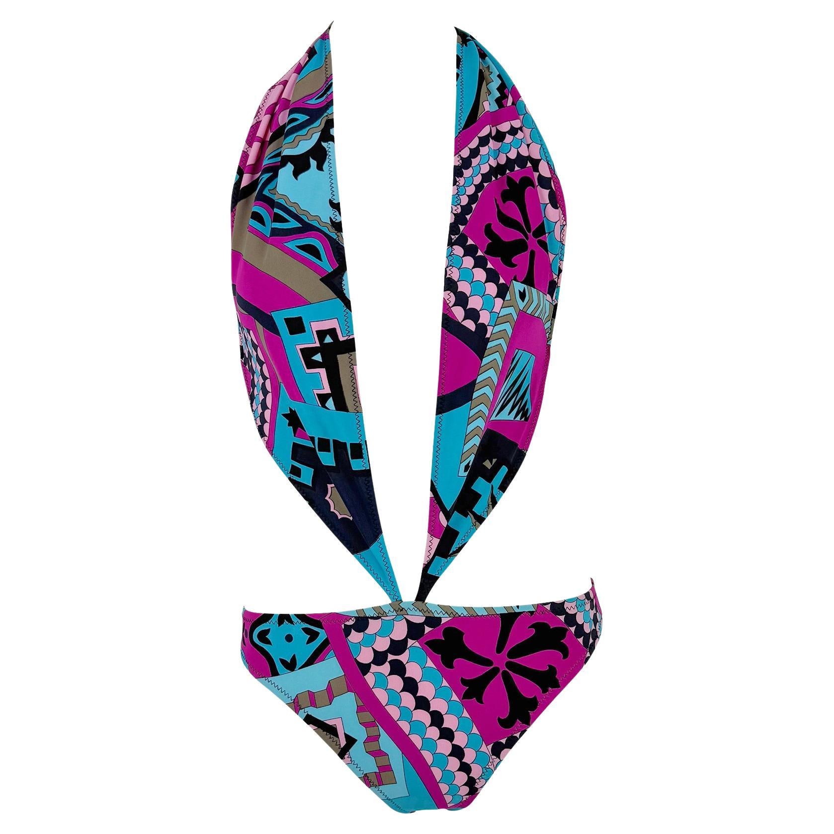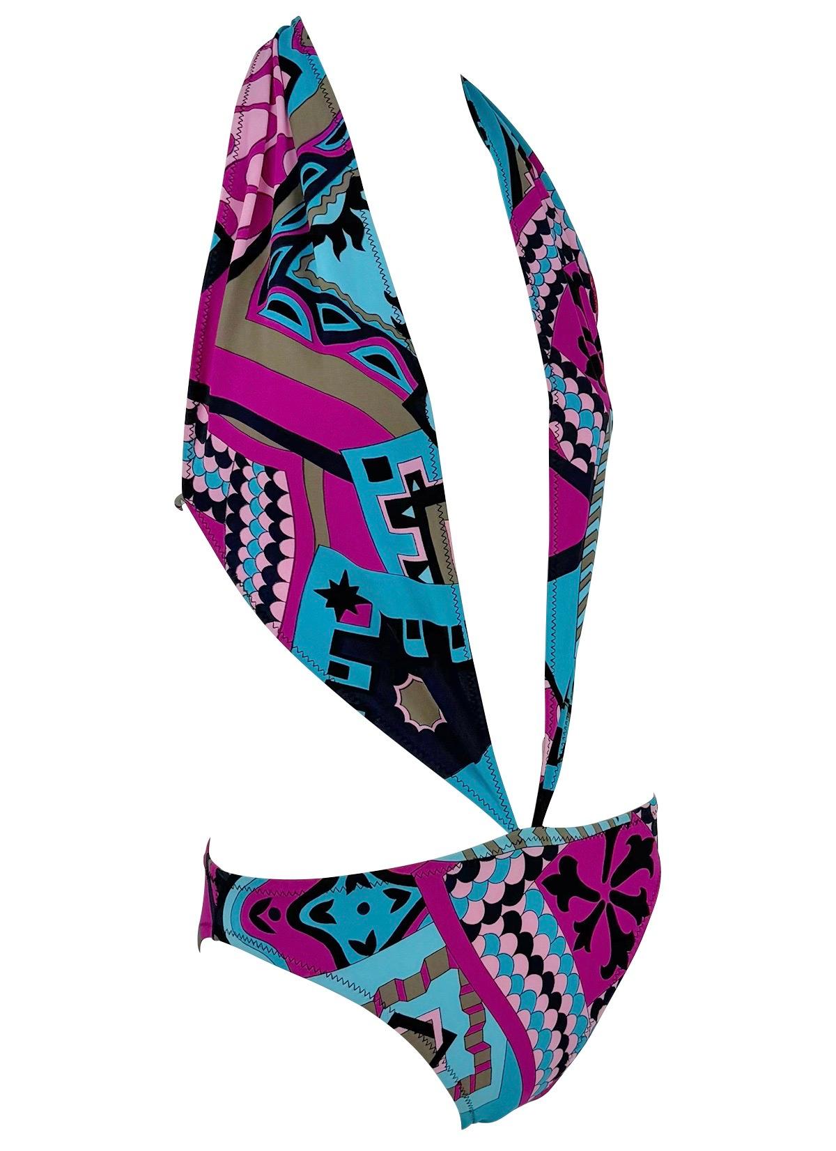 This Yigal Azrouël one-piece swimsuit from the Spring/Summer 2001 collection features a plunging halter neckline and bold 1960's-inspired graphic print in shades of pink, blue, and black. As seen on the season's runway, the daring silhouette ties at the neck and back, with a deep open front.