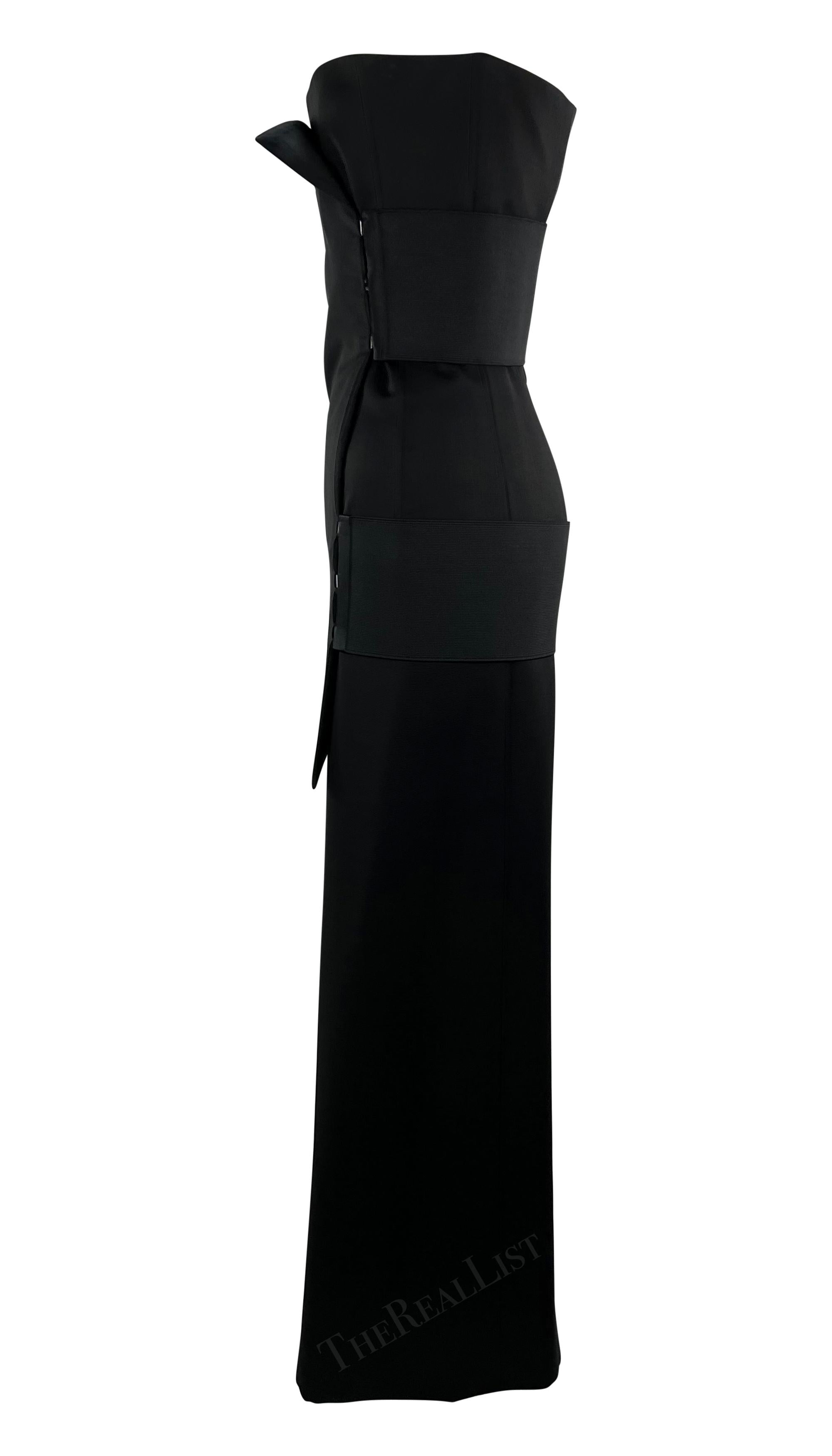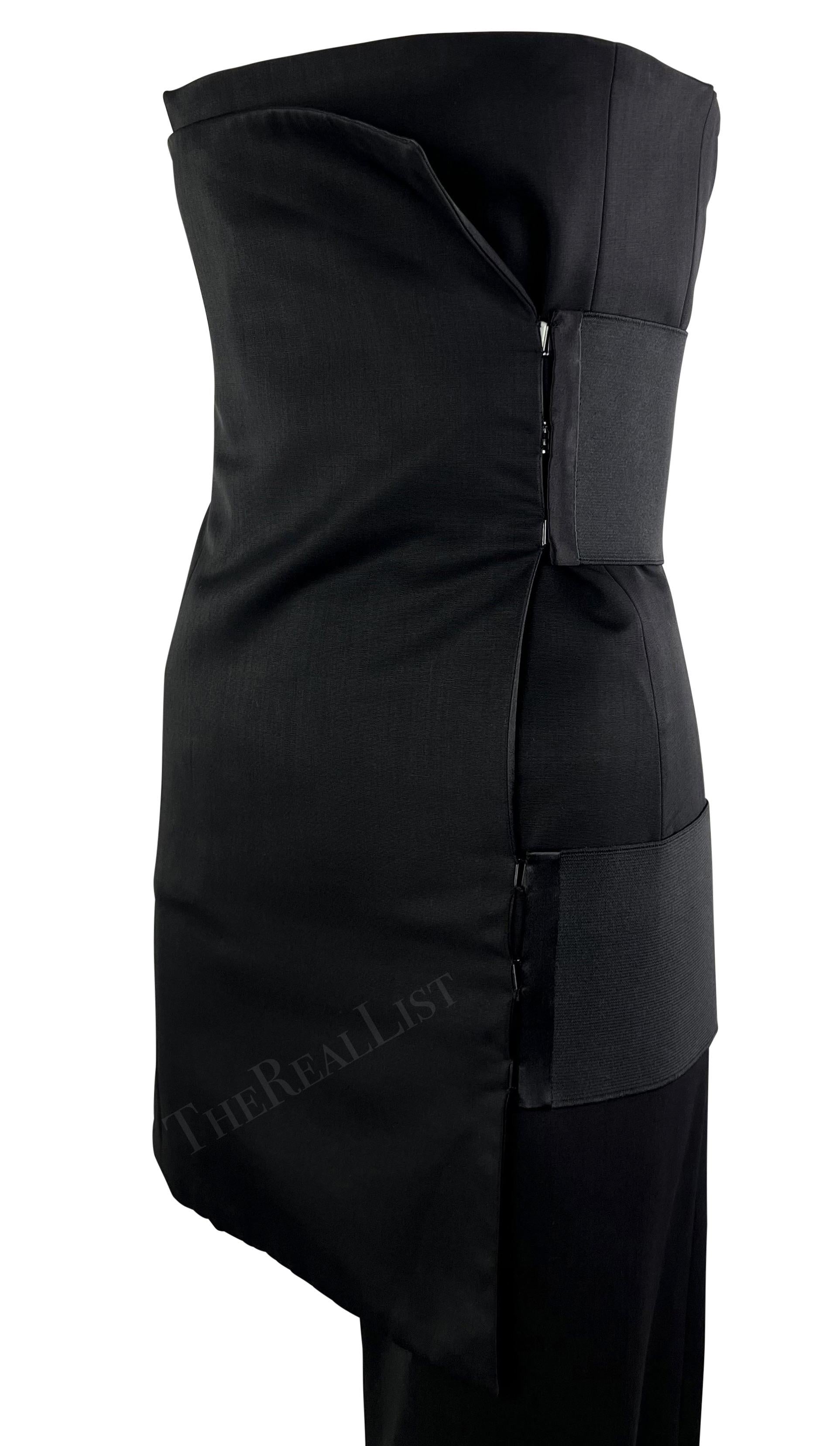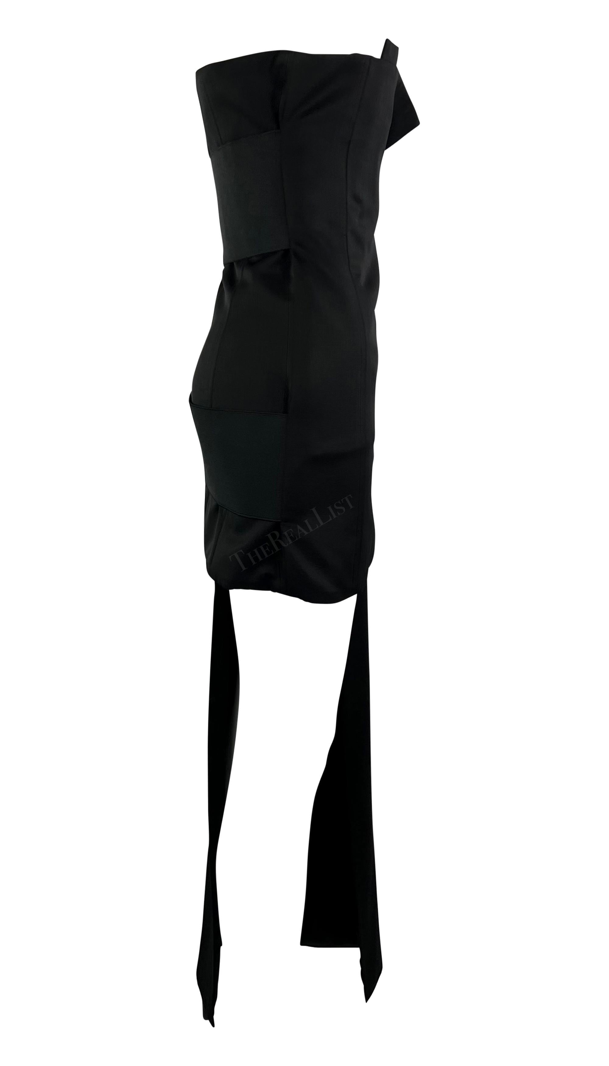 This sleek black Yves Saint Laurent mini dress, designed by Tom Ford for the Spring/Summer 2001 collection, debuted as look 36 on the runway. The asymmetric bandage dress is made with two wide elastic bands that wrap around the body for a perfect fit, and it features a dropped hem on one side.