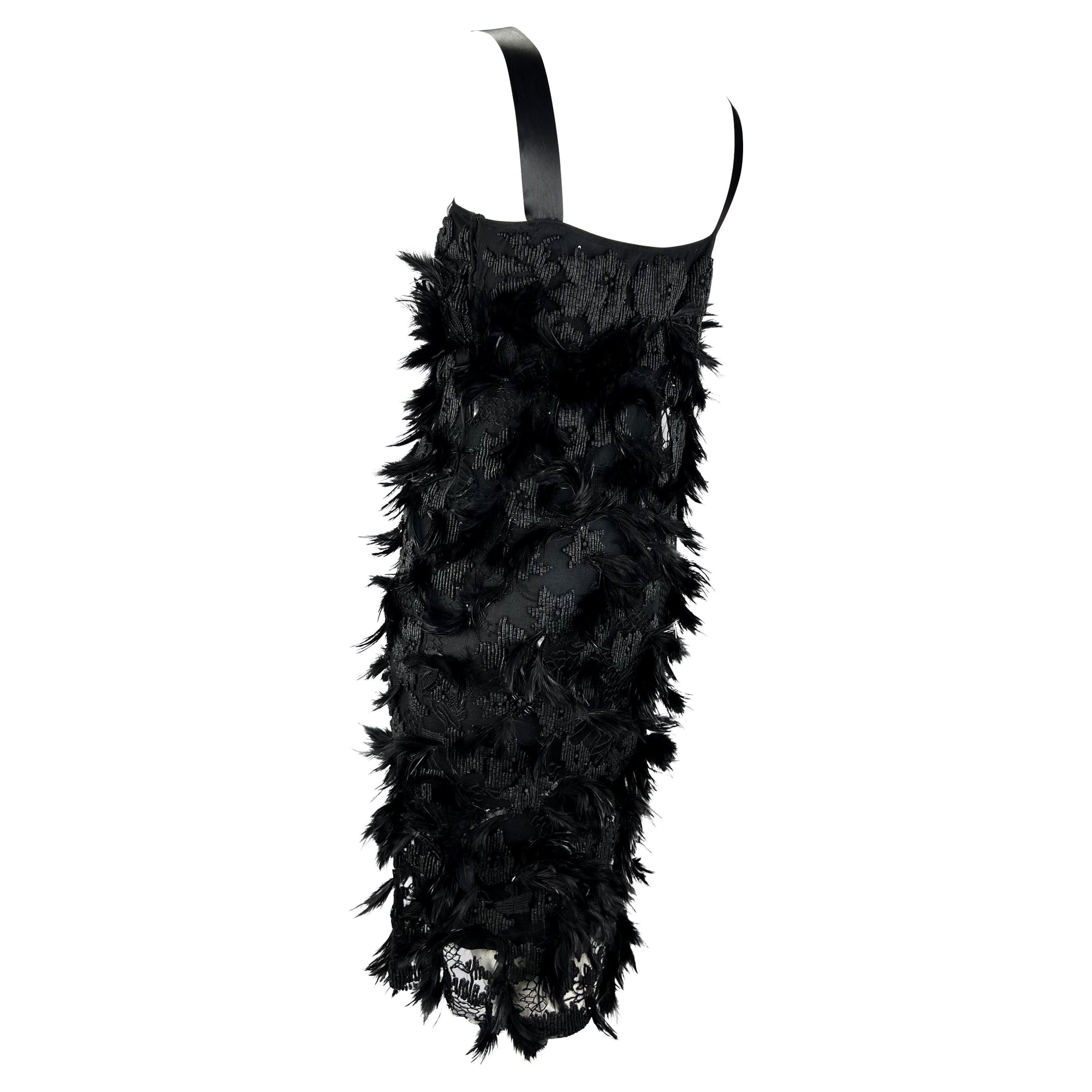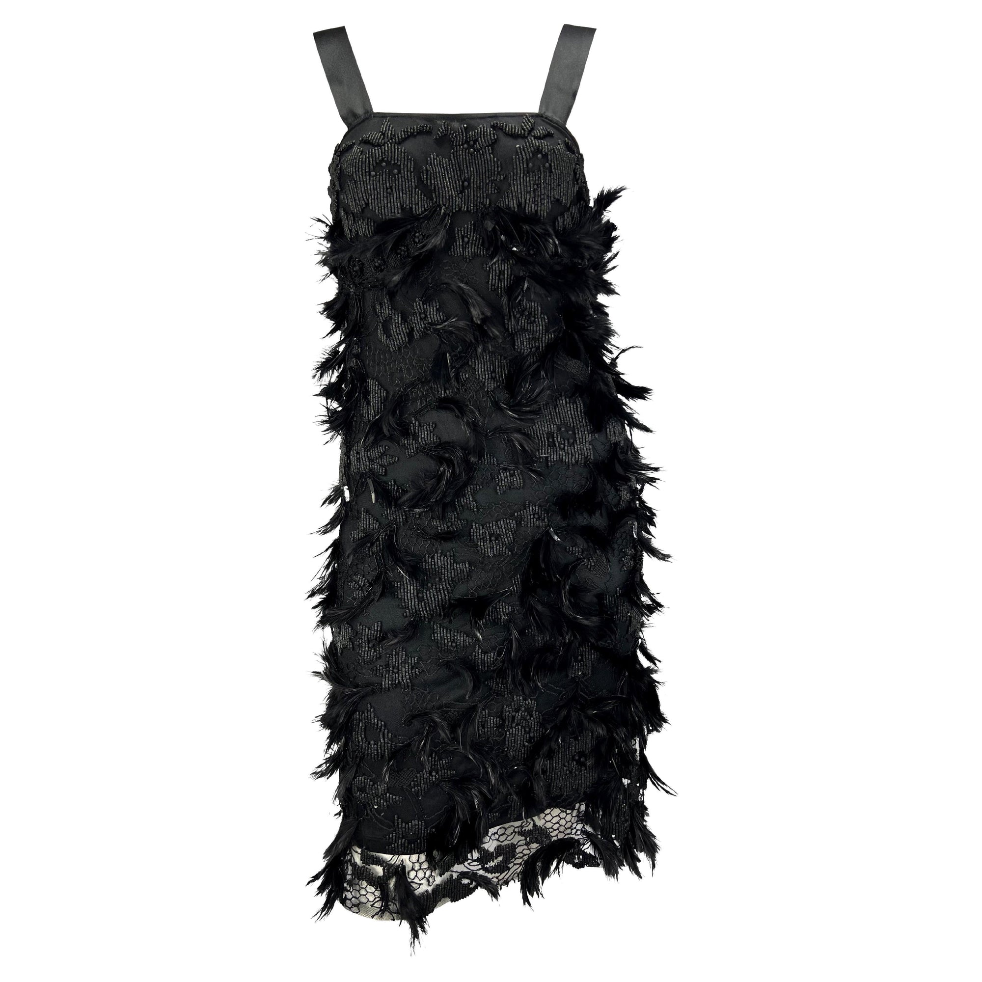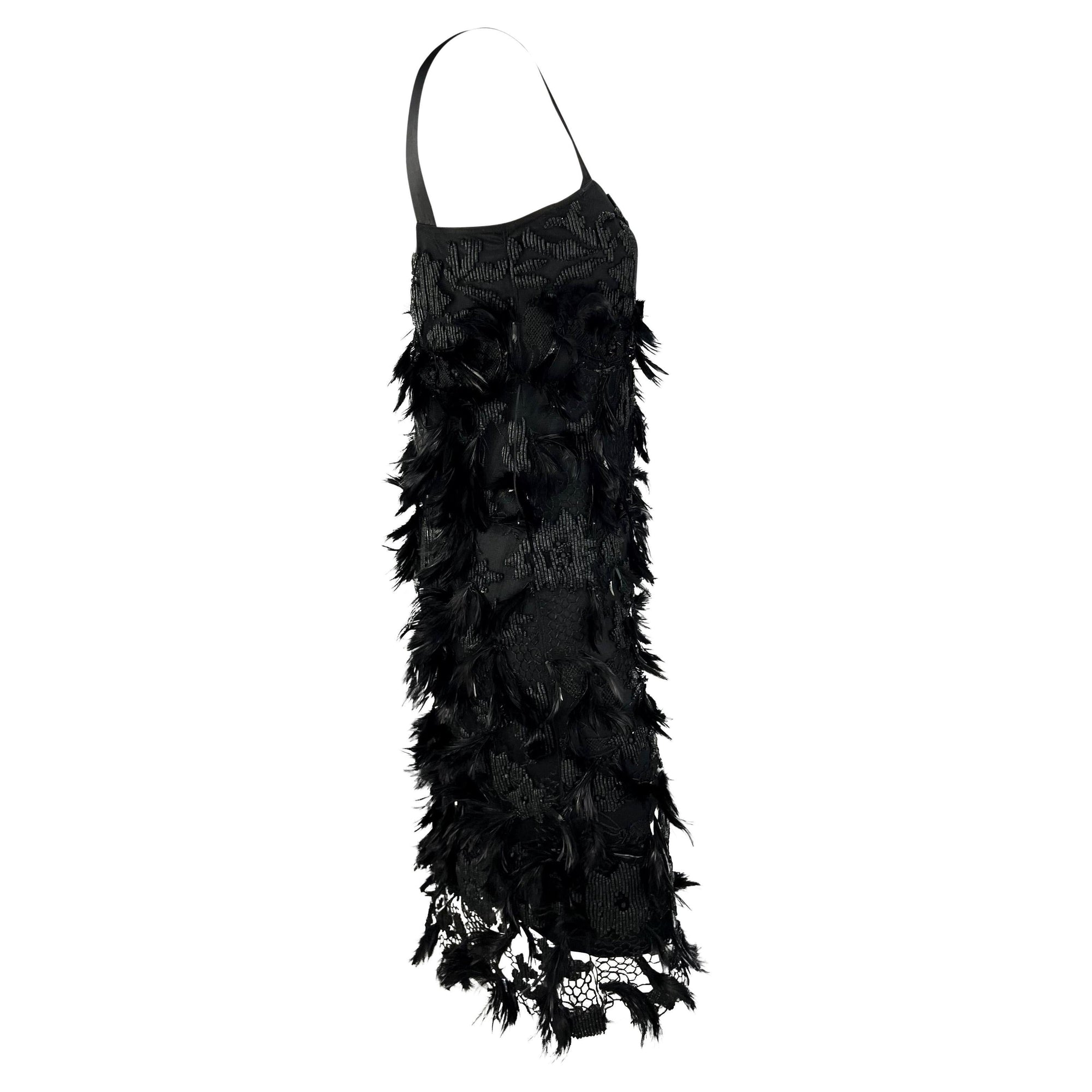 Presenting an absolutely incredible black beaded and feathered Yves Saint Laurent Rive Gauche dress, designed by Tom Ford. From Ford's inaugural collection with YSL, this dress debuted on the Spring/Summer 2001 runway as look 41 modeled by Zoe Hawkins. This flapper-influenced dress is covered in patterned hand-sewn beading and feathers made complete with a square neckline and silk satin straps. Most definitely not your average little black dress, stand out with this intricate YSL number!