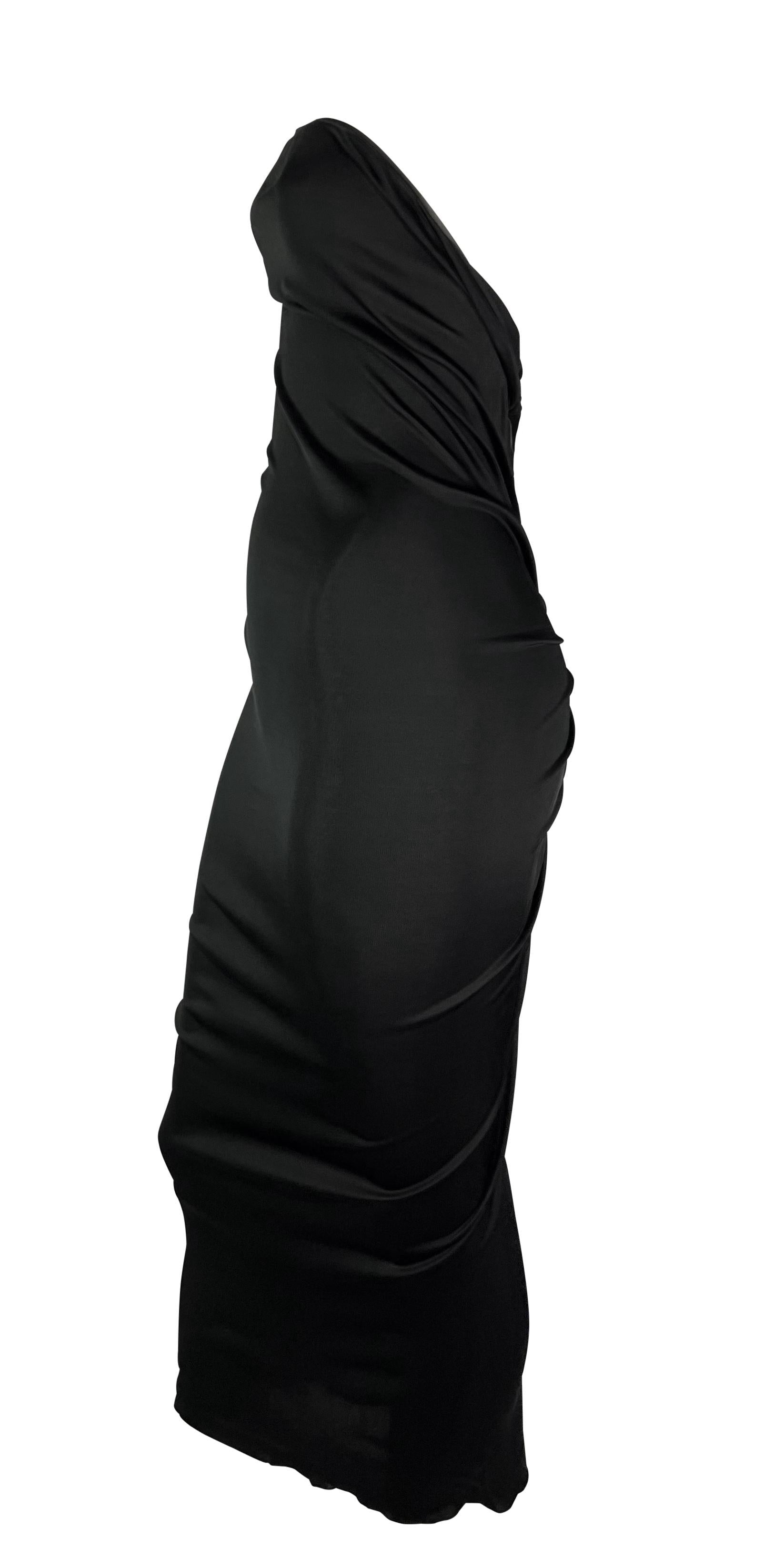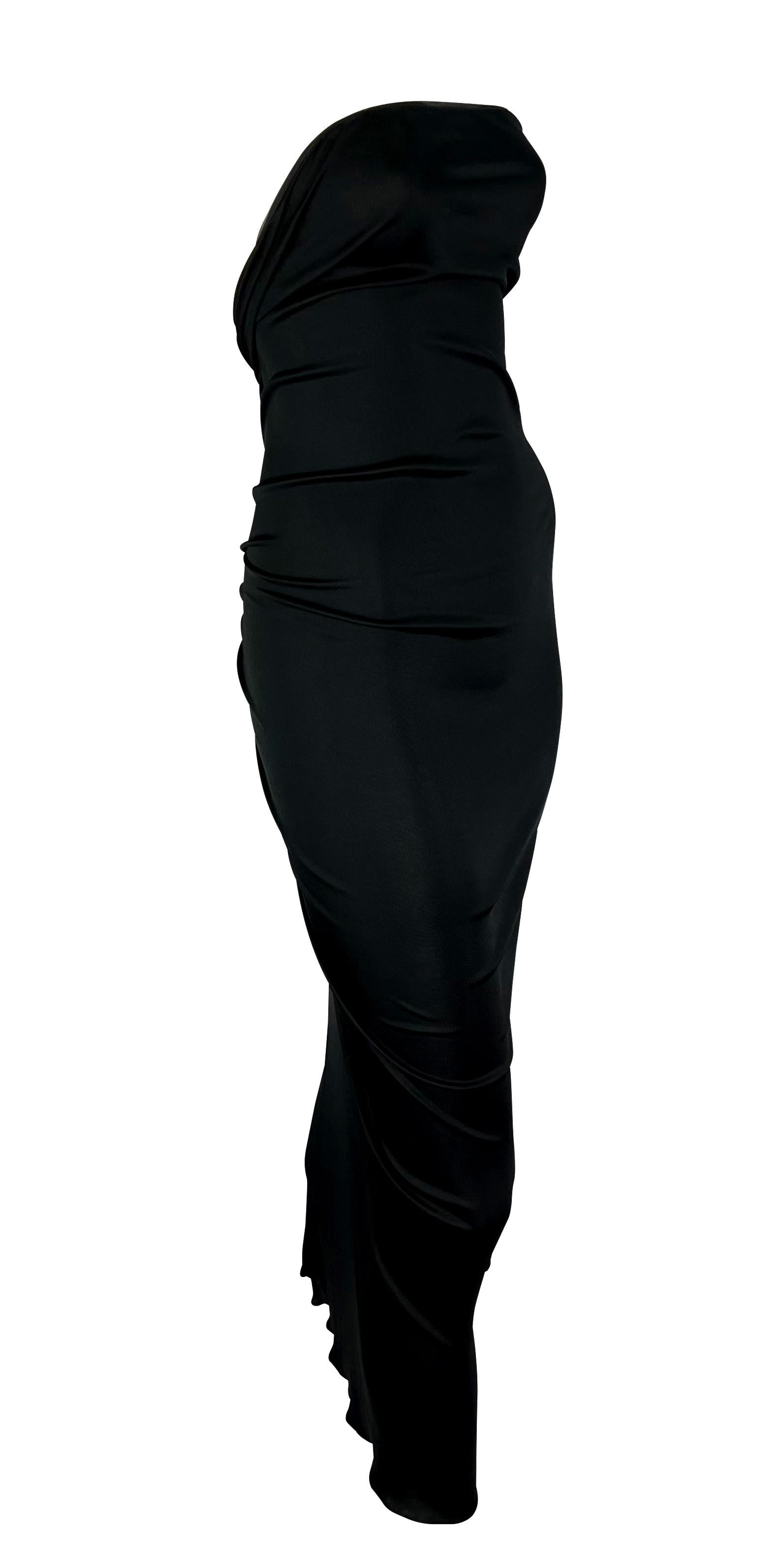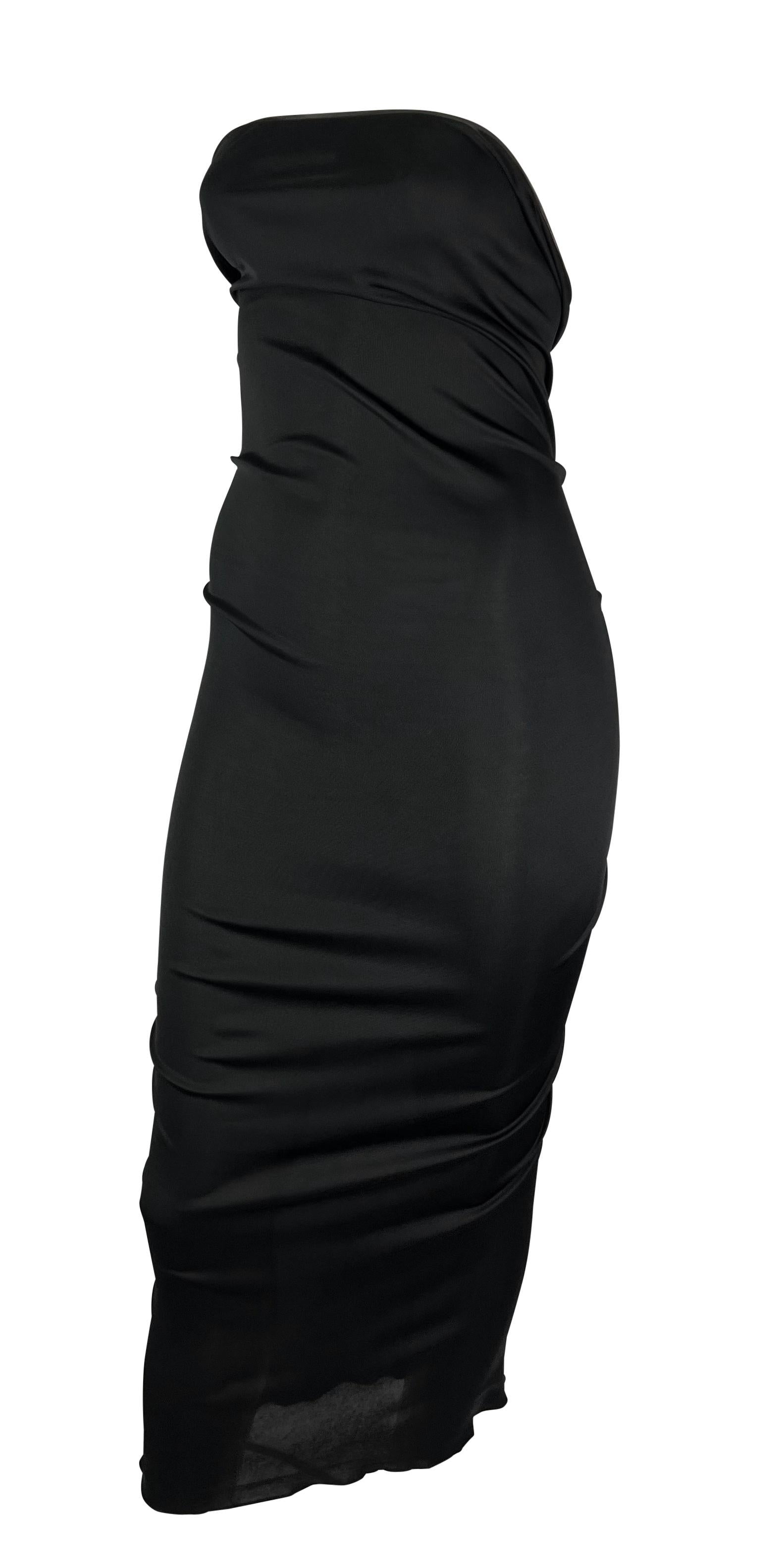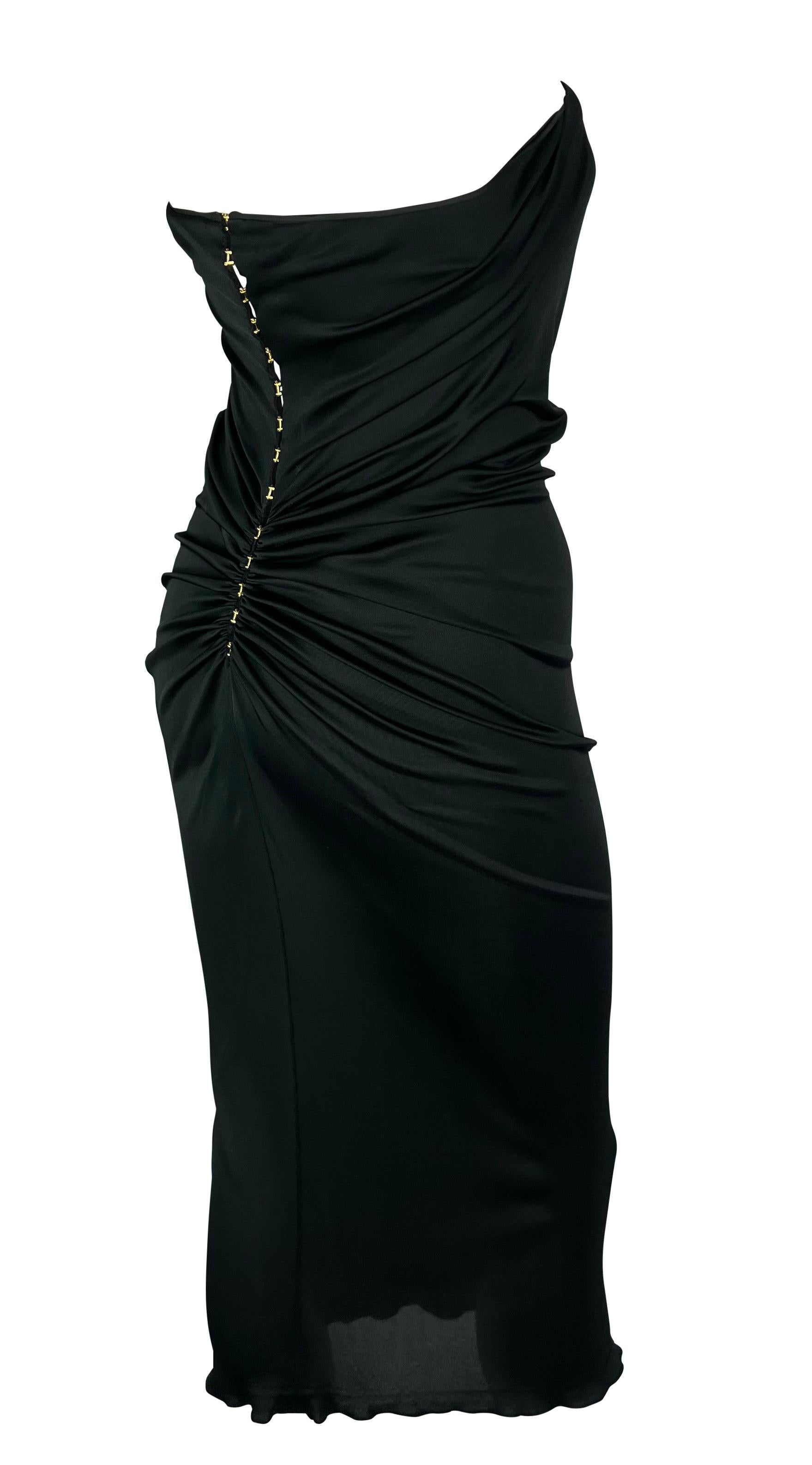 This black strapless Yves Saint Laurent dress, designed by Tom Ford for the Spring/Summer 2001 collection, features a series of gold-tone hook closures at the back, creating a gentle ruching effect that dissipates at the front. This midi-length dress is luxuriously minimalist and effortlessly sexy.