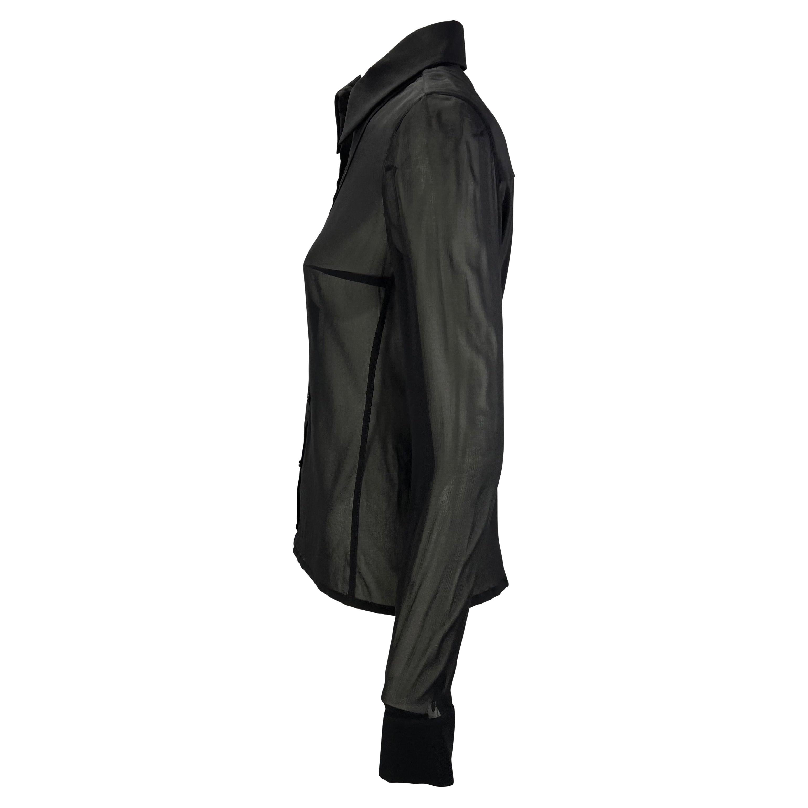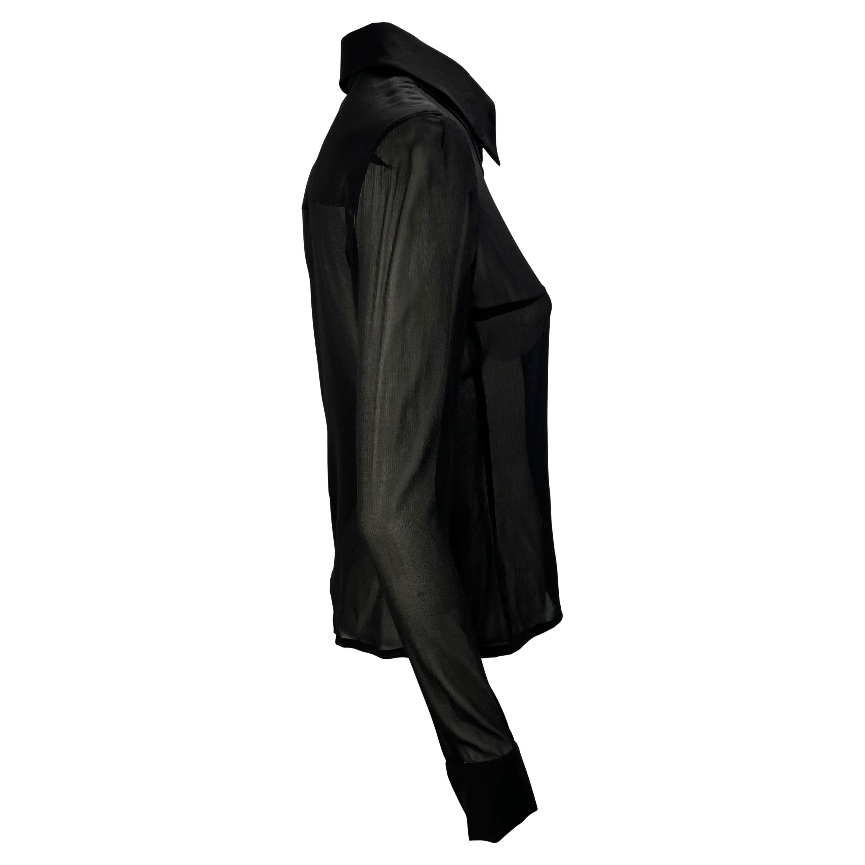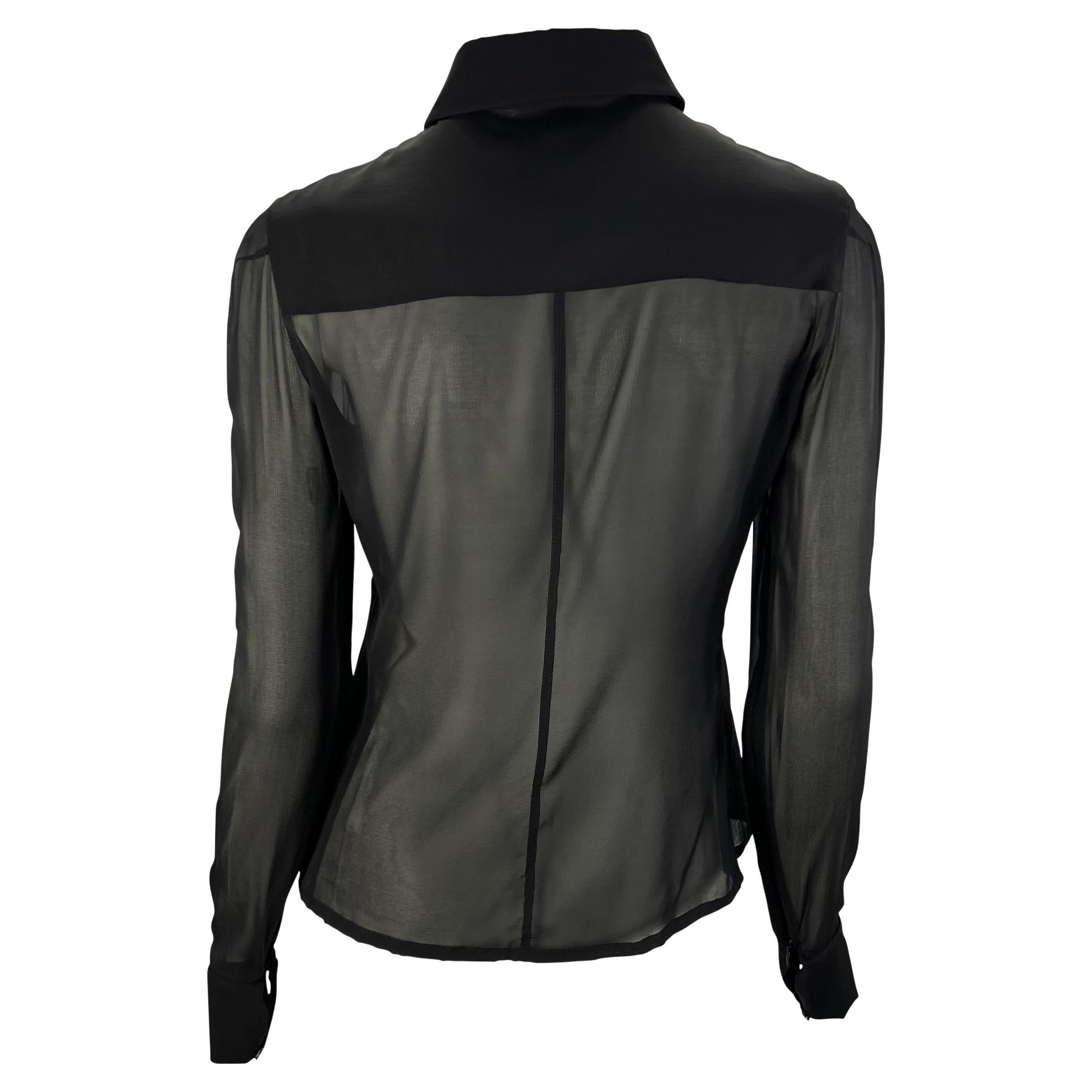 Presenting a sheer black button-up Yves Saint Laurent Rive Gauche top, designed by Tom Ford. From the Spring/Summer 2001 collection, this fabulous top is nearly entirely sheer aside from the collar and a small patch underneath as well as the cuffs. This fabulous shirt is made complete with zippers that run from the underarm to the cuff and are the perfect elevated touch.