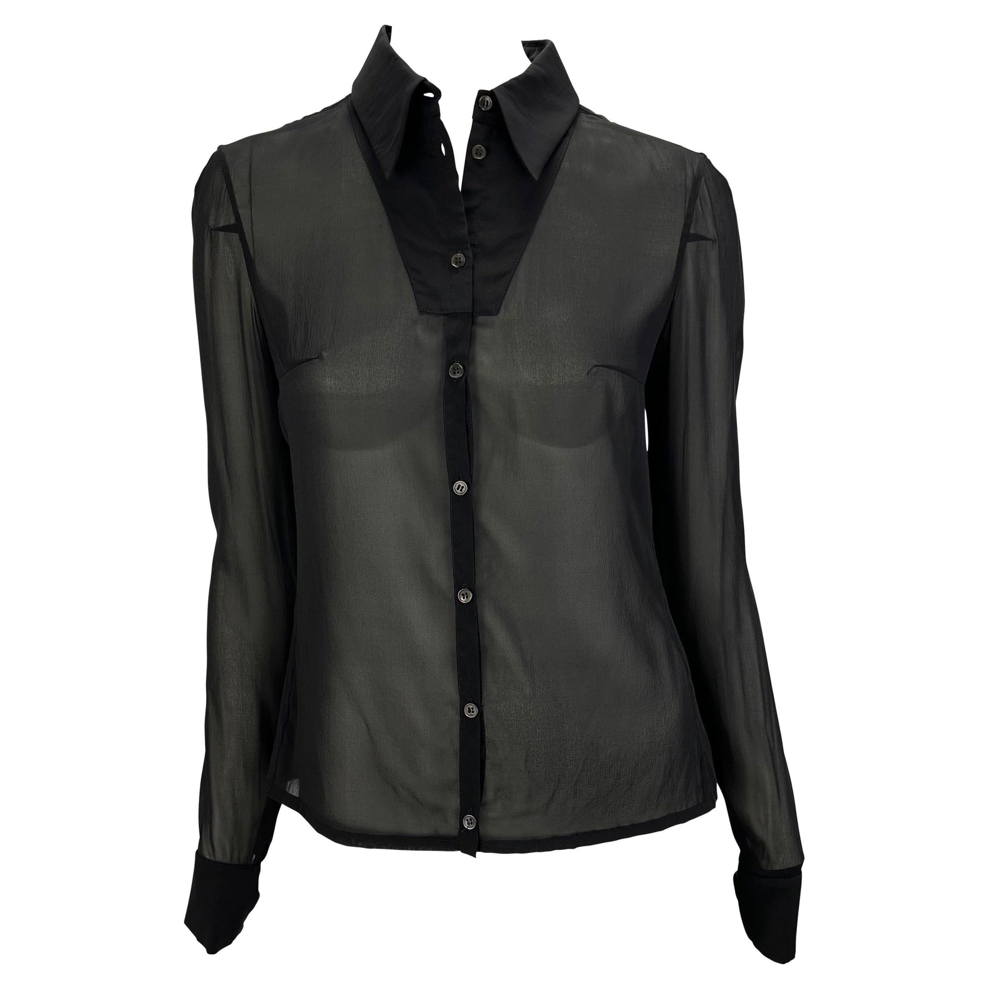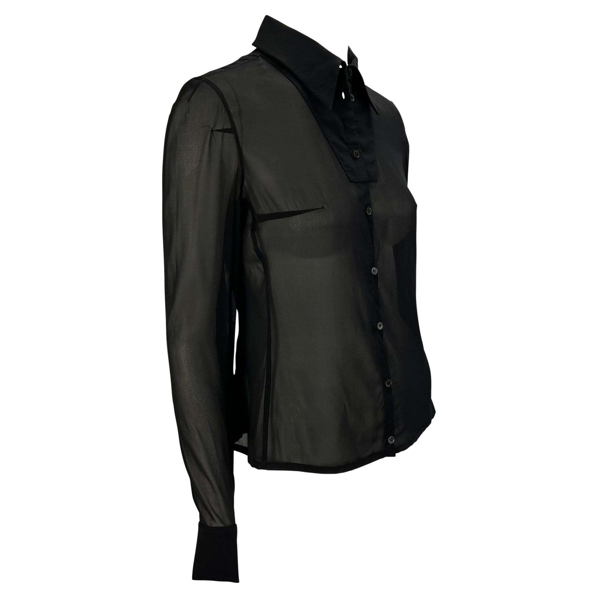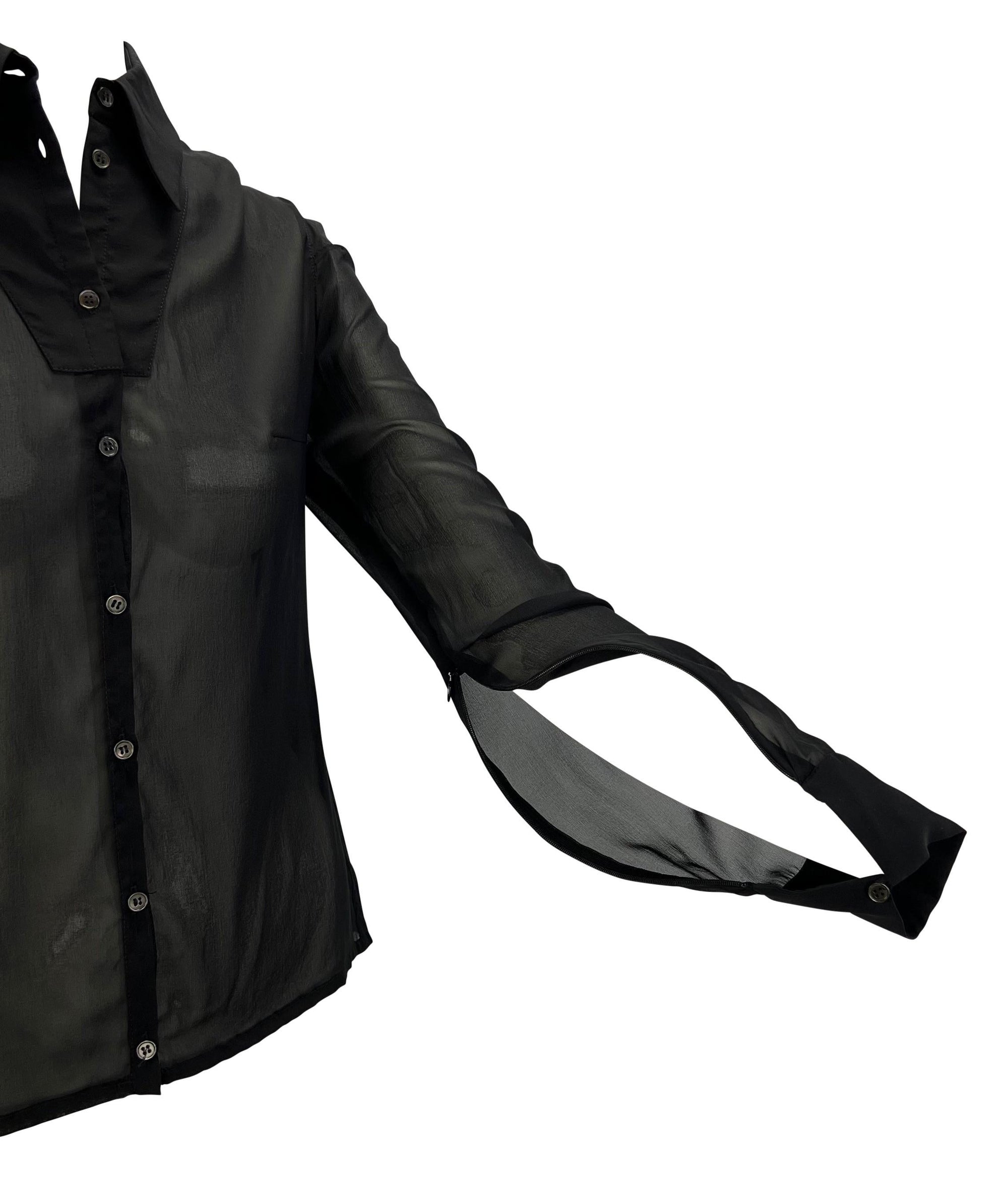 Presenting a sheer black button-up Yves Saint Laurent Rive Gauche top, designed by Tom Ford. From the Spring/Summer 2001 collection, this fabulous top is nearly entirely sheer aside from the collar and a small patch underneath as well as the cuffs. This fabulous shirt is made complete with zippers that run from the underarm to the cuff and are the perfect elevated touch.
