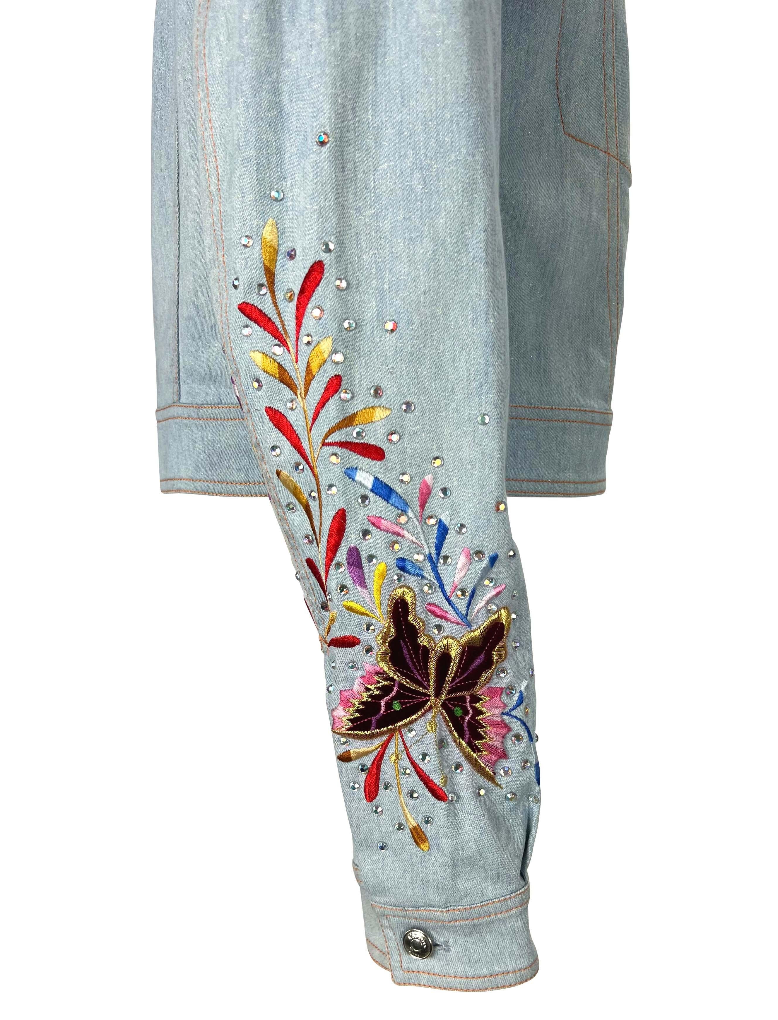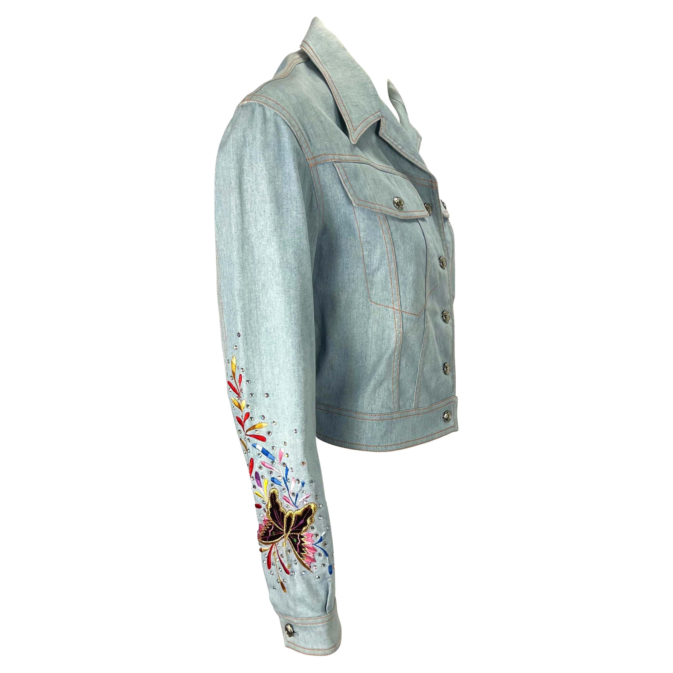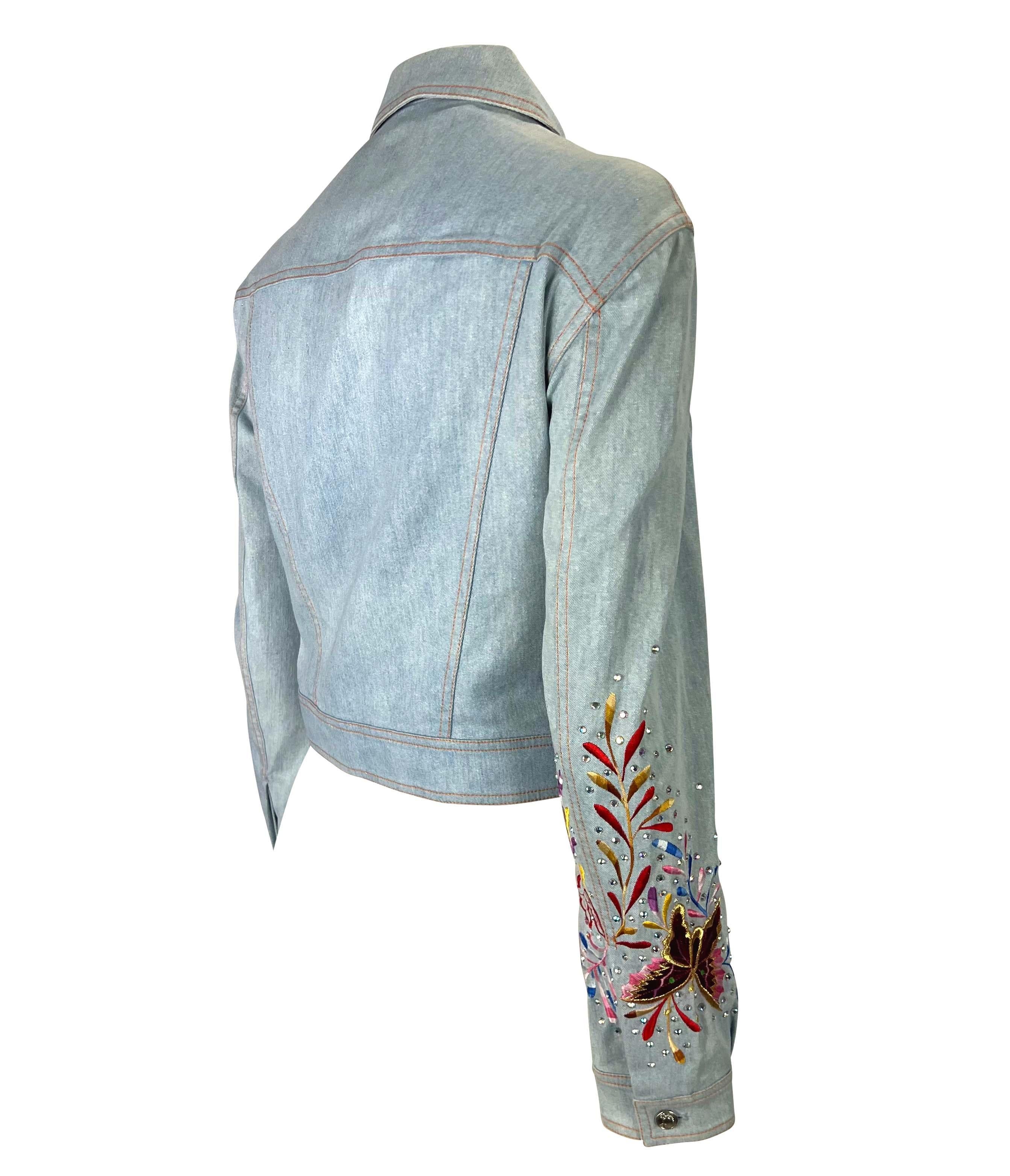 Presenting a light wash embroidered Christian Dior Boutique metallic denim jacket, designed by John Galliano. From the Spring/Summer 2002 collection, this fabulous collared jacket features branded silver-tone buttons at the front closure, front pockets, and cuffs. This jacket is made complete with rhinestones and a multicolor embroidered butterfly pattern on the right sleeve. John Galliano himself wore a suit covered in the same butterfly pattern to the Mat Gala in 2001. Add this perfectly Y2K Galliano for Dior piece to your wardrobe or collection!